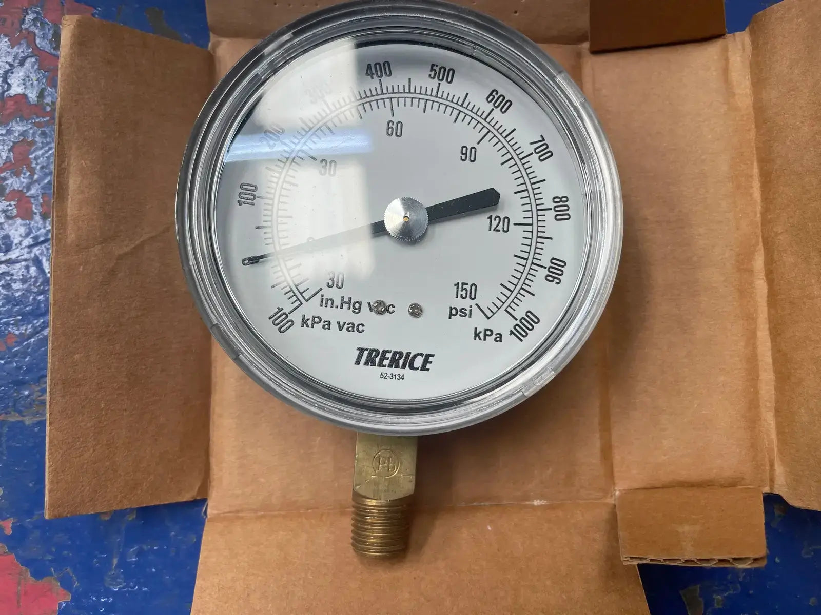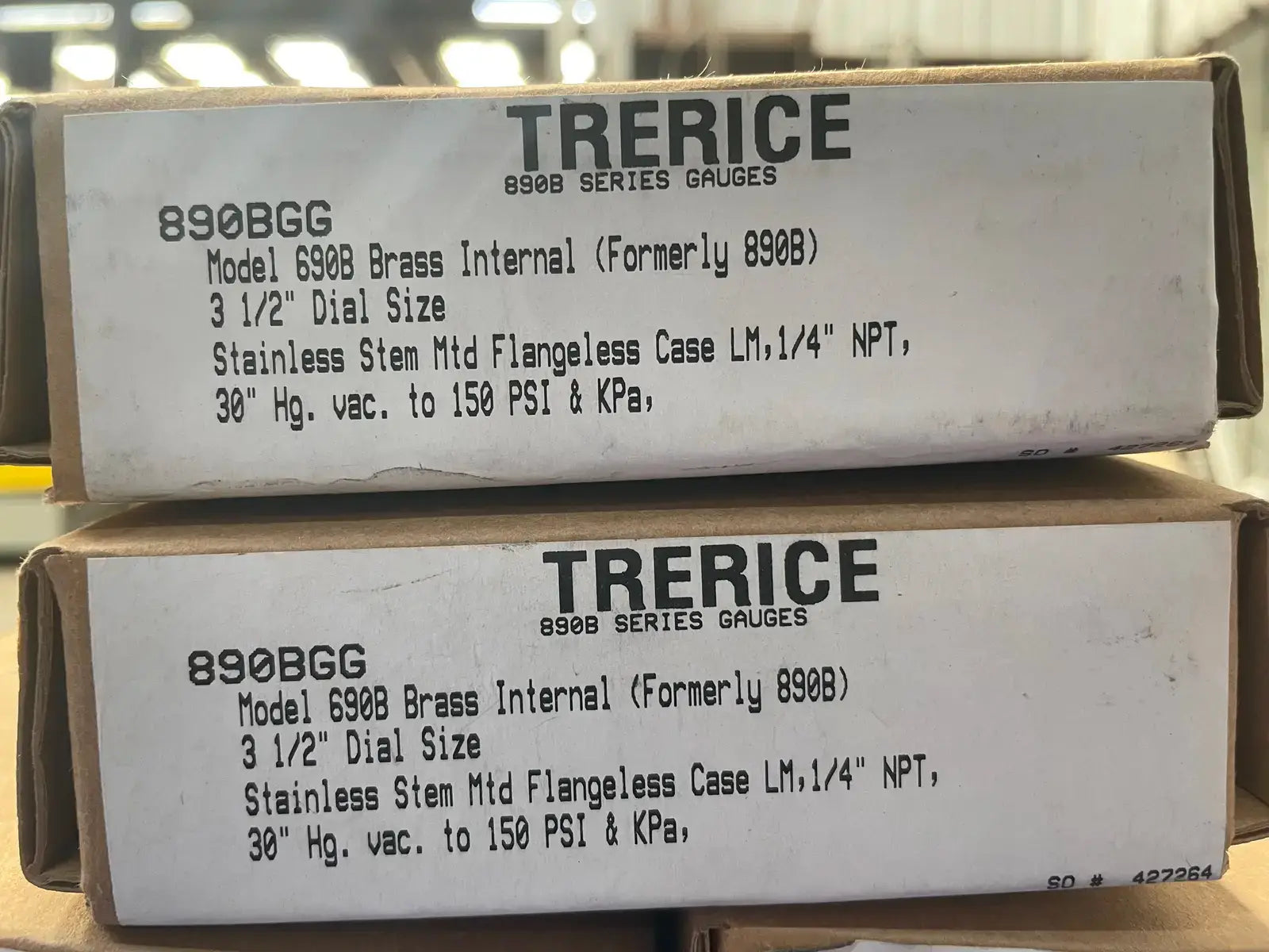 Trerice 690 Commercial Pressure Gauge. Model: 690B Brass Internal. Size: 3-1/2 in Dial Size. Stainless Stem Mtd Flangeless Case LM, 1/4" NPT. Pressure Rating: 150 PSI & KPA.