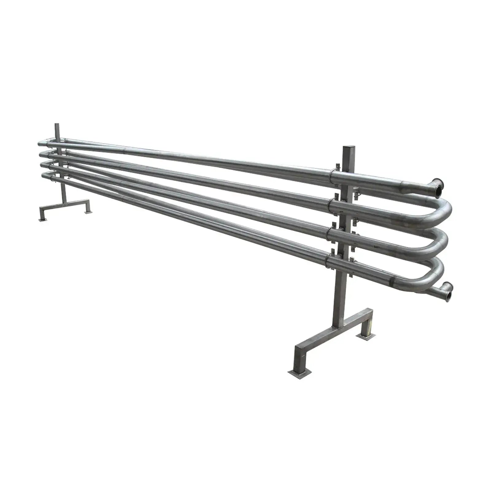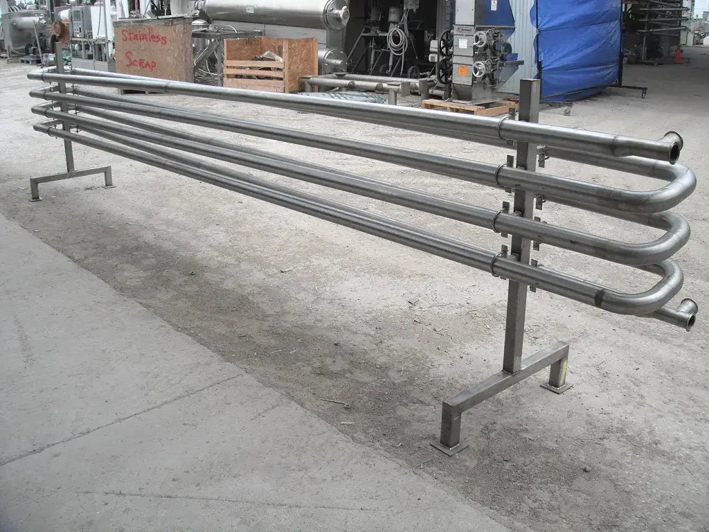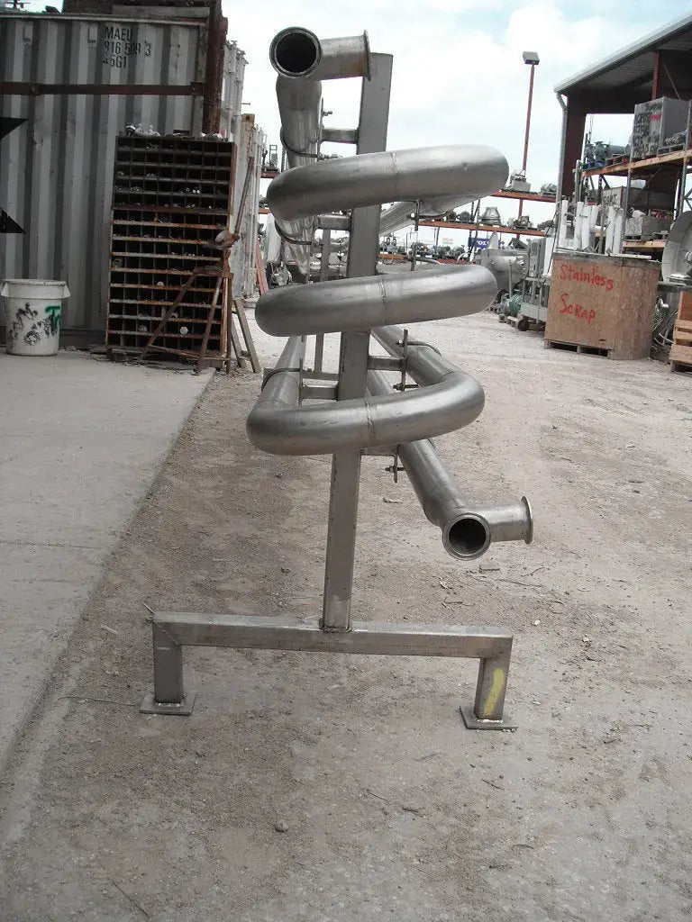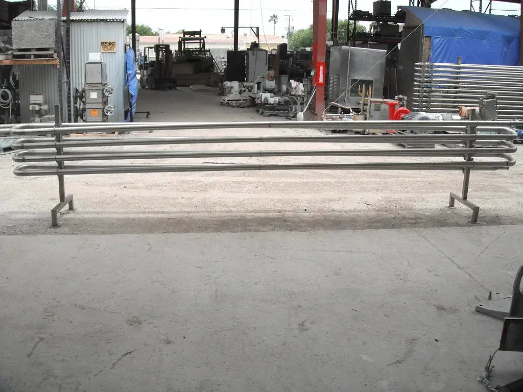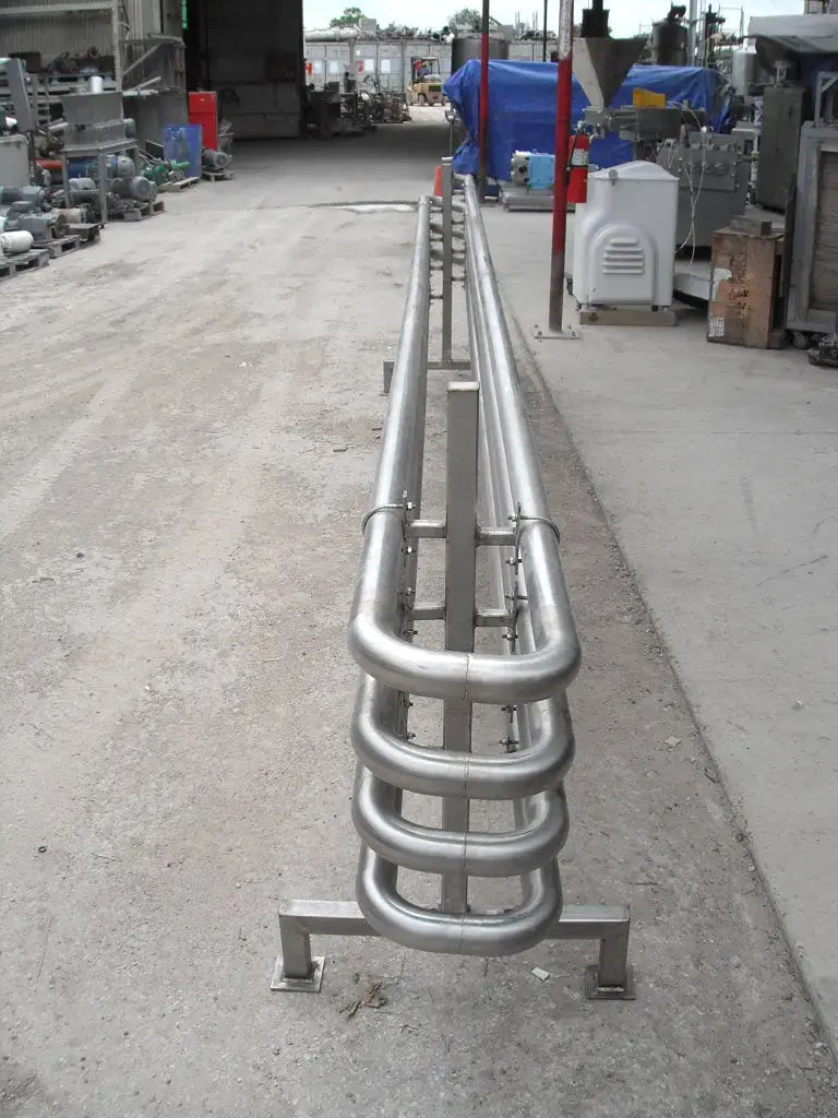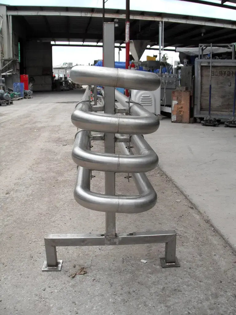 Tubo de sujeción de acero inoxidable: 2-1/2 pulgadas. El tubo se reduce a 2 pulgadas en los extremos. 4 bucles completos/ 8 pasadas. Entradas/Salidas: (4) Accesorios S-Line de 2 pulgadas. (8) Longitud del tubo recto: 17 pies 6 pulgadas (7) Longitud de las curvas en U: 1 pie 10 pulgadas Longitud total del tubo: 152 pies 10 pulgadas Dimensiones totales: 18 pies 8 pulgadas L x 2 pies 6 pulgadas de ancho x 4 pies 1 pulgadas de alto.