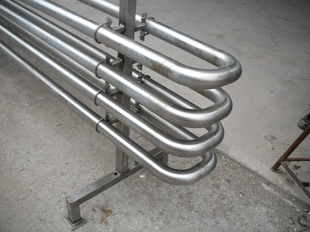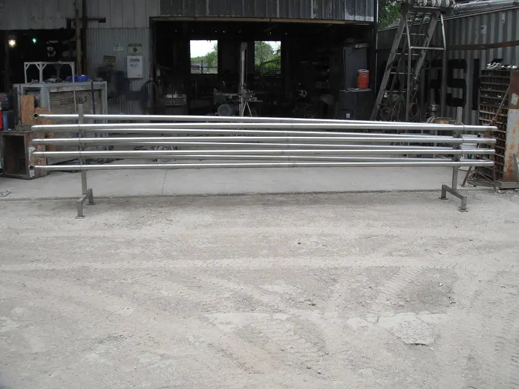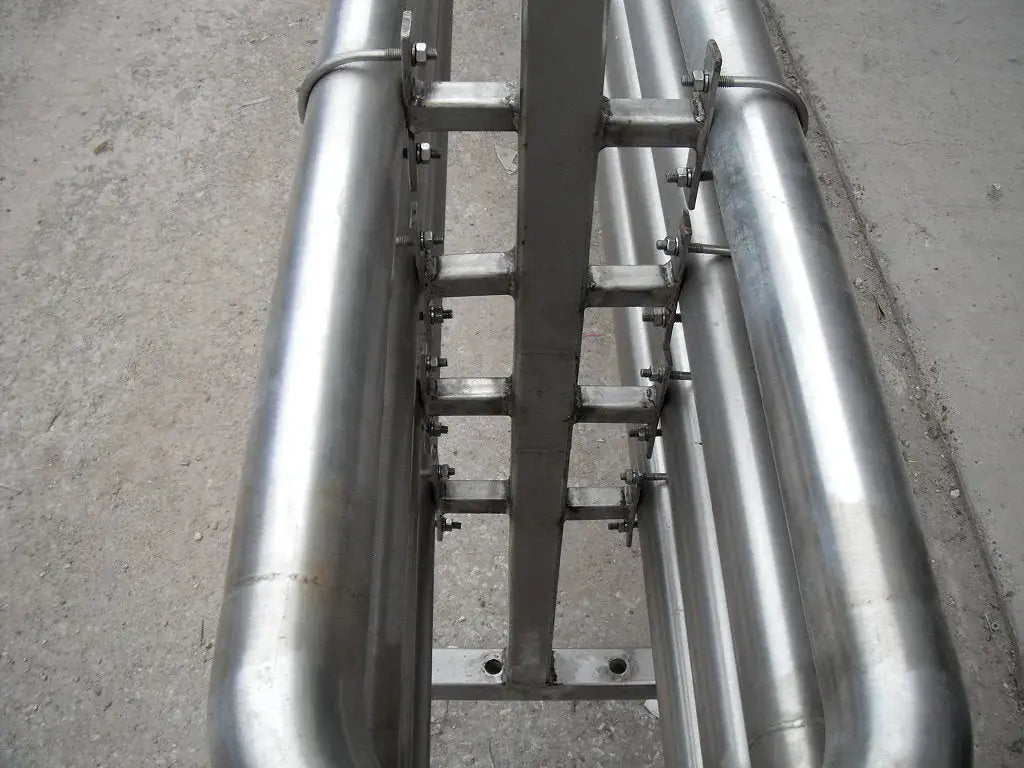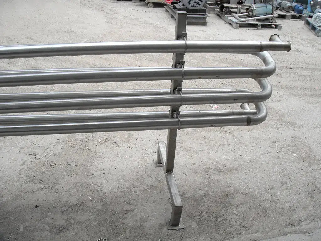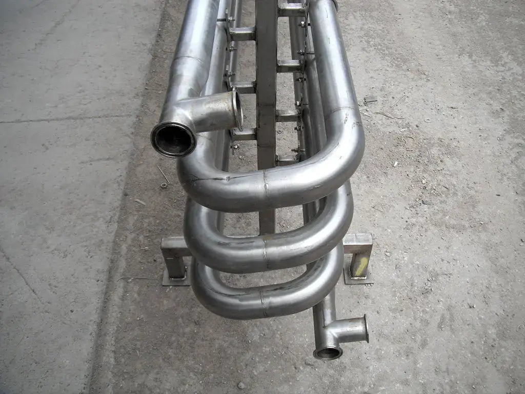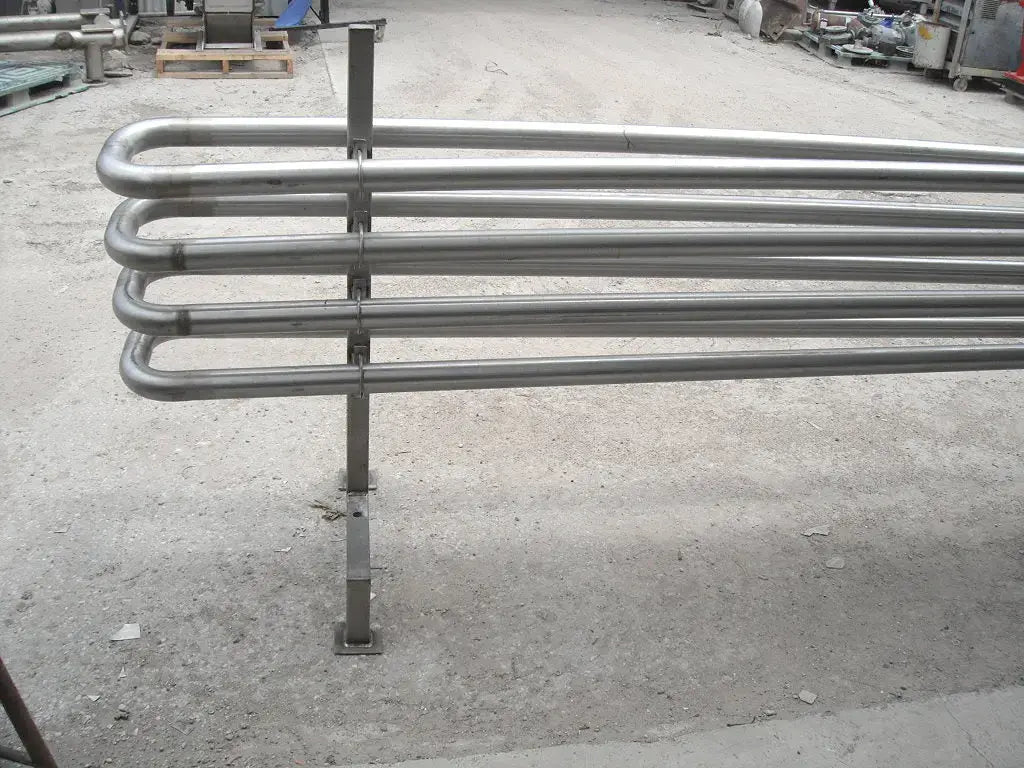 Tubo de sujeción de acero inoxidable: 2-1/2 pulgadas. El tubo se reduce a 2 pulgadas en los extremos. 4 bucles completos/ 8 pasadas. Entradas/Salidas: (4) Accesorios S-Line de 2 pulgadas. (8) Longitud del tubo recto: 17 pies 6 pulgadas (7) Longitud de las curvas en U: 1 pie 10 pulgadas Longitud total del tubo: 152 pies 10 pulgadas Dimensiones totales: 18 pies 8 pulgadas L x 2 pies 6 pulgadas de ancho x 4 pies 1 pulgadas de alto.