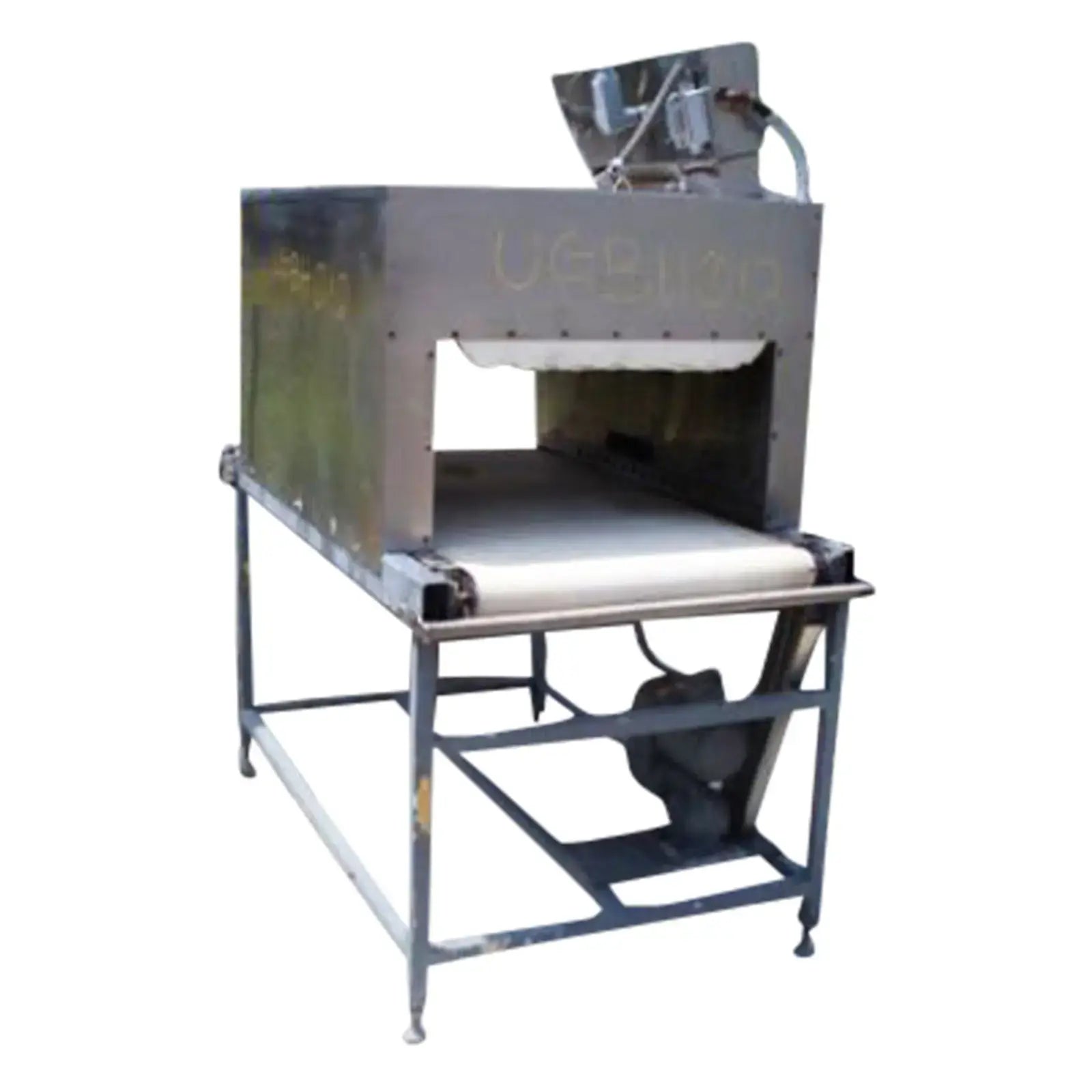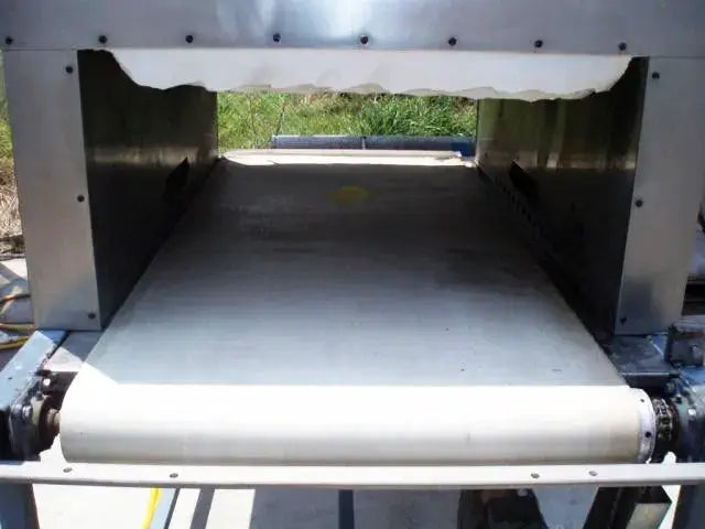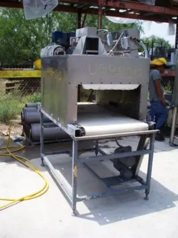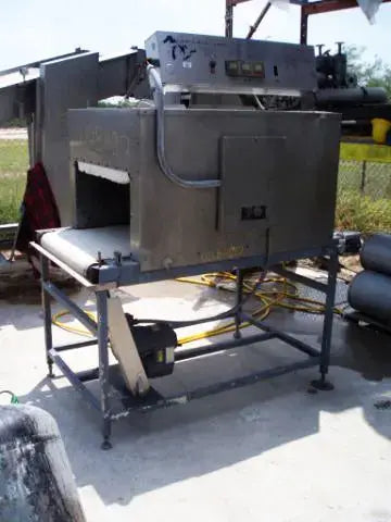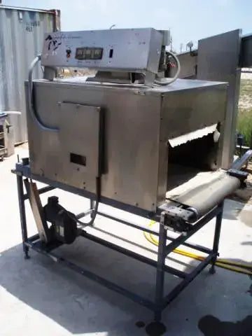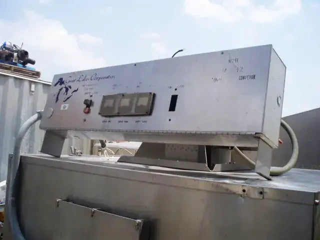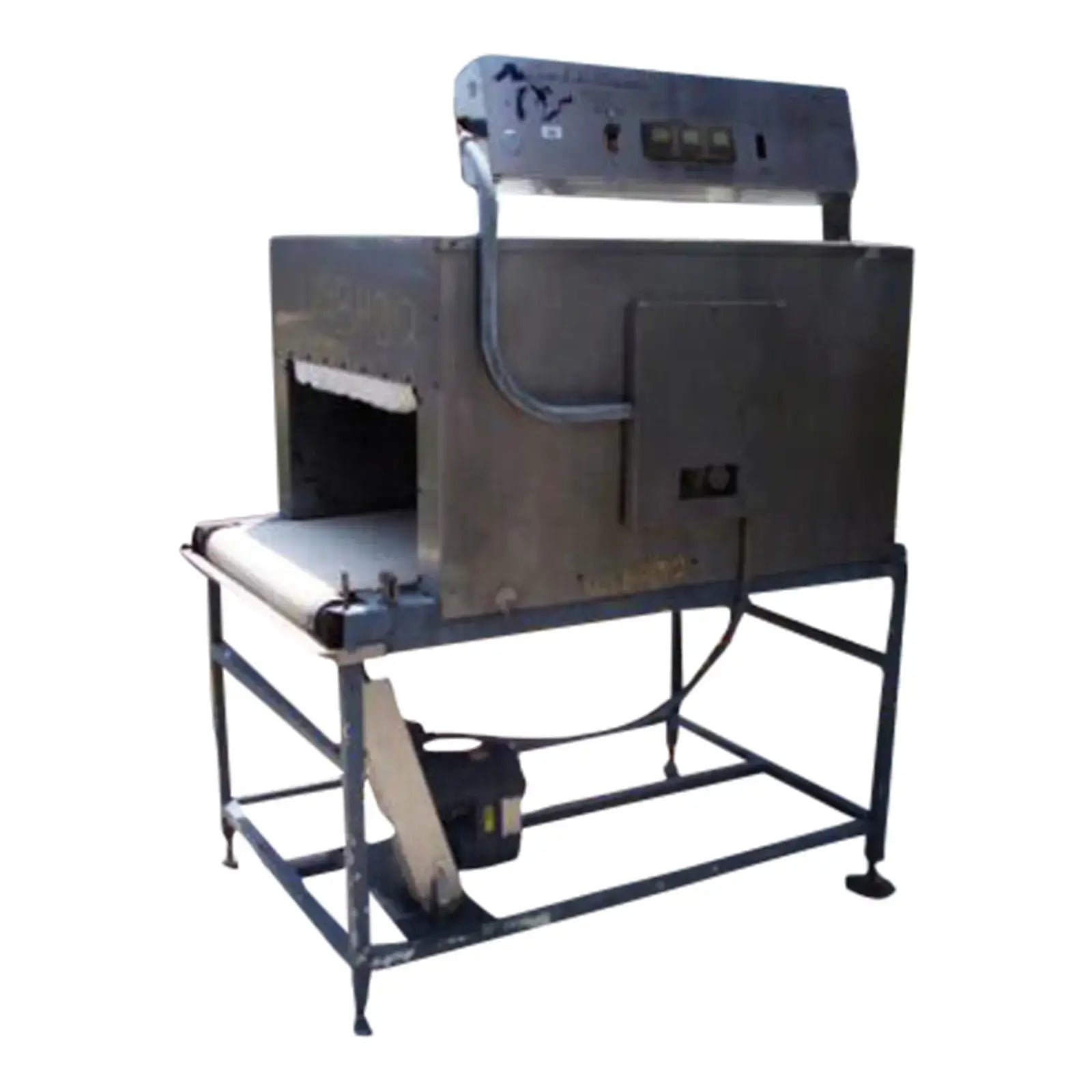 Túnel de calor retráctil de los Grandes Lagos. Modelo: M-12. S/N: 227. Apertura/espacio libre sobre la cinta: 2 pies 6 pulgadas de ancho x 1 pie 4 pulgadas de alto. Altura de entrada/salida del transportador: 37 pulgadas. Dimensiones de la cinta transportadora: 2 pies 4 pulgadas de ancho x 5 Motor eléctrico LUS de 5 pulgadas, 3/4 hp, 1745 rpm, 230/460 V, 28/14 amperios, 60 Hz, trifásico. Reductor de velocidad Dayton: relación: 58, salida de rpm: 30. Dimensiones totales: 5 pies 7 pulgadas de largo x 3 pies 2-1/2 pulgadas de ancho x 6 pies 9 pulgadas de alto.