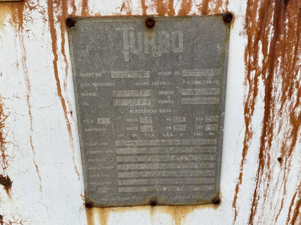 Turbo Refrigerating Series BAR40LR Liquid Recirculated Ice Maker. Model: BAR40LR. Serial No: 7939900. Refrigerant: R-717. Nominal Ice Capacity U.S. Tons (24 hrs): 20.