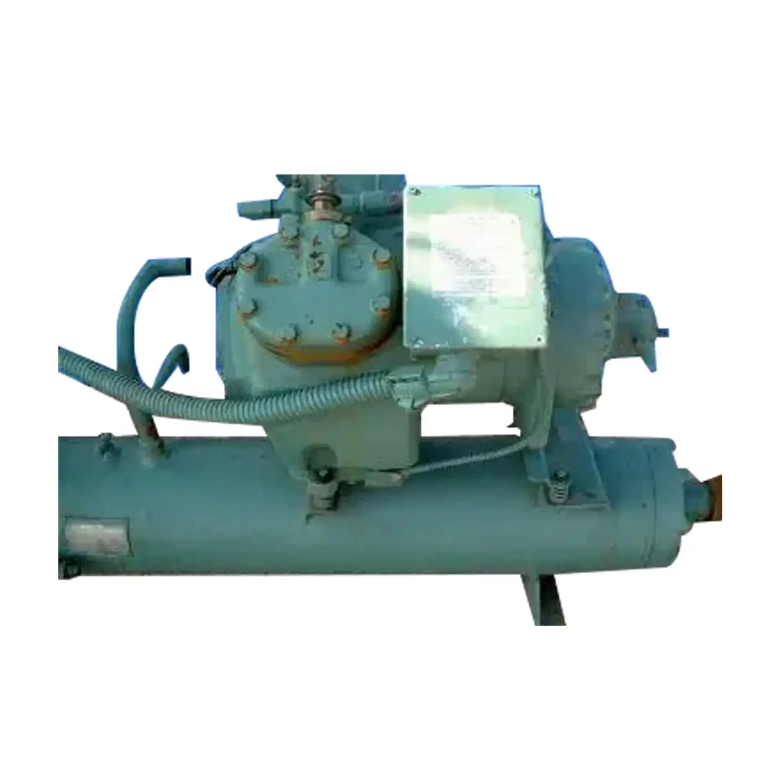 Unidad condensadora enfriada por agua Carrier: 20 toneladas. Modelo 07EA022-410, N/S L995362. Tonelaje nominal utilizando R-22: 20 toneladas. Compresor Carlyle. Modelo 06ED-150460, S/N 4379J00672, 200 V, trifásico, 60 Hz, 506 283 LRA, 72 RLA, 1800 sin. rpm. Diseño 450 psi/3105 kPa, prueba 315 psi/2174 kPa. Barril enfriador, modelo 09RE022-109, S/N 9918240, Junta Nacional 143434. MAWP: 385 psi a 300 °F.