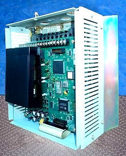 Variador de frecuencia Allen-Bradley. S/N: 1JAMOF000. Entrada de CA: CT de 6,6/3,0 KVA, VT de 7,0/8,5 KVA, 380/480 V, CT de 10 A, VT de 10,7 A, trifásico, 50/60 Hz. Salida de CA: 6,7 KVA CT, 7,2 KVA VT, 0/460 V, 8,4 A CT, 9,0 A VT, trifásico, 0/400 Hz. Entrada CC: 5,2 KVA CT, 5,5 KVA VT, 540/650 V, 8 Amperios CT, 8,5 Amperios VT. Dimensiones totales: 9 pulgadas de largo x 8 pulgadas de ancho x 11 pulgadas de alto.