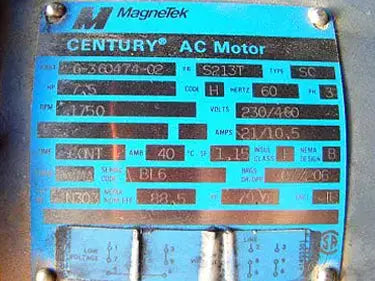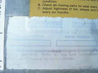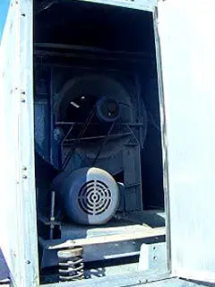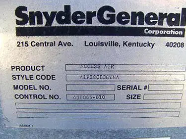 Unidad de tratamiento de aire de Snyder General Corporation. Motor MagneTek: 7,5 Hp, 1750 RPM, 230/460 V, 21/10,5 A, 60 Hz, trifásico. (2) ventiladores de 20 pulgadas de diámetro. Entradas/salidas: (1) tubería de 2 pulg., (1) tubería de 1 ¼ pulg., (1) tubería de 1 pulg., (1) tubería de ¾ pulg. Dimensiones totales: 9 pies 6 pulgadas de largo x 5 pies 5 ¼ pulgadas de ancho x 7 pies 11 ½ pulgadas (H15).