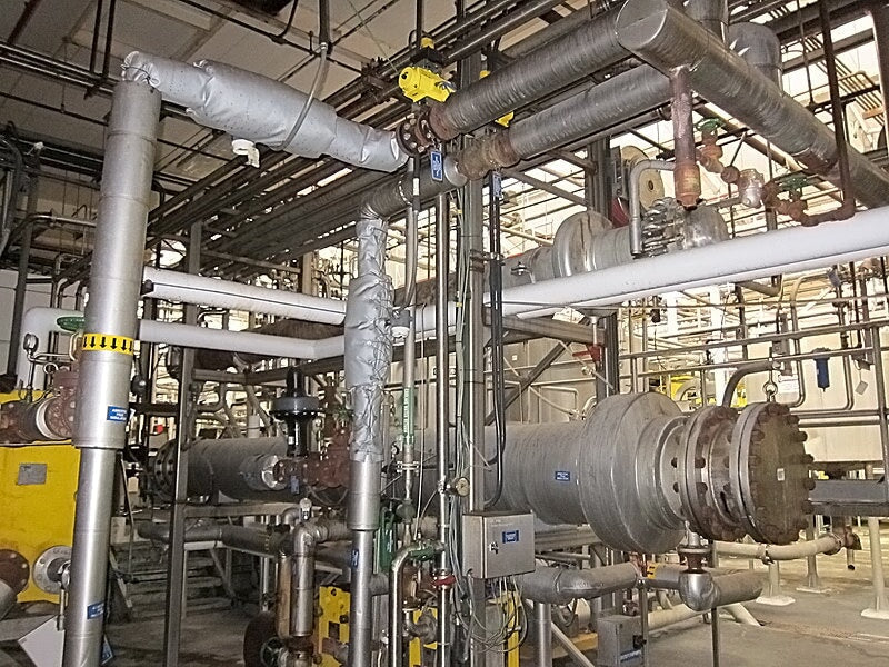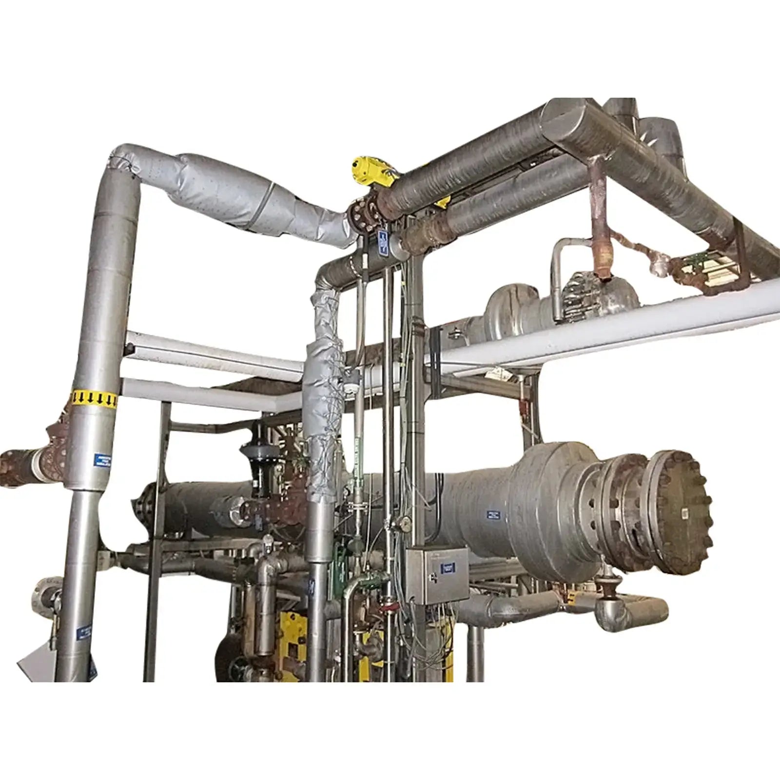 Unidad Esterilizadora de Proceso Avanzado. S/N: 2325. Acero inoxidable, (2) intercambiadores de calor de tubo en tubo, (1) tubo de enfriamiento, 150 psi a 400 °F, 18 pulg. de diámetro x 20 pies de largo, (2) intercambiadores de calor de placas AGC ProHX-F, válvula de conexión y trampa de vapor