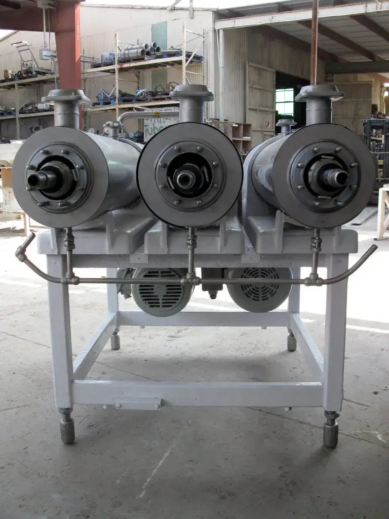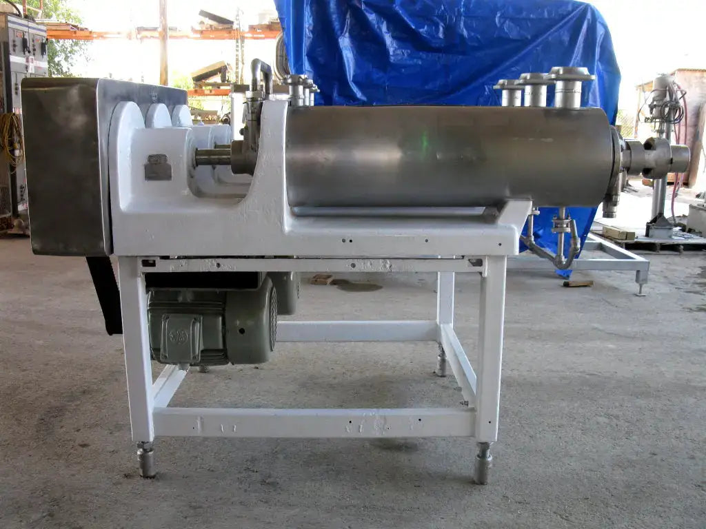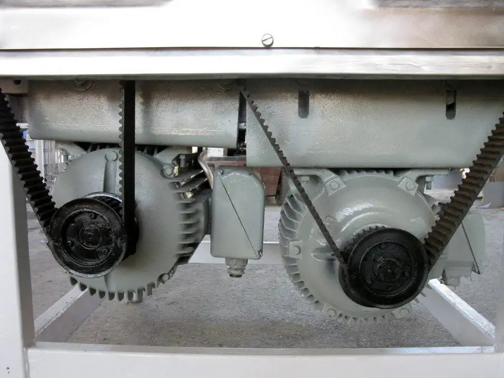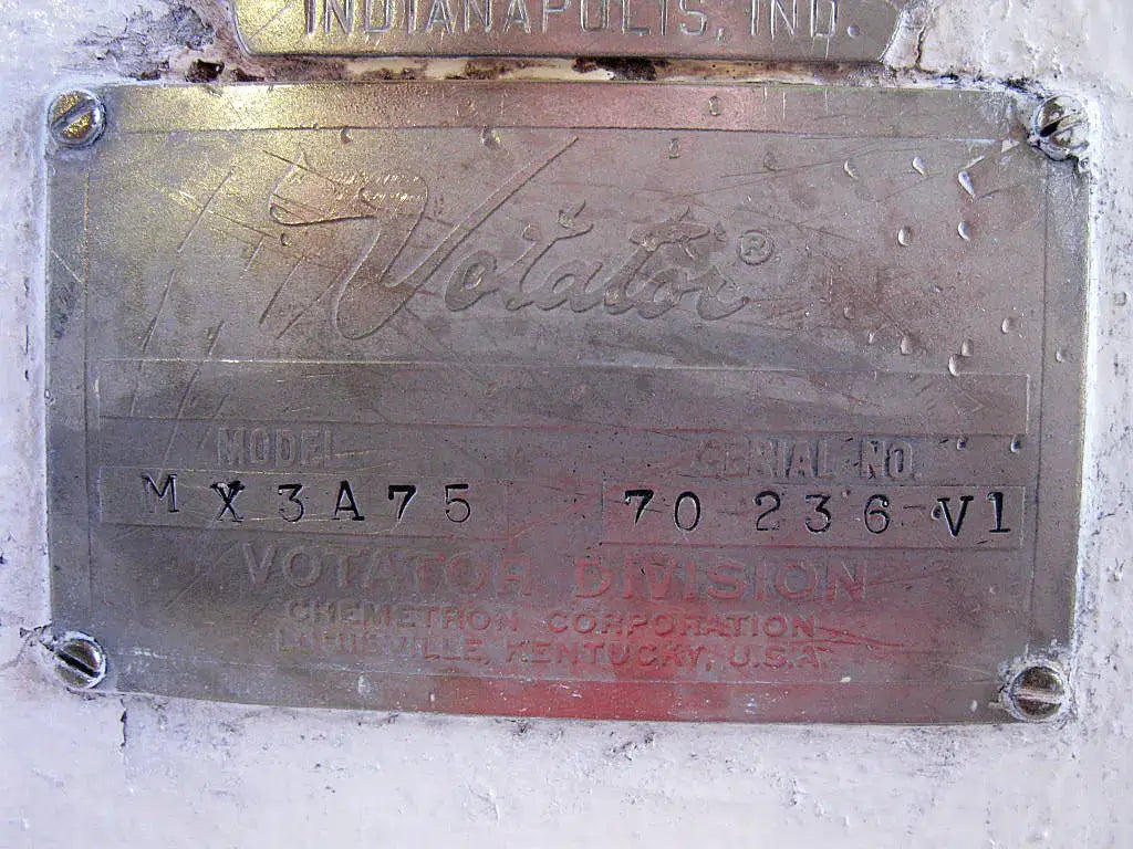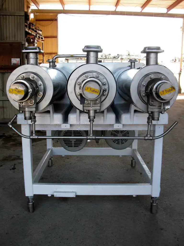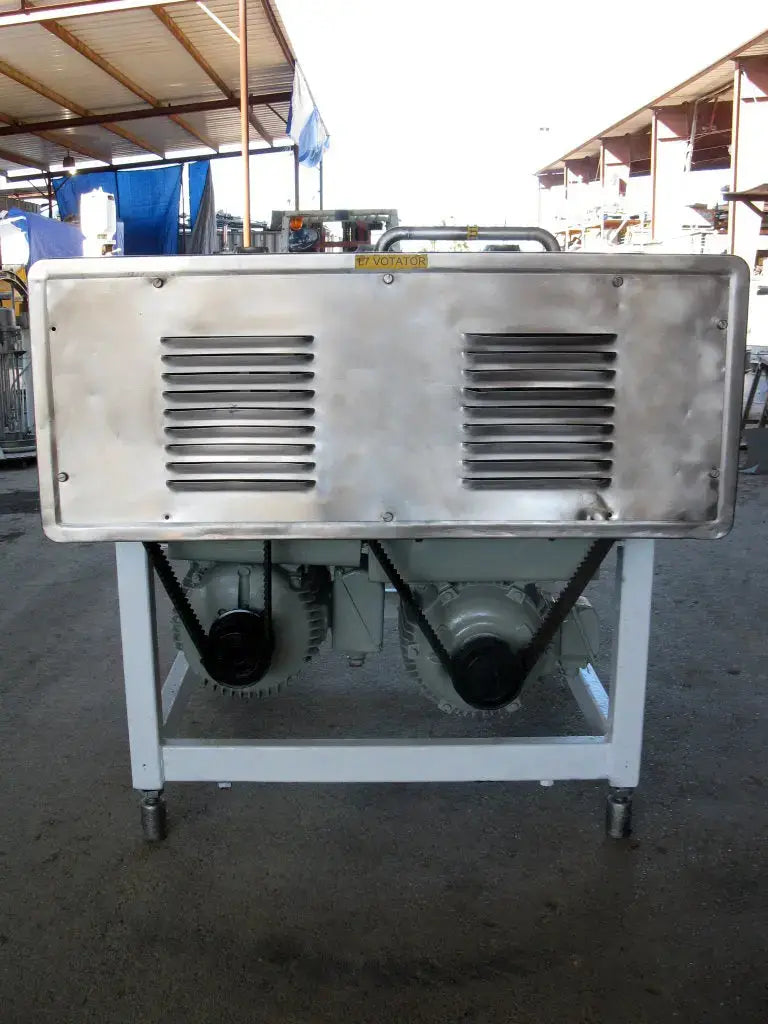 Unidad votadora Chemetron de 3 barriles. Modelo: MX3A75. Número de serie: 70-236-V1. (1) Motor General Electric: 15 hp, 1175 rpm, 230/460 V, 37/18,5 A, 60 Hz, trifásico. (1) Motor Baldor: 10 hp, 870 rpm, 230/460 V, 30/15 A, 60 Hz, trifásico. Información de la polea: (2) impulsores de 6-1/8 pulgadas, (3) impulsados de 1 pie 3-3/4 pulgadas. (3) Ejes con una longitud de: 5 pies 11 pulgadas (16) raspadores para cada eje. Dimensiones de los juegos de raspadores: (primer eje) 6-1/8 pulg. de largo x 1-3/4 pulg. de ancho (segundo eje) 6-1/8 pulg. de largo x 2 pulg. de ancho (tercer eje) 6 -1/8 pulg. L x 1-5/8 pulg. W. Entradas/salidas: (4) ACME de 2 pulg., (3) brida de 3 pulg., (3) brida de 4-1/2 pulg. Dimensiones totales: 7 pies 6 pulgadas de largo x 4 pies 9 pulgadas de ancho x 5 pies 1 pulgada de alto.