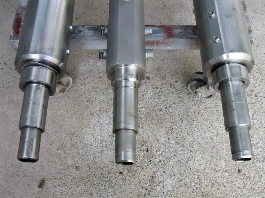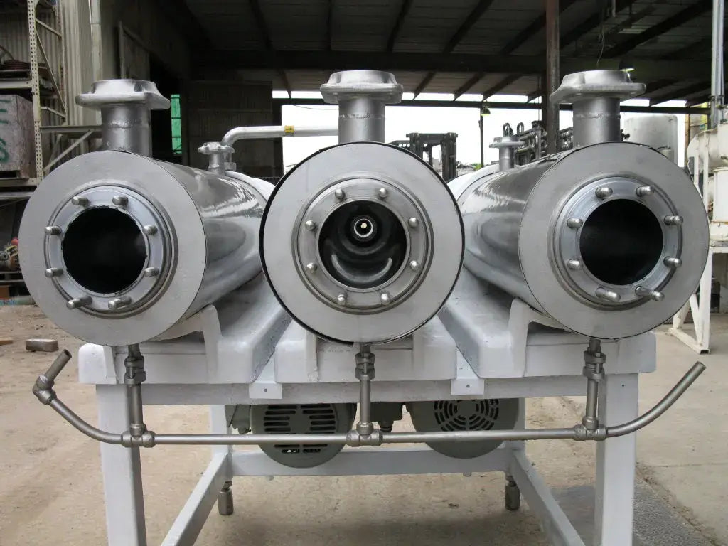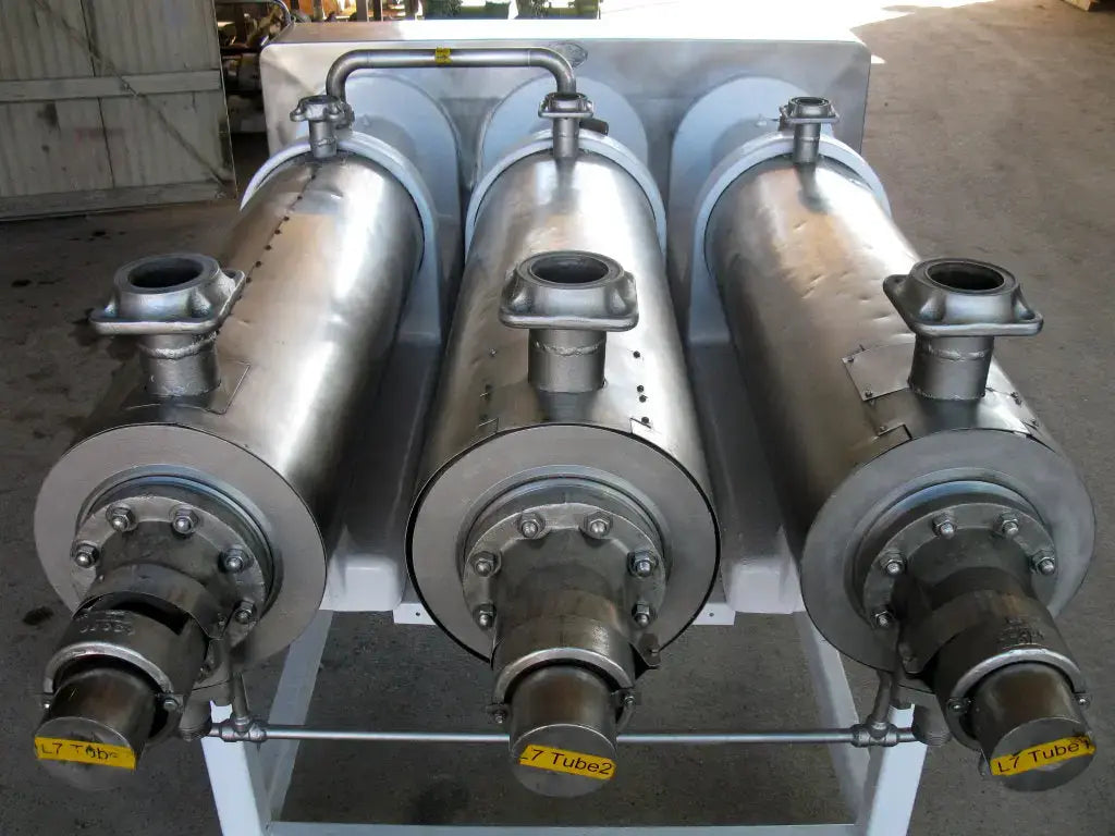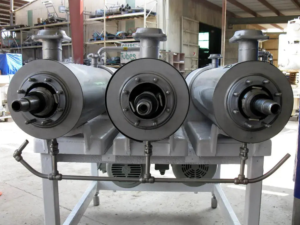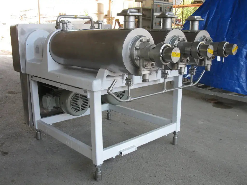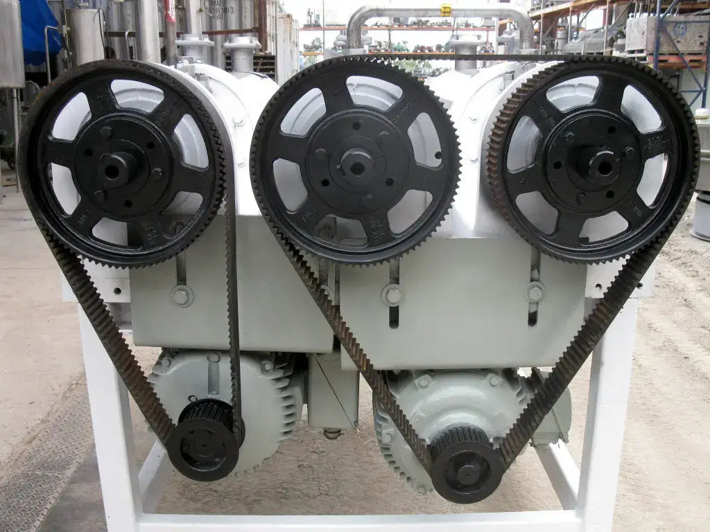 Unidad votadora Chemetron de 3 barriles. Modelo: MX3A75. Número de serie: 70-236-V1. (1) Motor General Electric: 15 hp, 1175 rpm, 230/460 V, 37/18,5 A, 60 Hz, trifásico. (1) Motor Baldor: 10 hp, 870 rpm, 230/460 V, 30/15 A, 60 Hz, trifásico. Información de la polea: (2) impulsores de 6-1/8 pulgadas, (3) impulsados de 1 pie 3-3/4 pulgadas. (3) Ejes con una longitud de: 5 pies 11 pulgadas (16) raspadores para cada eje. Dimensiones de los juegos de raspadores: (primer eje) 6-1/8 pulg. de largo x 1-3/4 pulg. de ancho (segundo eje) 6-1/8 pulg. de largo x 2 pulg. de ancho (tercer eje) 6 -1/8 pulg. L x 1-5/8 pulg. W. Entradas/salidas: (4) ACME de 2 pulg., (3) brida de 3 pulg., (3) brida de 4-1/2 pulg. Dimensiones totales: 7 pies 6 pulgadas de largo x 4 pies 9 pulgadas de ancho x 5 pies 1 pulgada de alto.