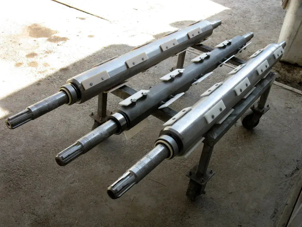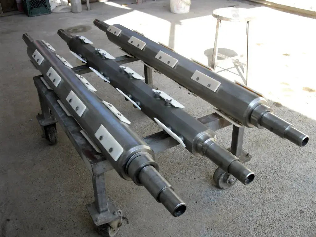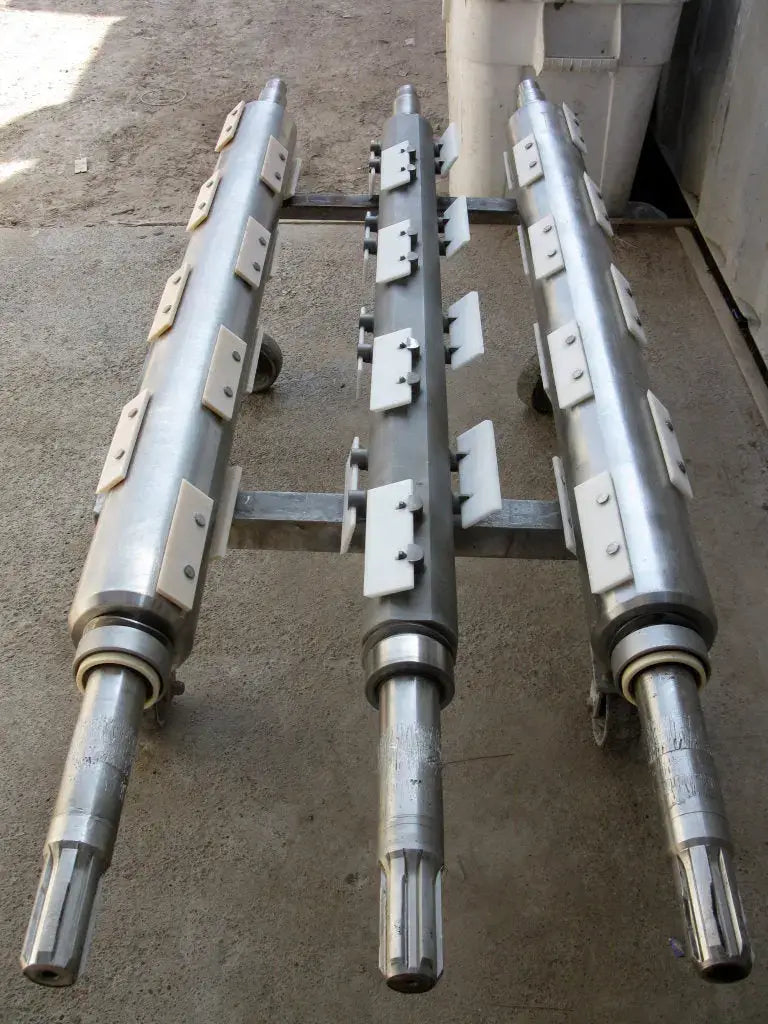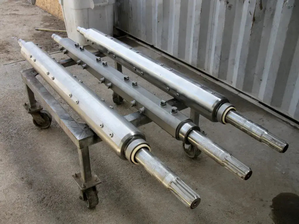 - Descripción del eje, cuchilla y raspador: (3) Shafts with length of: 5 ft. 11 in. (16) scrapers for each shaft. Sets of scrapers dimensions: (1st shaft) 6-1/8 in. L x 1-3/4 in. W. (2nd shaft) 6-1/8 in. L x 2 in. W. (3rd shaft) 6-1/8 in. L x 1-5/8 in. W.