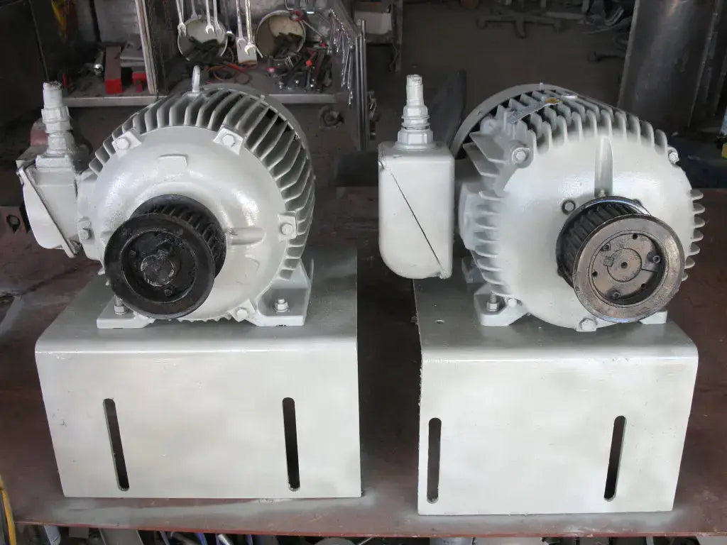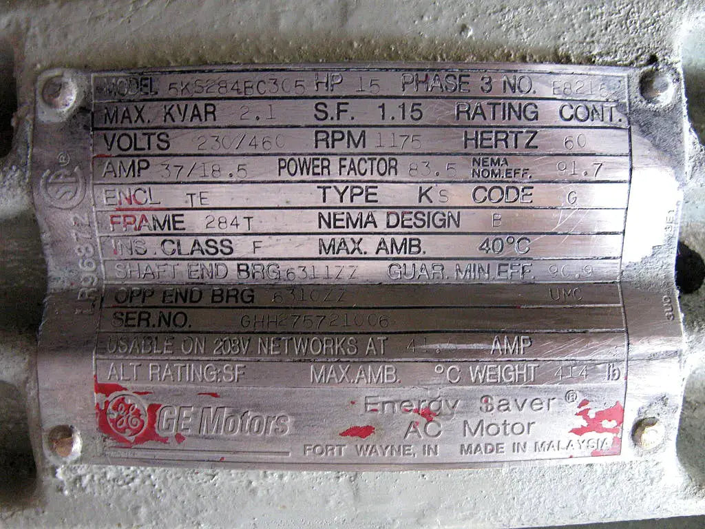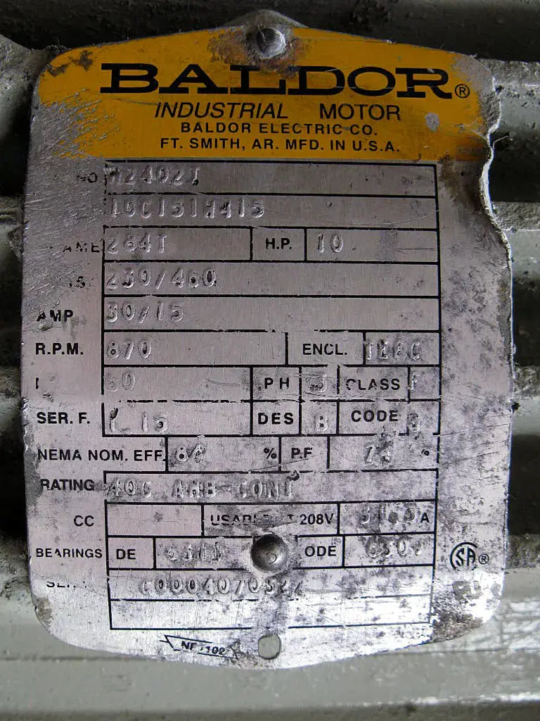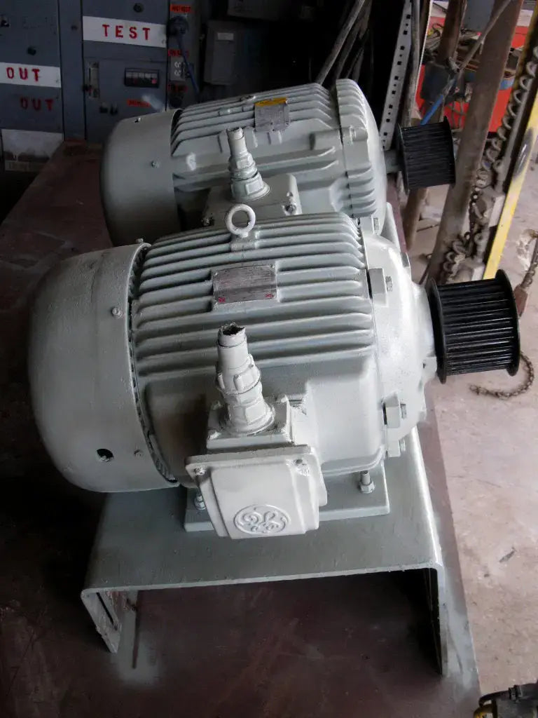 - Si hay varios motores, descripciones de motores frente a especificaciones: (1) 15 hp General Electric motor and (1) 10 hp Baldor motor