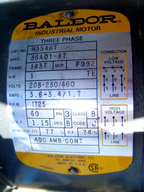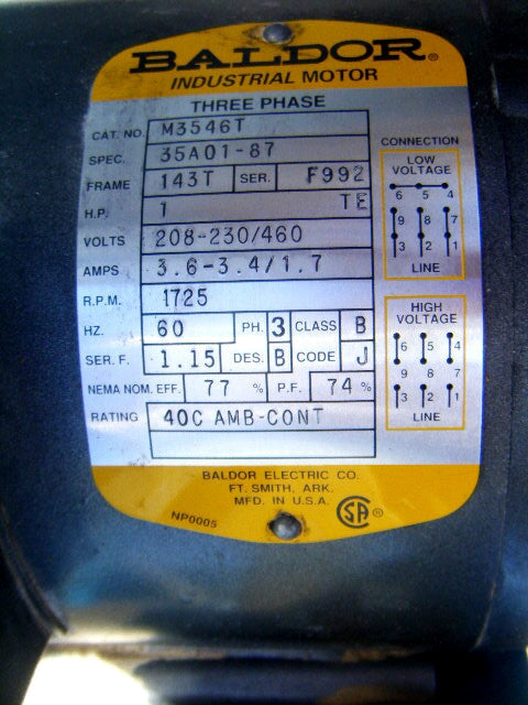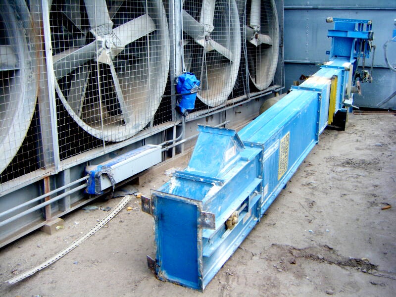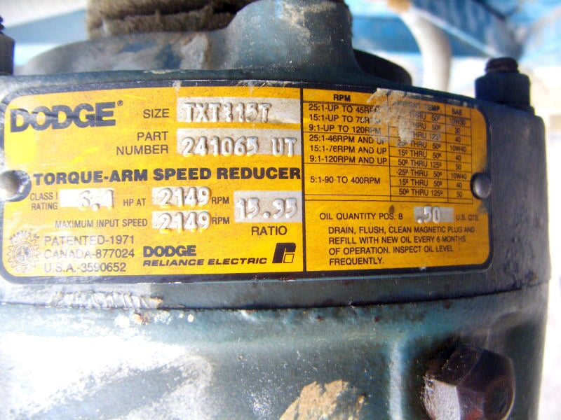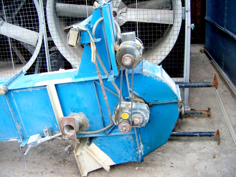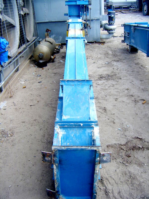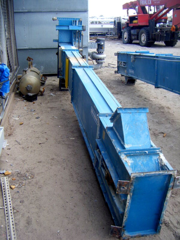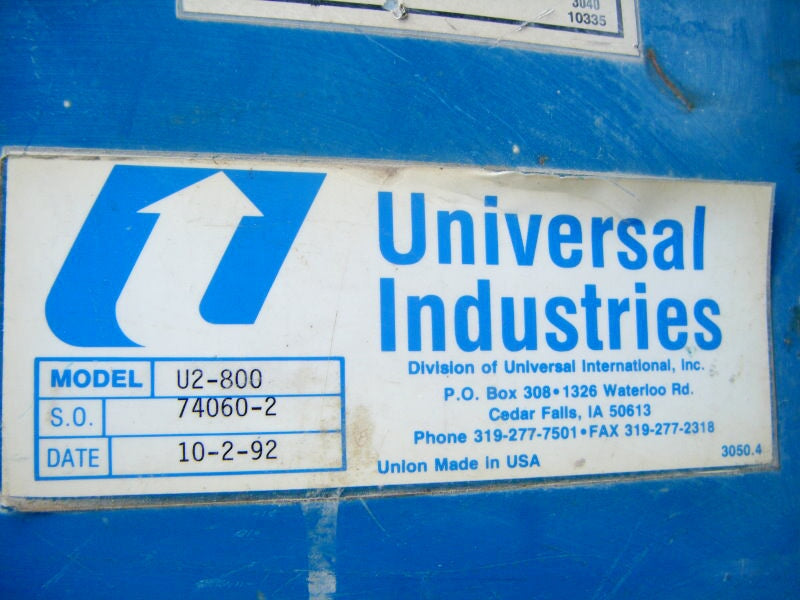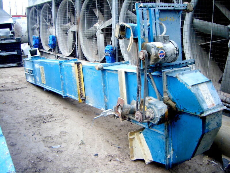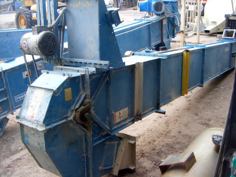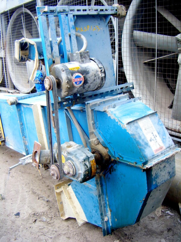 1992 Universal International, Inc. / Universal Industries Elevador de cangilones vertical. Modelo: U2-800. Capacidad de material que fluye libremente al 85% de llenado del cucharón: 800 pies3/h. Espaciado del cucharón: 5 pulg. Tamaño del cucharón: 7 pulg. de largo x 4 ½ pulg. de ancho x 4 pulg. de profundidad. Alimentación: 8 pulg². Descarga: 10 pulgadas². Velocidad de la correa: 168 FPM. Ancho de la correa: 8 pulg. Motor eléctrico Baldor, 1 hp, 1725 rpm, 208-230/460 V, 3,6-3,4/1,7 amperios, 60 Hz, trifásico. Reductor de velocidad del brazo de torsión Dodge, relación: 15,35. Revoluciones finales: 112. Las aplicaciones de los elevadores de cangilones de la serie U2 incluyen materiales calientes, abrasivos, pesados, corrosivos, higroscópicos y húmedos, y también cuentan con un diseño exclusivo de “descarga fácil”. (1) Acceso a puerta de acceso de 10 pulg. de ancho x 7 pulg. de alto. Entrada: (1) puerto de 8 pulg. de ancho x 8 pulg. de alto, (1) puerto de 4 pulg. de diámetro. Puerto de acceso lateral. Salidas: (2) 8 pulg. de diámetro. puerto. Dimensiones totales: 5 pies 4 pulgadas de largo x 2 pies 8 pulgadas de ancho x 18 pies 6 pulgadas de alto (H16) (ACN92).