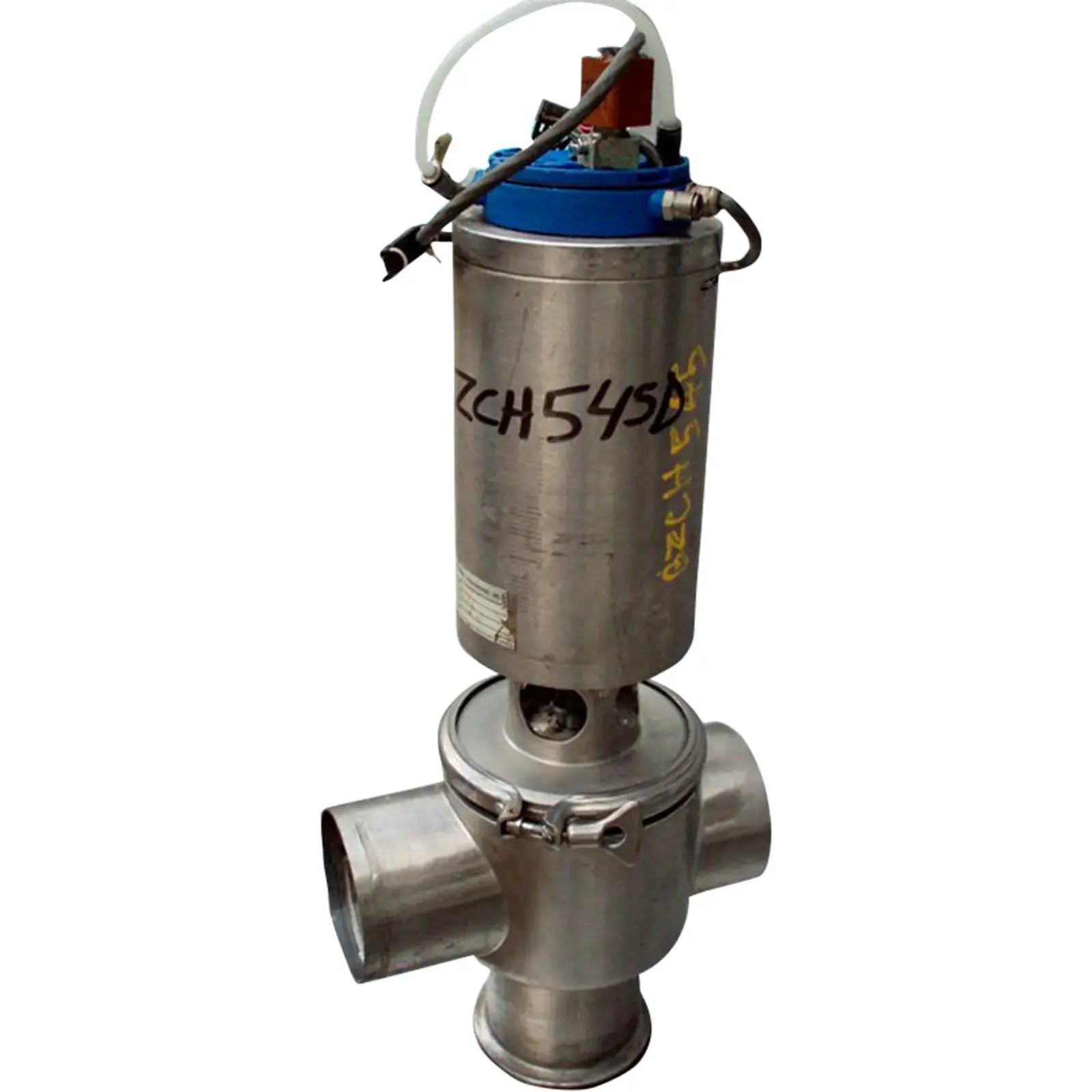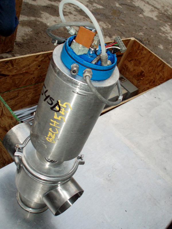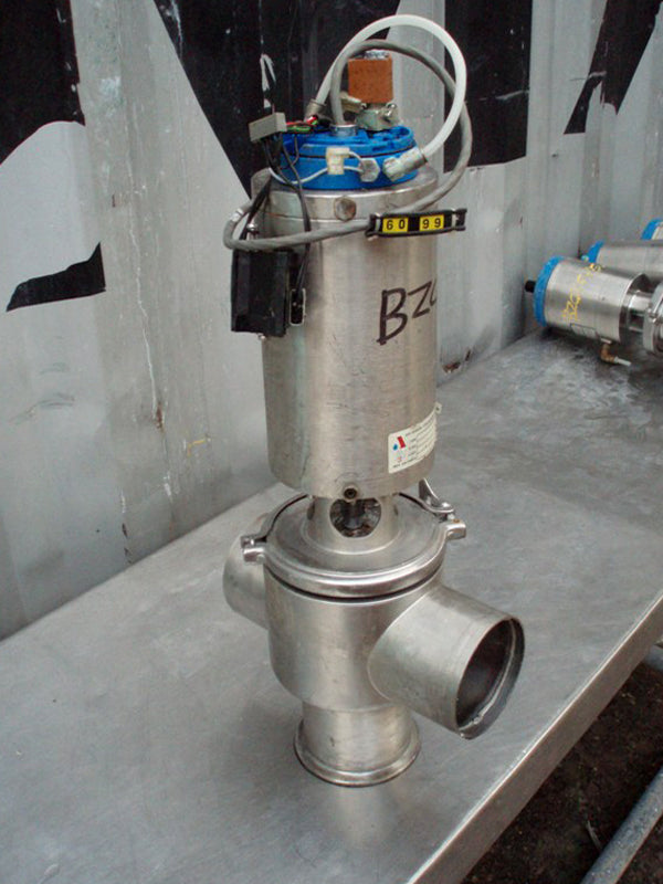 Válvula accionada por aire de 3 vías APV. Modelo: 170088 0101 8. S/N: T-VENTIL3A/2. Entradas/Salidas: (3) 4 pulgadas (1) conector S-Line, (2) tubo recto de acero inoxidable. Dimensiones totales: 10-1/4 pulgadas de largo x 7 pulgadas. Ancho x 1 pie 11-3/8 pulg. Alto.