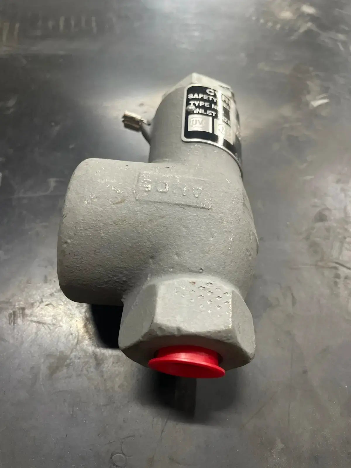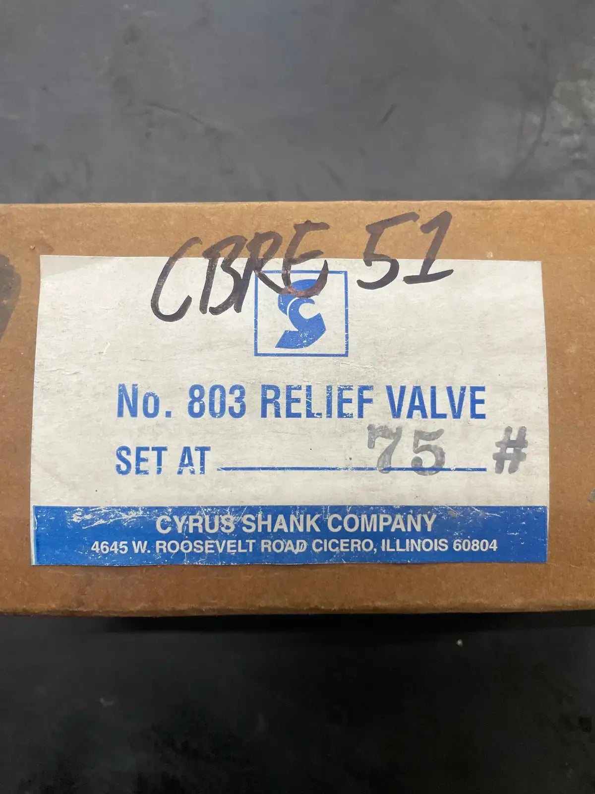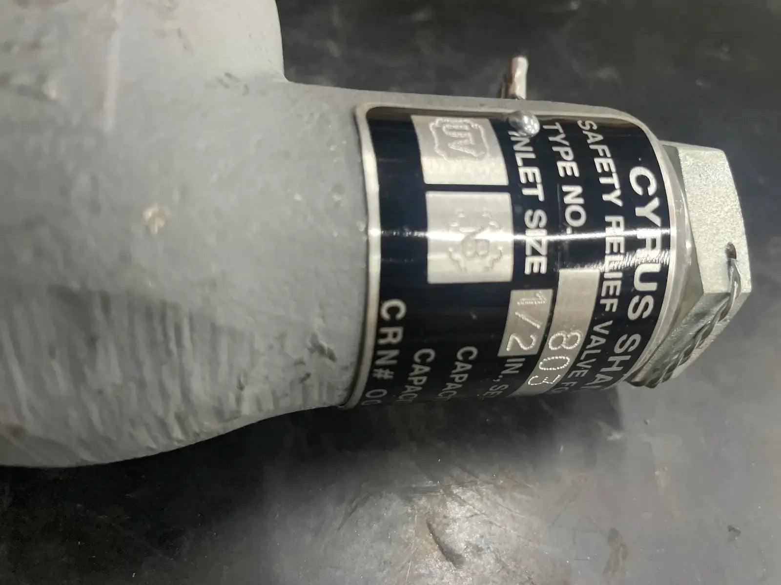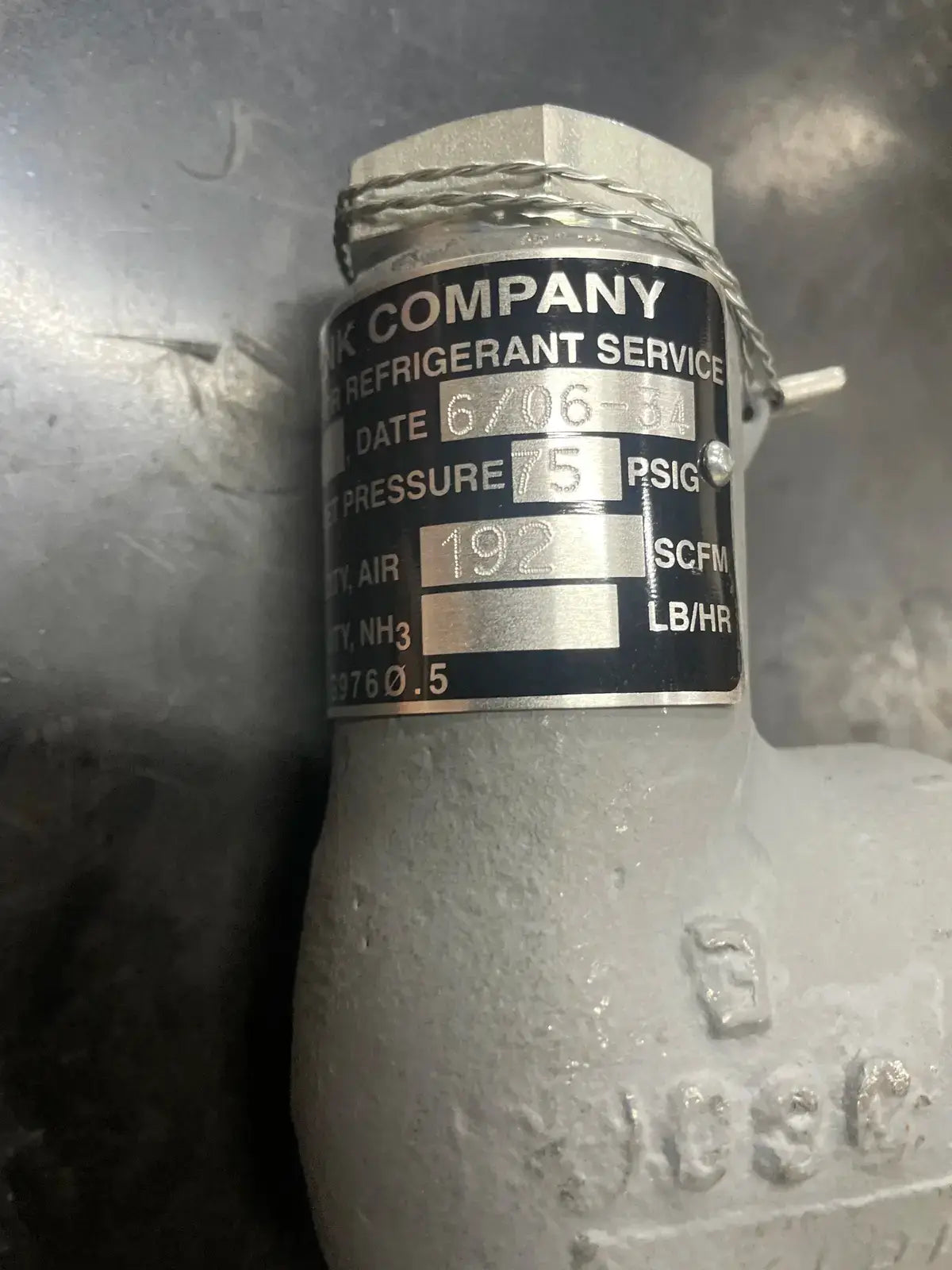 Válvula de alivio de seguridad para refrigerante Cyrus Shank. Tipo: 803. Tamaño de entrada: 1/2 pulg. FNPT. Tamaño de salida: 3/4 pulg. FNPT. Presión de ajuste: 75 PSIG. Capacidad Aérea: 192 SCFM.