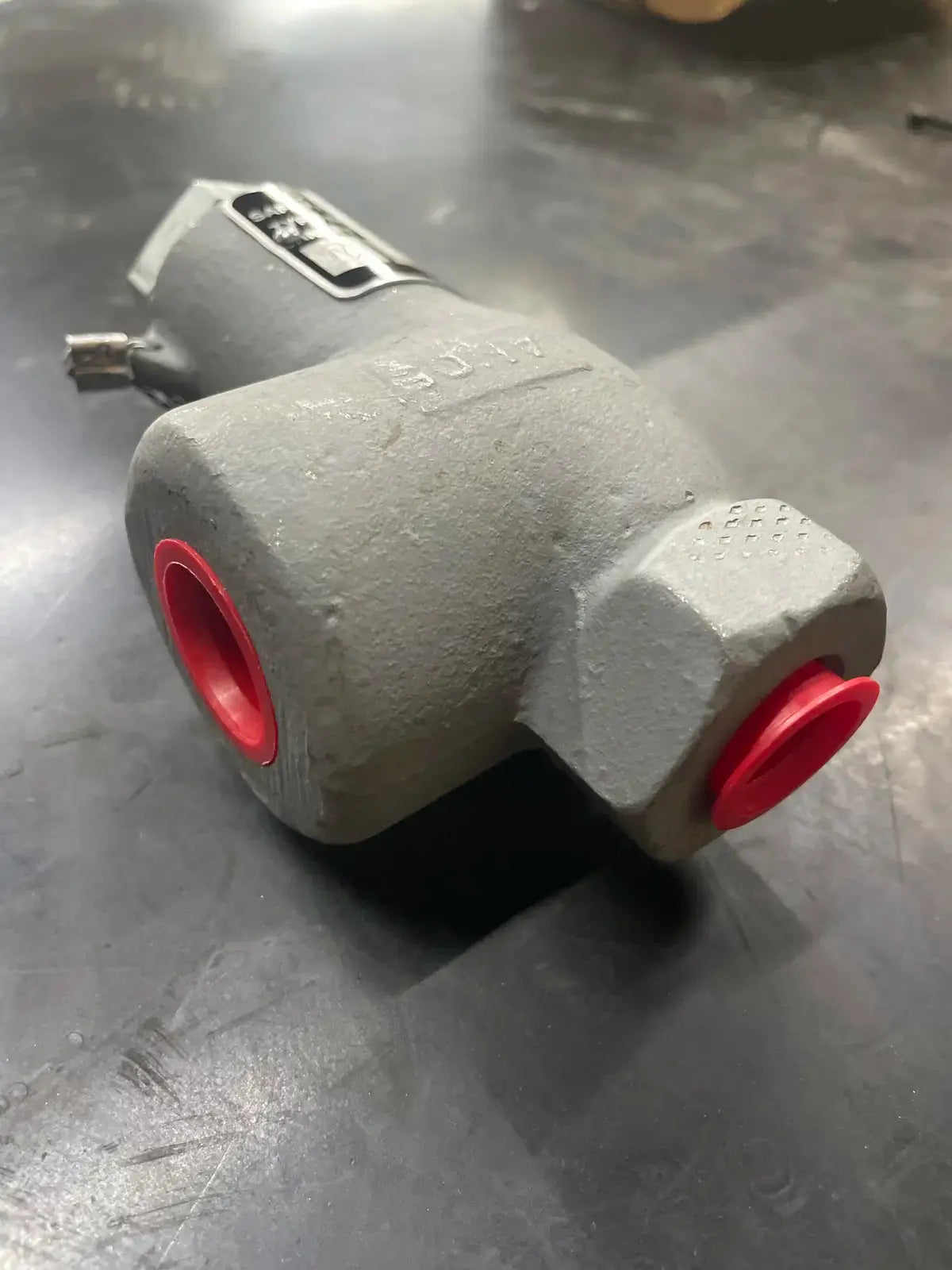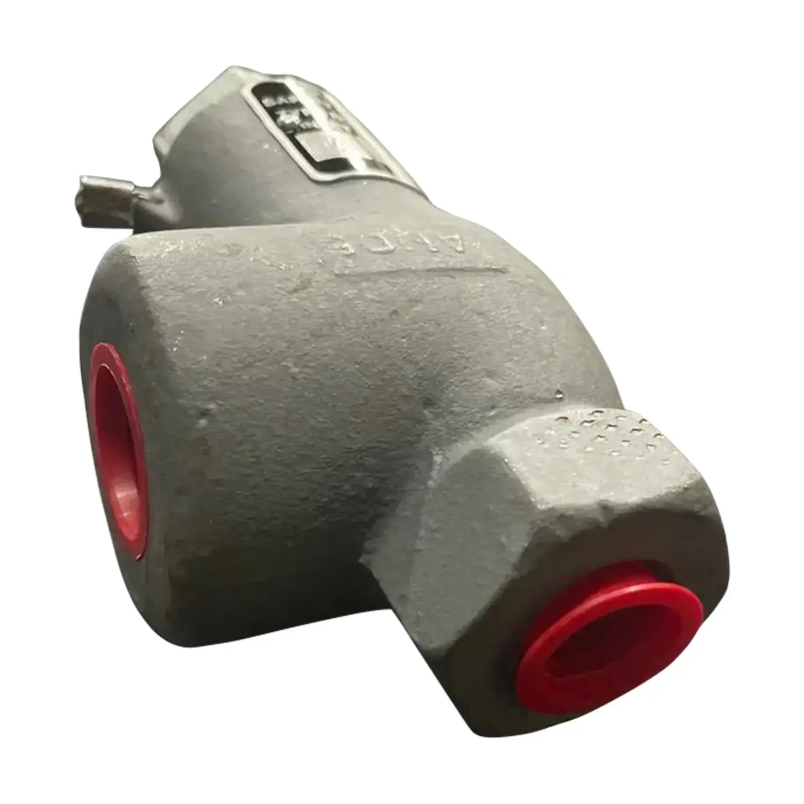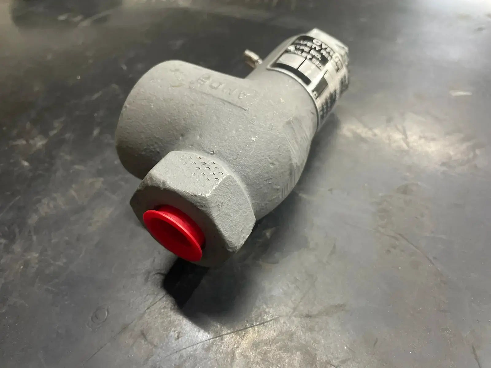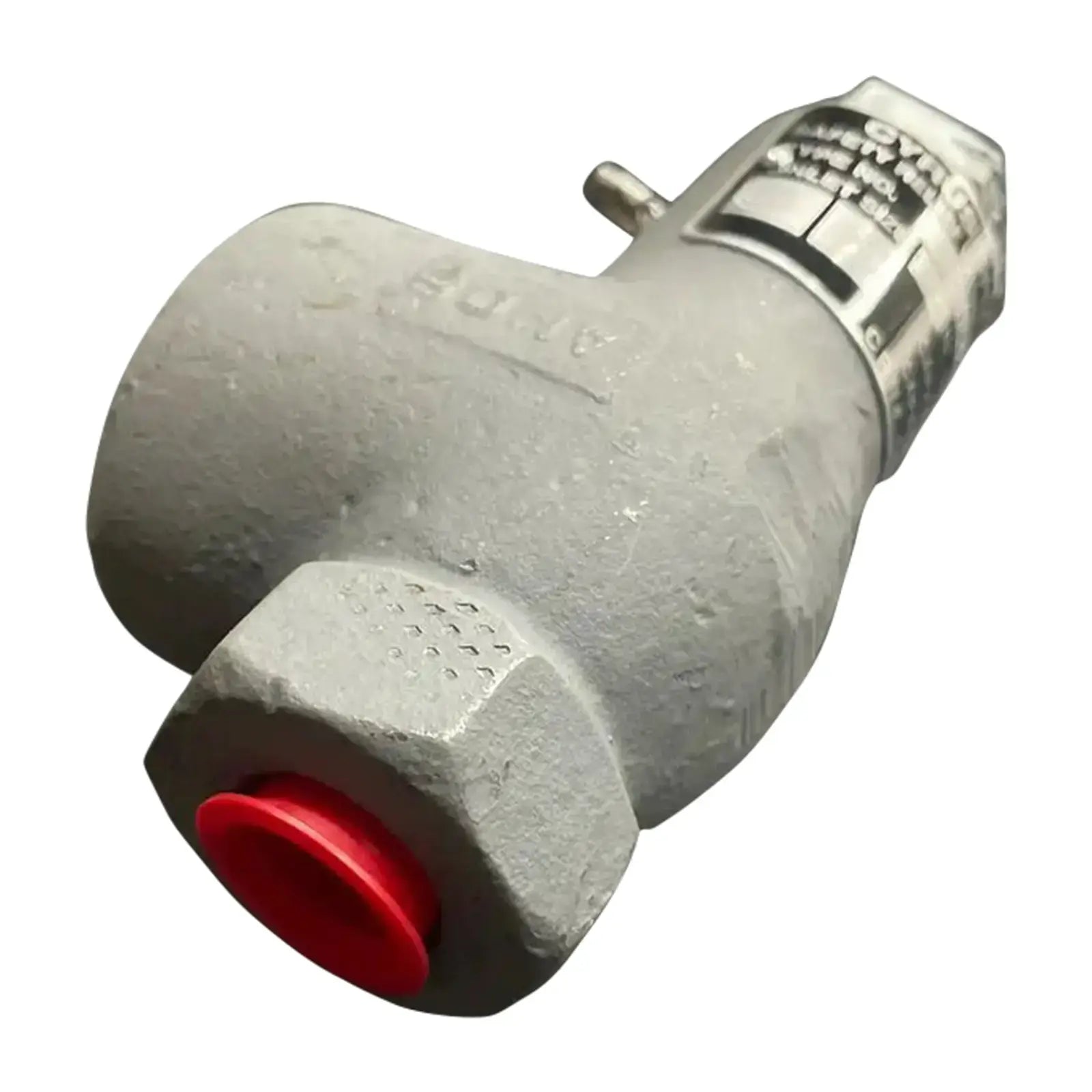 Válvula de alivio de seguridad para refrigerante Cyrus Shank. Tipo: 803. Tamaño de entrada: 1/2 pulg. FNPT. Tamaño de salida: 3/4 pulg. FNPT. Presión de ajuste: 75 PSIG. Capacidad Aérea: 192 SCFM.