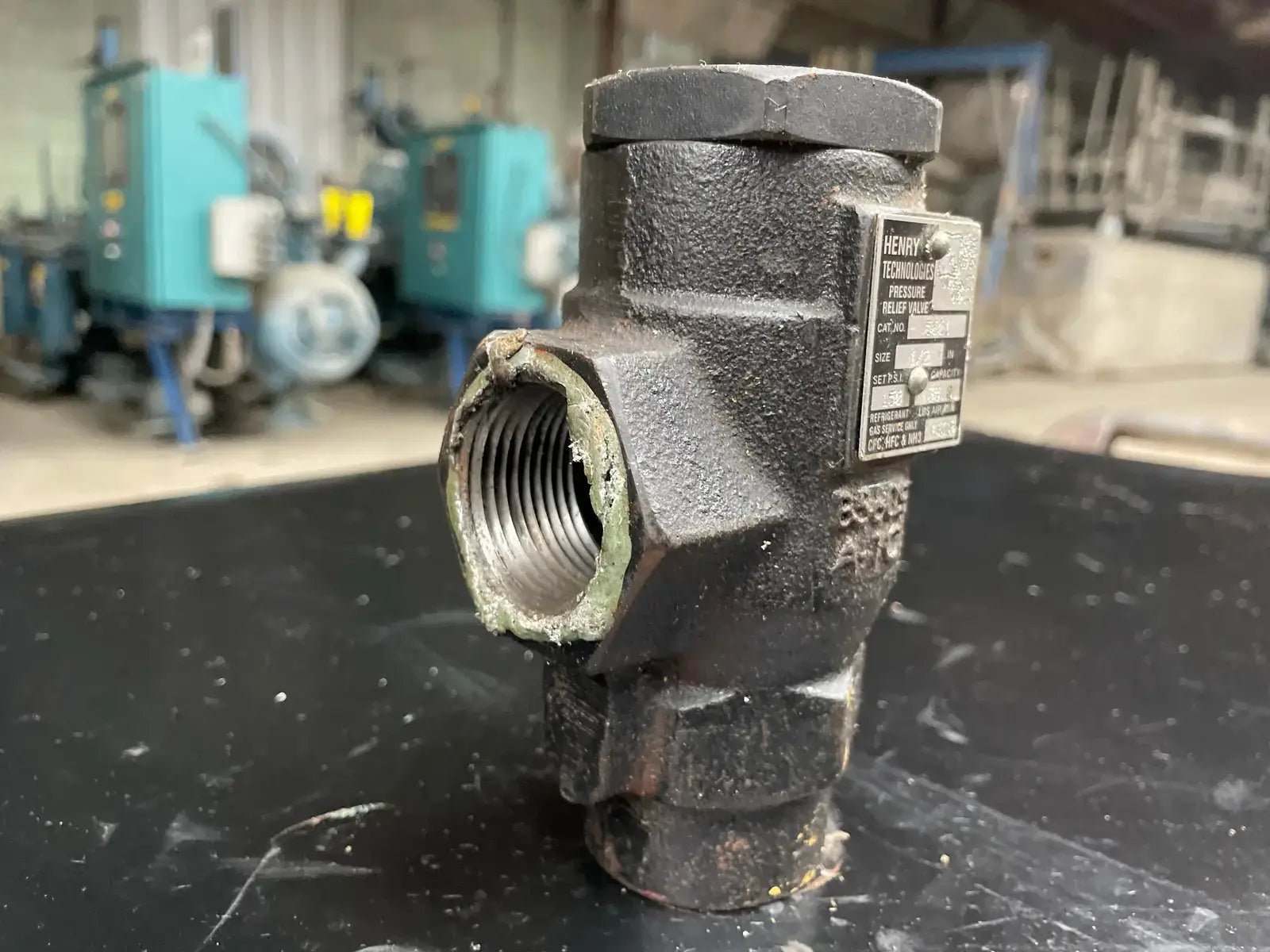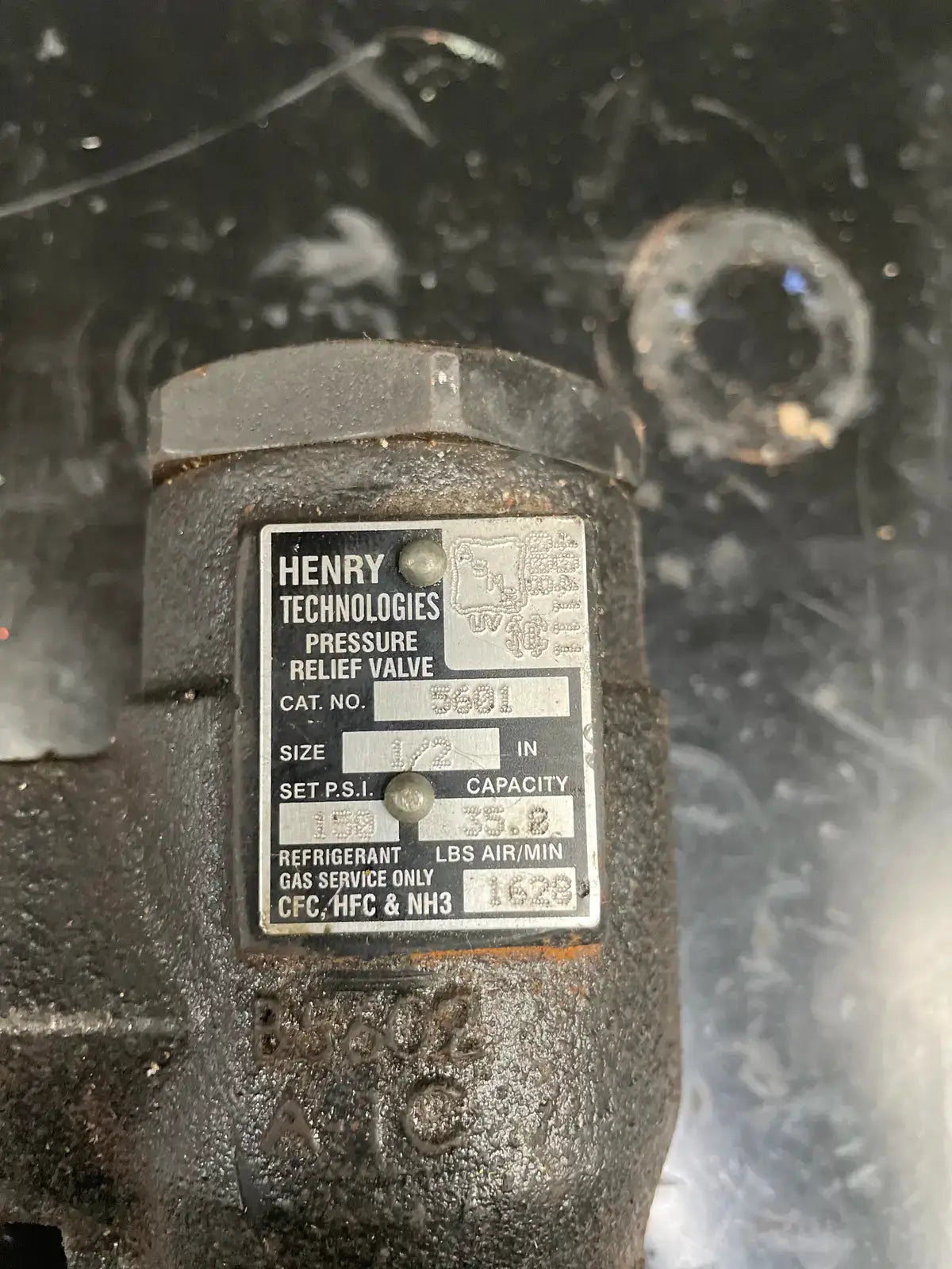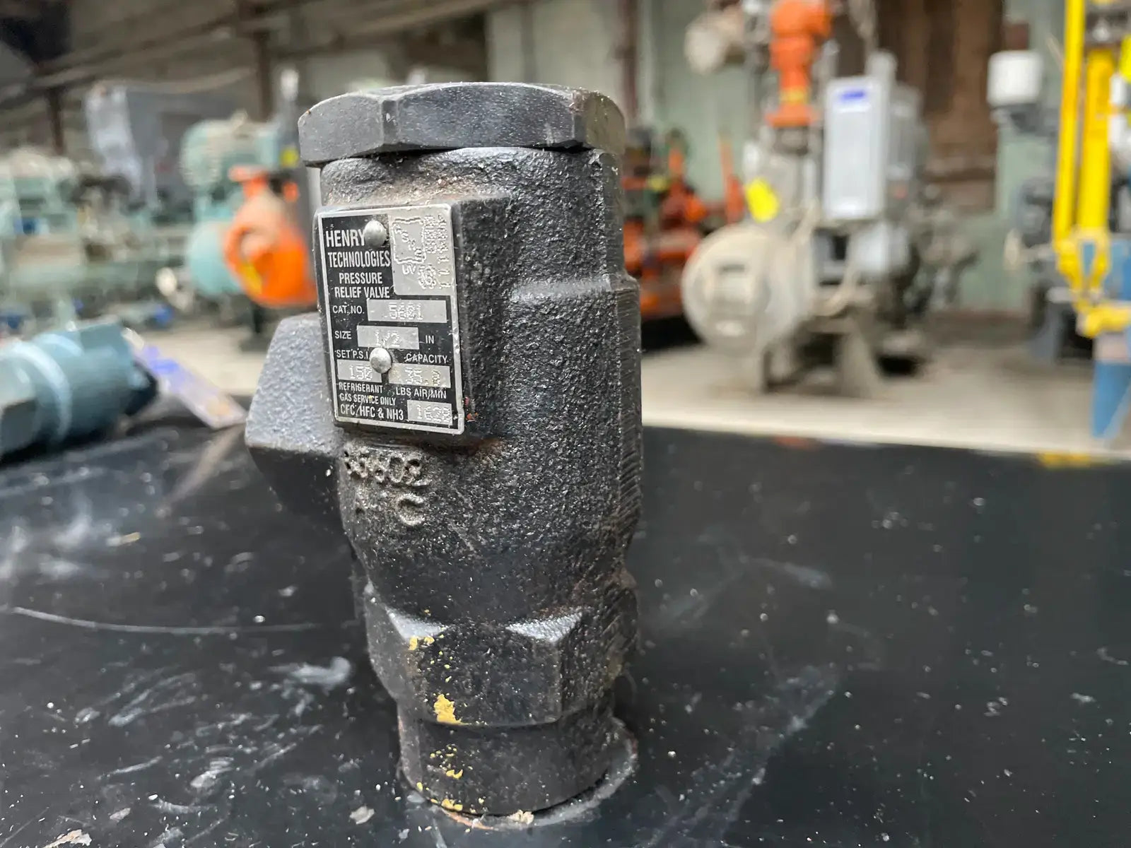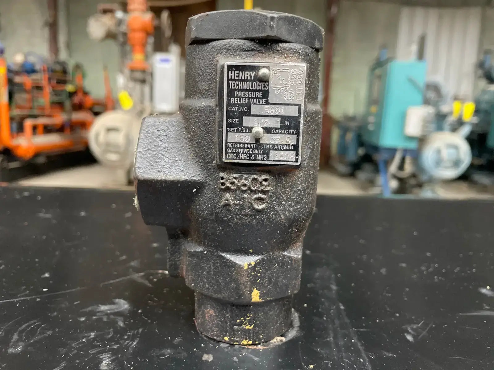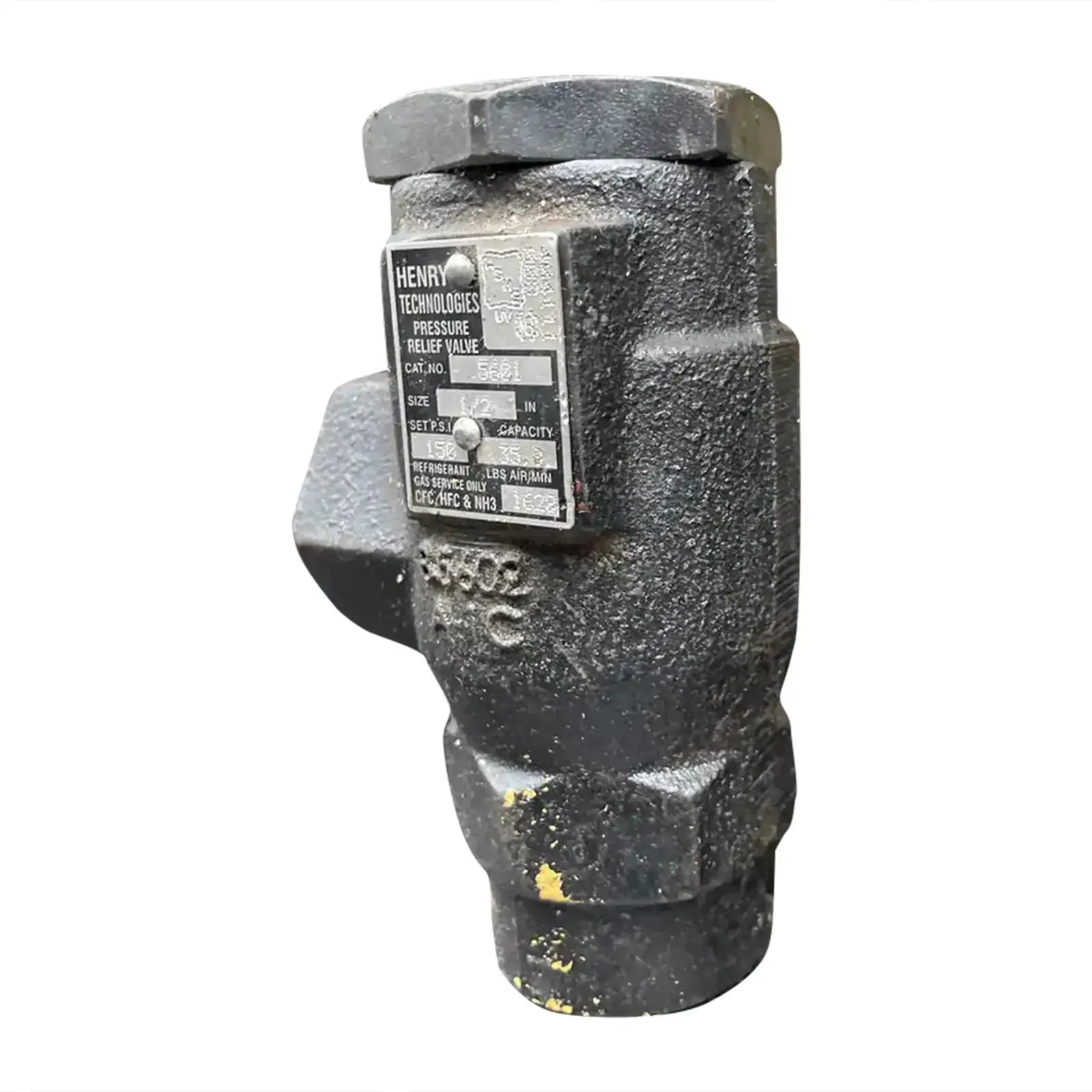Válvula de alivio de presión de refrigerante Henry Technologies. Cat No: 5601. Capacidad PSI establecida: 150 PSI, 57,7 LBS aire/min. Tipo de ángulo. Tamaño: 1/2 FPT x 1 FPT.