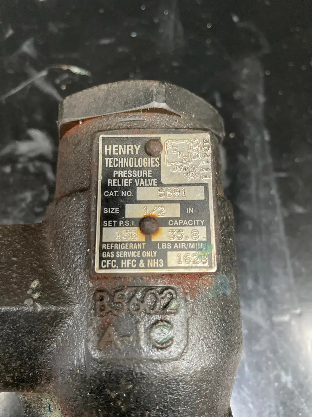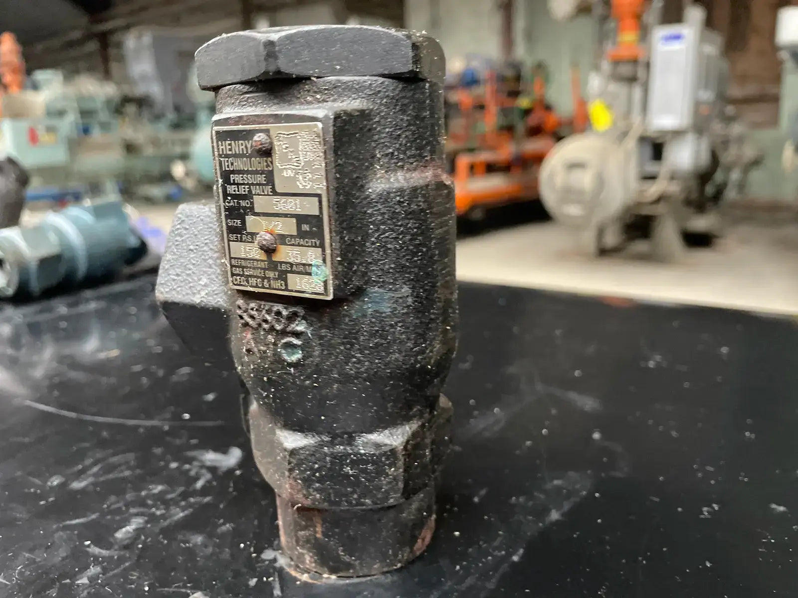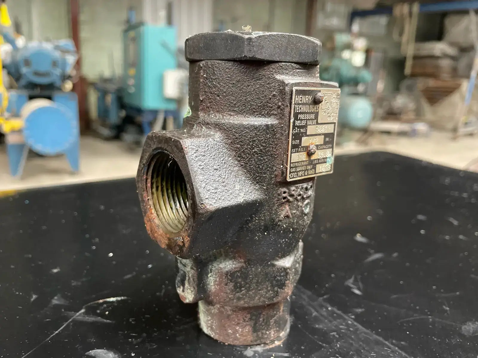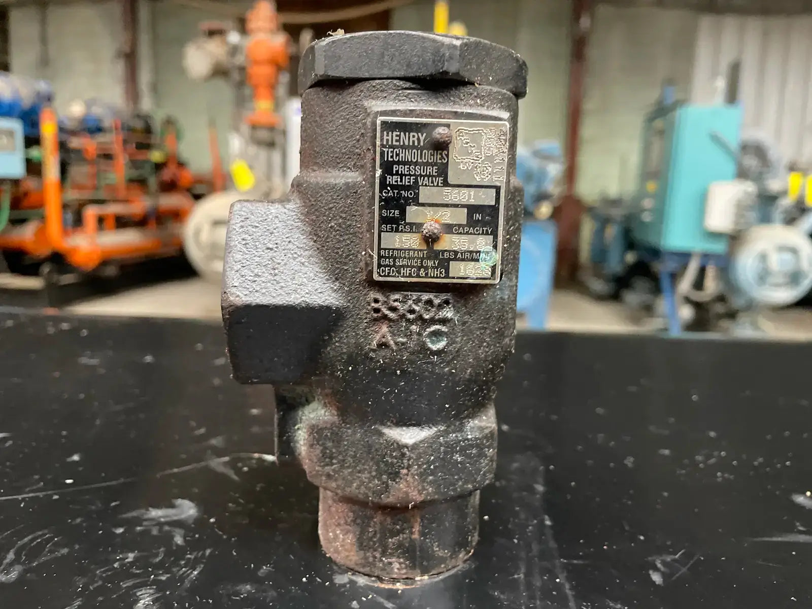 Válvula de alivio de presión de refrigerante Henry Technologies. N.º de catálogo: 5601. Capacidad de PSI establecida: 250 PSI, 57,7 LBS de aire/min. Tipo de ángulo. Tamaño: 1/2 FPT x 1 FPT.