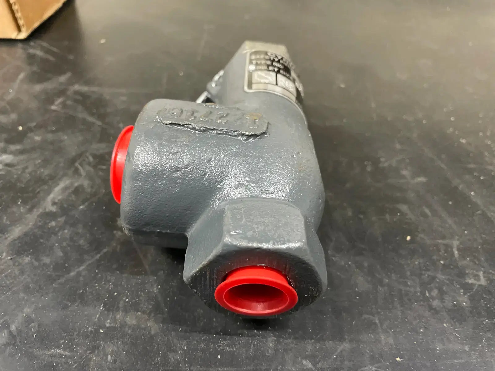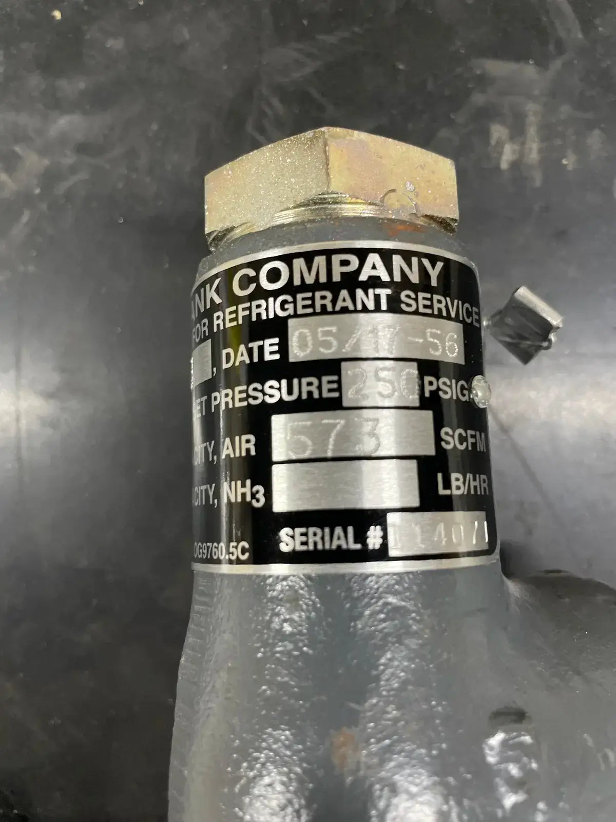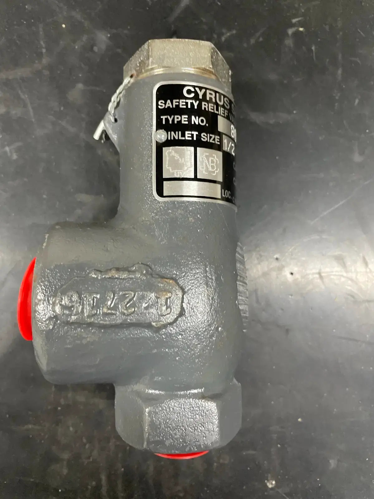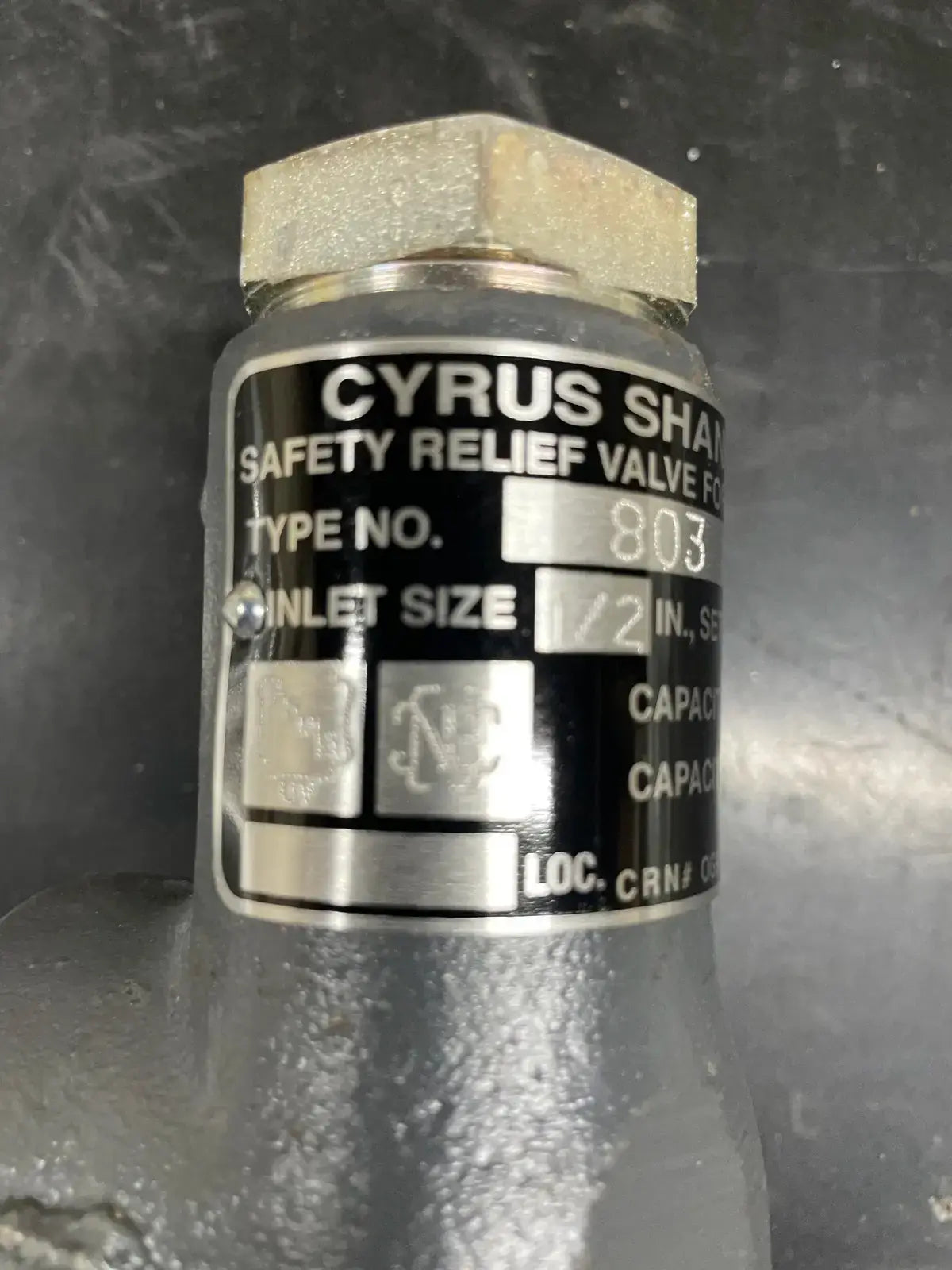 Válvula de alivio de seguridad para refrigerante Cyrus Shank. Número de tipo: 803. Número de serie: 114071. Tamaño de entrada: 1/2 FNPT. Tamaño de salida: 3/4 pulg. FNPT. Material del cuerpo: Fundición de hierro dúctil.