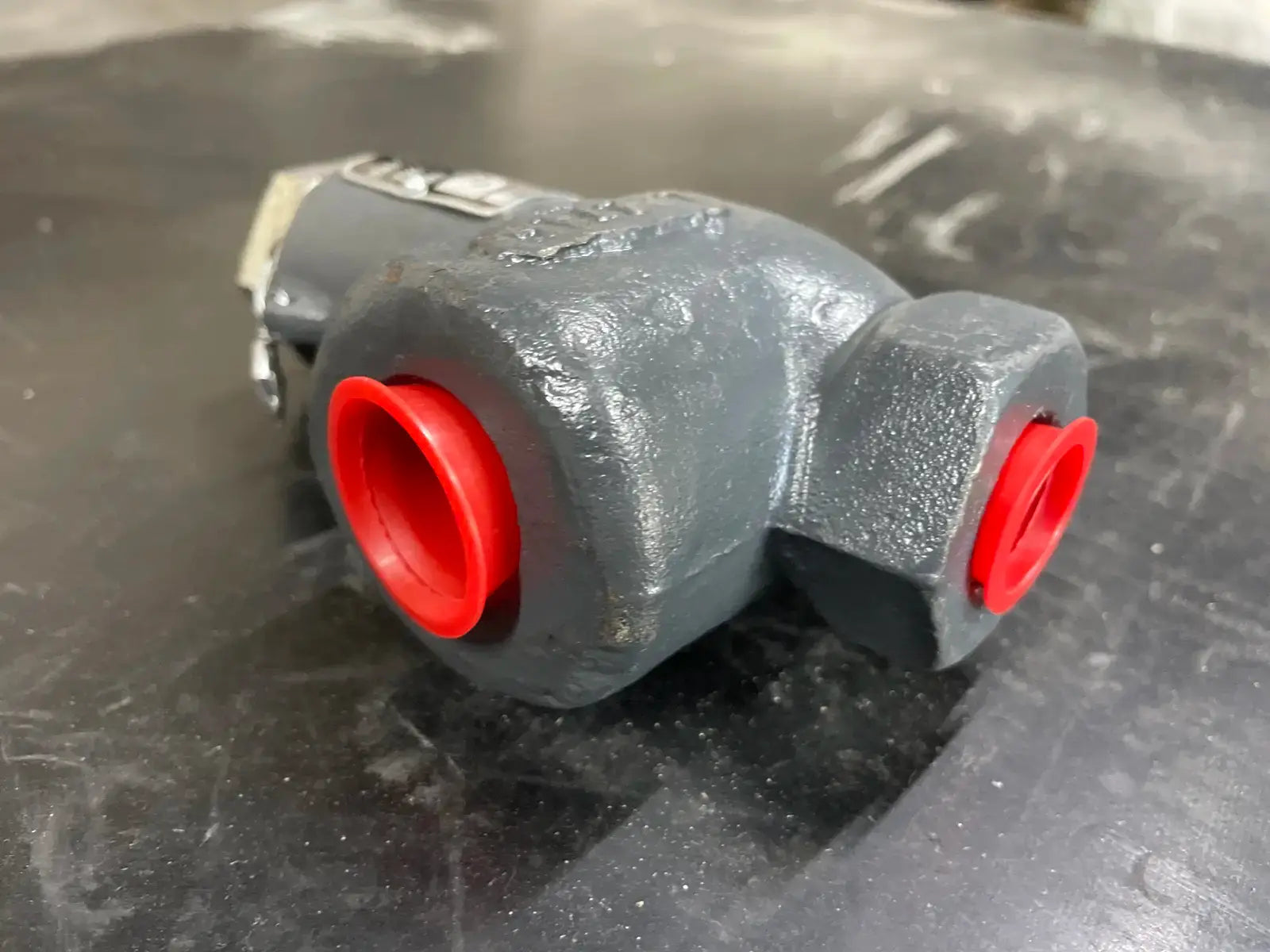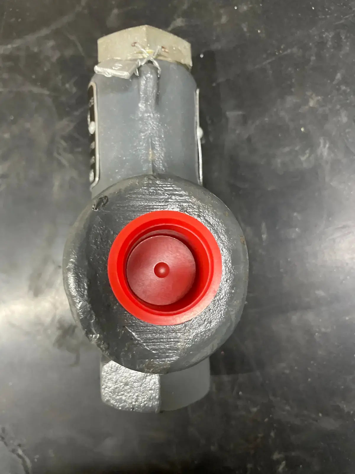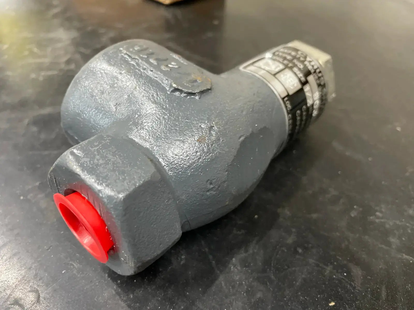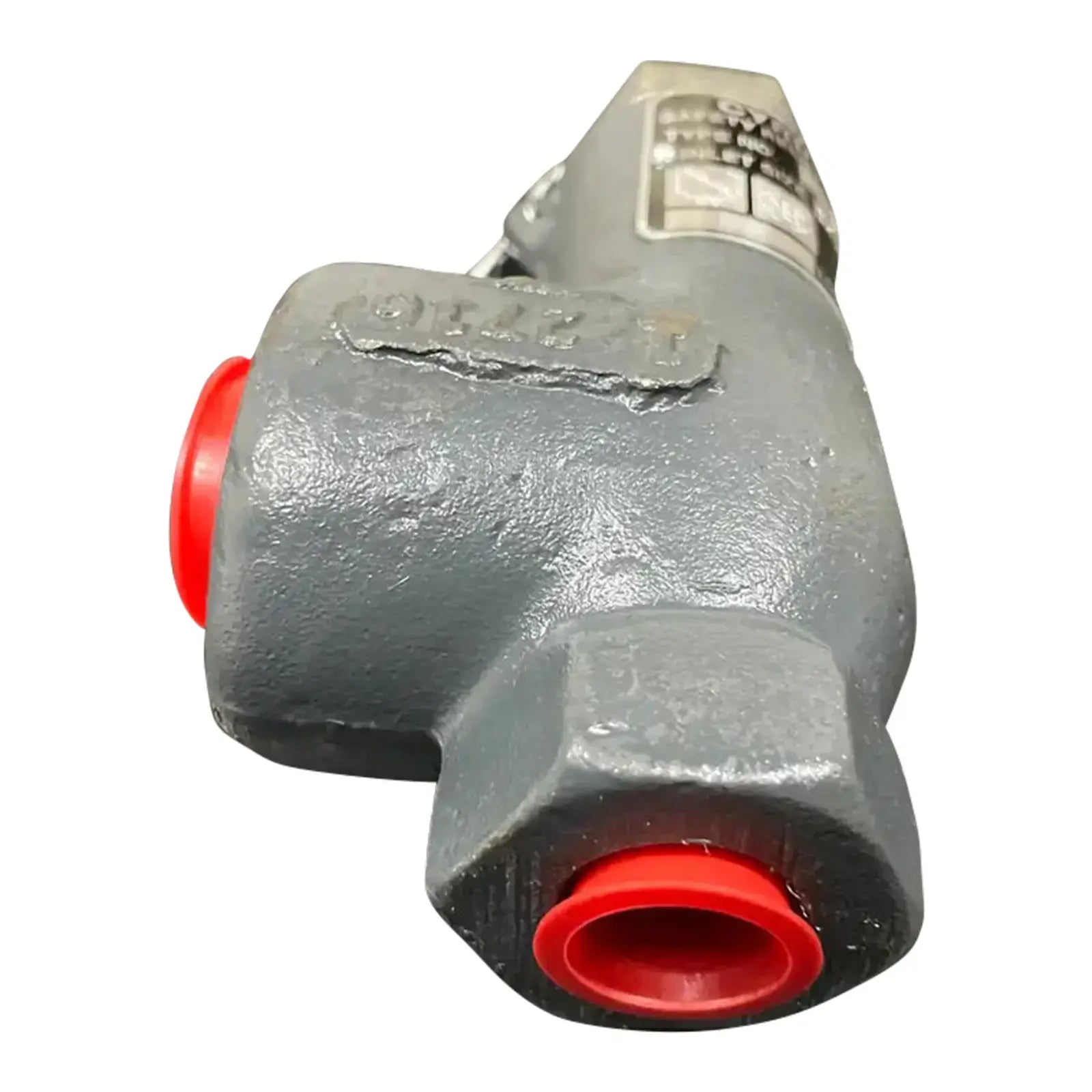 Válvula de alivio de seguridad para refrigerante Cyrus Shank. Número de tipo: 803. Número de serie: 114071. Tamaño de entrada: 1/2 FNPT. Tamaño de salida: 3/4 pulg. FNPT. Material del cuerpo: Fundición de hierro dúctil.