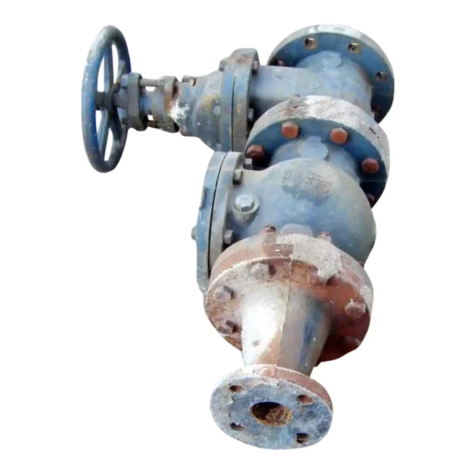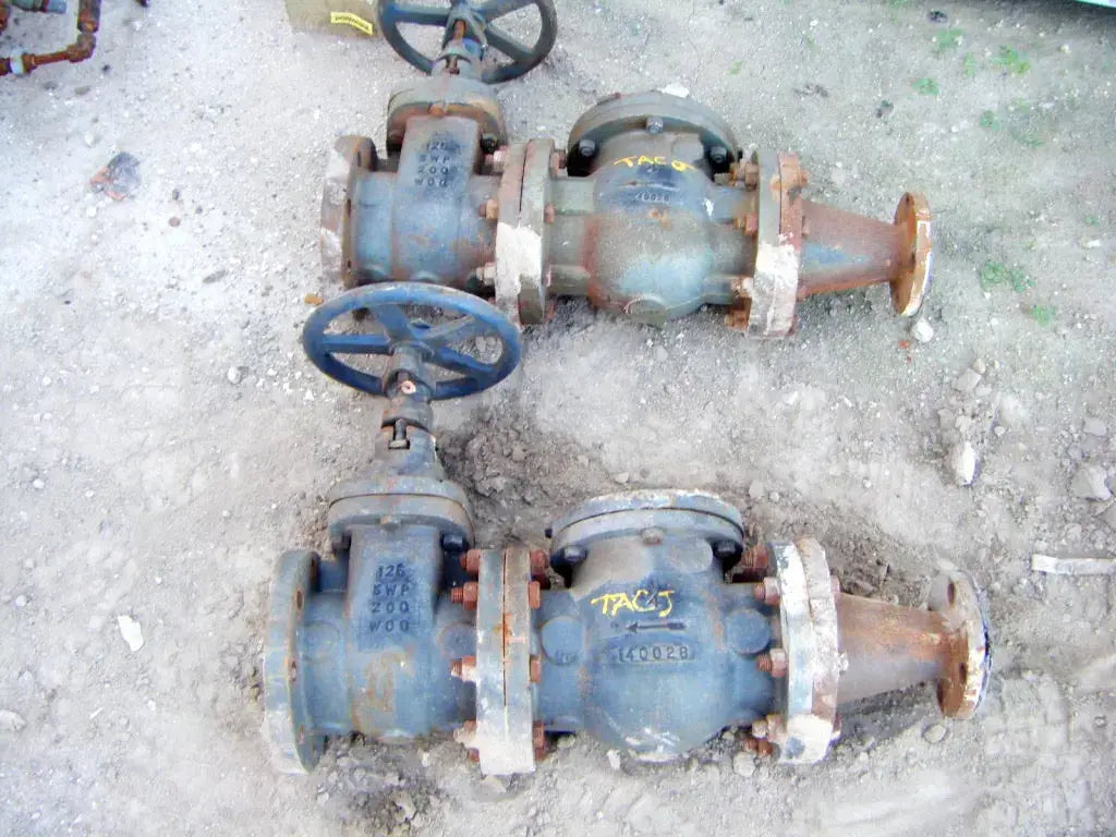 Válvula de compuerta de 4 pulg. conectada a una válvula de retención de 4 pulg. conectada a un reductor de 4 pulg. a 2 pulg. Dimensiones totales: 2 pies 4 pulgadas de largo x 9 pulgadas de ancho x 1 pie 8-1/2 pulgadas de alto.