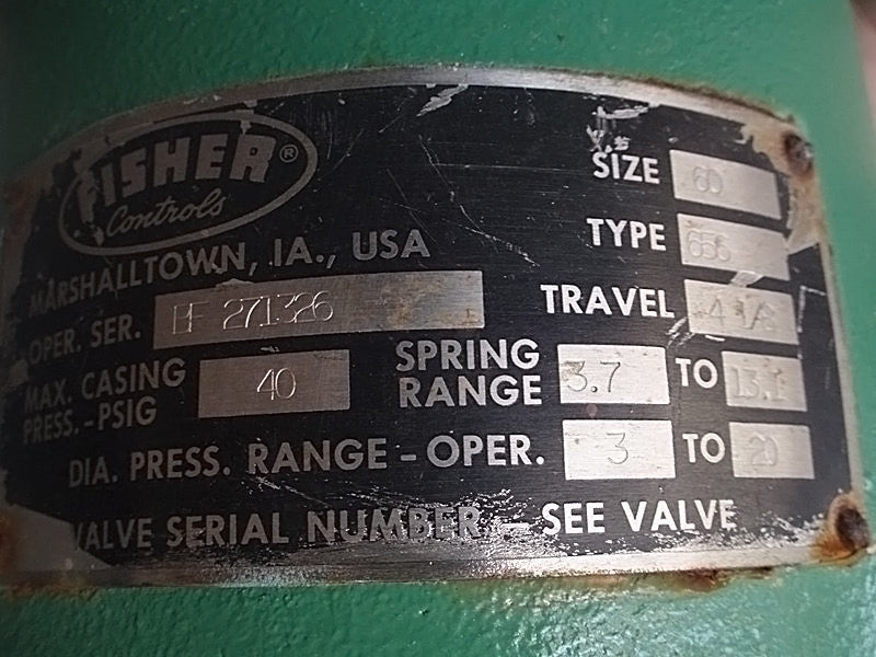 Válvula de control de mariposa Fisher. Tipo: 9510. Tamaño: 12 pulg. Estilo de cuerpo: sin bridas. Clase ANSI: 125. Clasificación corporal: 175 PSI. Diferencial: 50 PSID. Material de la carrocería: A 126 CLB. Rotación de la válvula: 90°. Tamaño del actuador: 60. Rango de resorte: 3,7 a 13,1. Conexión del actuador: ¼ pulg. NPT Material del diafragma: nitrilo. Entradas/Salidas: (2) Puerto de 12 pulg. Dimensiones totales: 2 pies 11 pulgadas de largo x 1 pie 6 pulgadas de ancho x 4 pies 1 pulgadas de alto (H12) (ACN187)