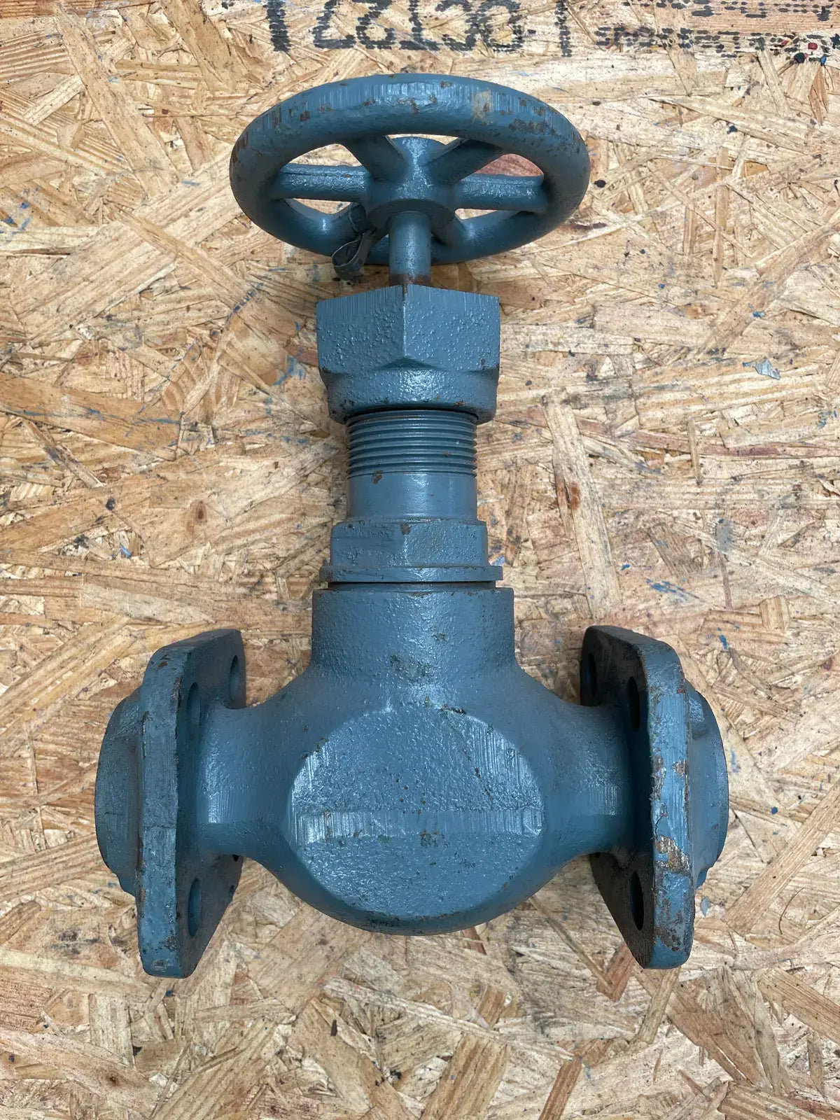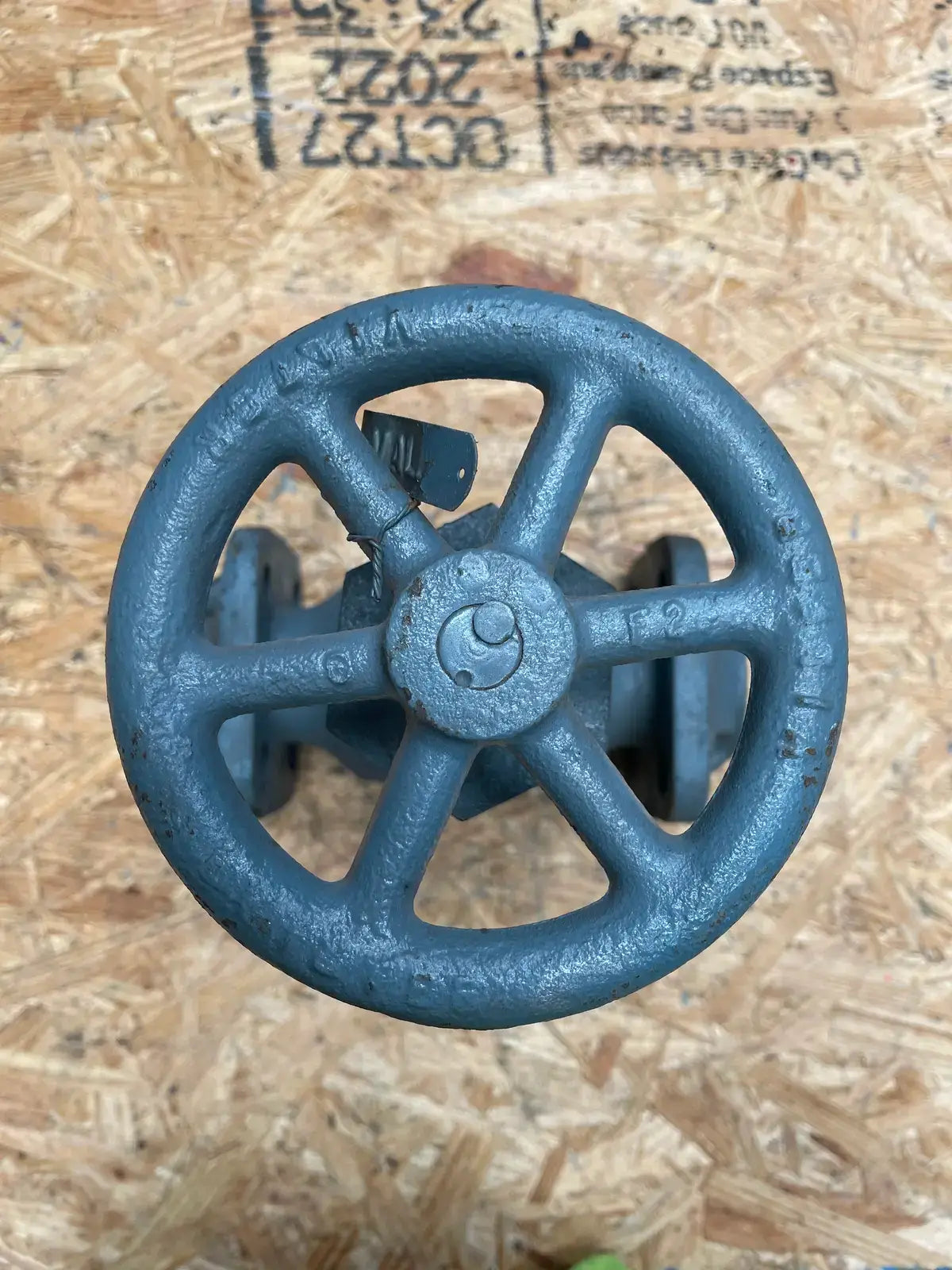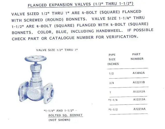 Válvula de expansión con brida Vilter con bridas de 4 pernos (cuadrados) con bonetes de tornillo (redondos). Tipo de apagado: volante. Tamaño de tubería (pulgadas): 1 1/2 pulgadas.