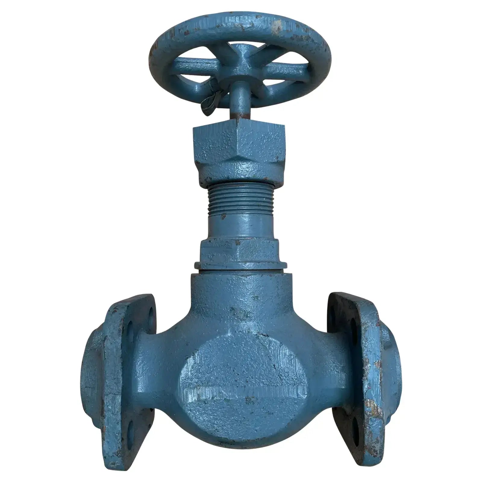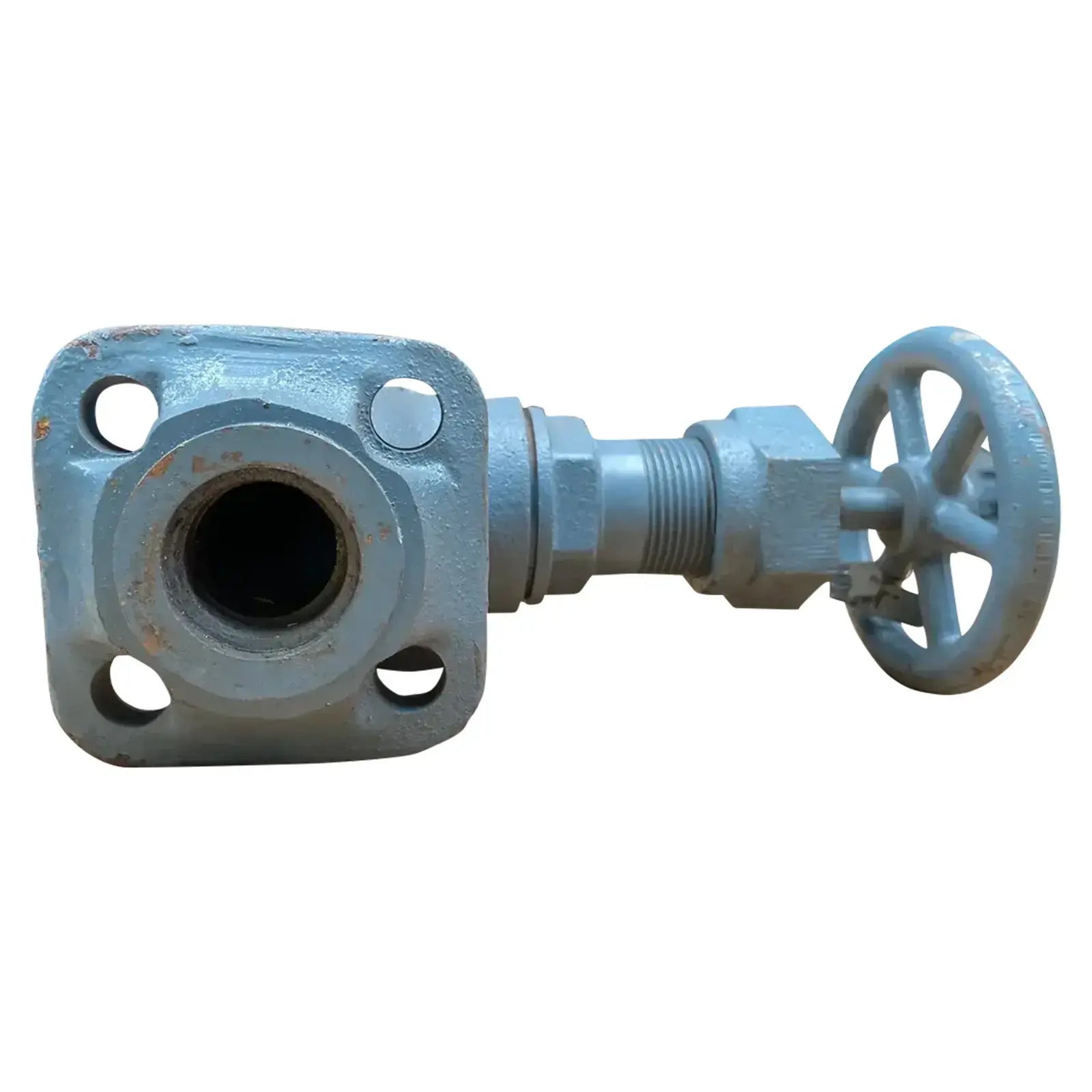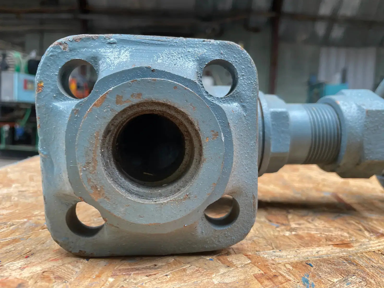 Válvula de expansión con brida Vilter con bridas de 4 pernos (cuadrados) con bonetes de tornillo (redondos). Tipo de apagado: volante. Tamaño de tubería (pulgadas): 1 1/2 pulgadas.