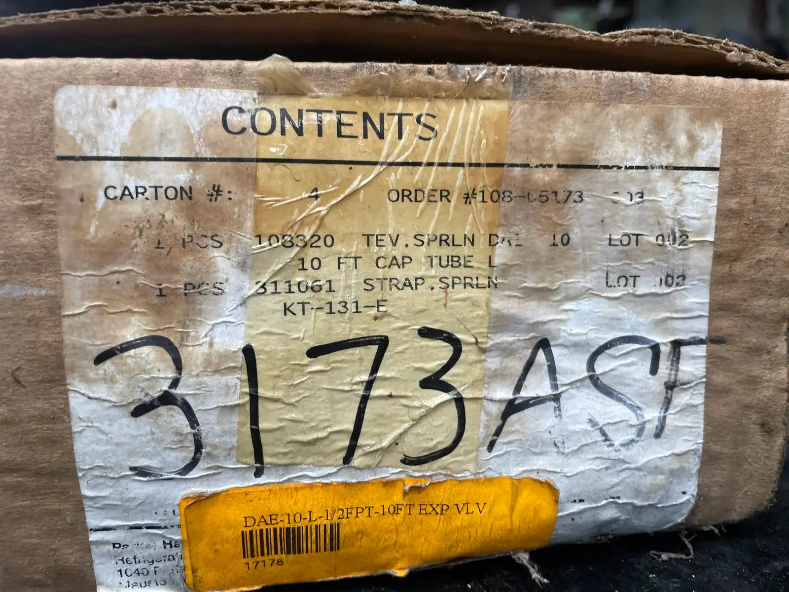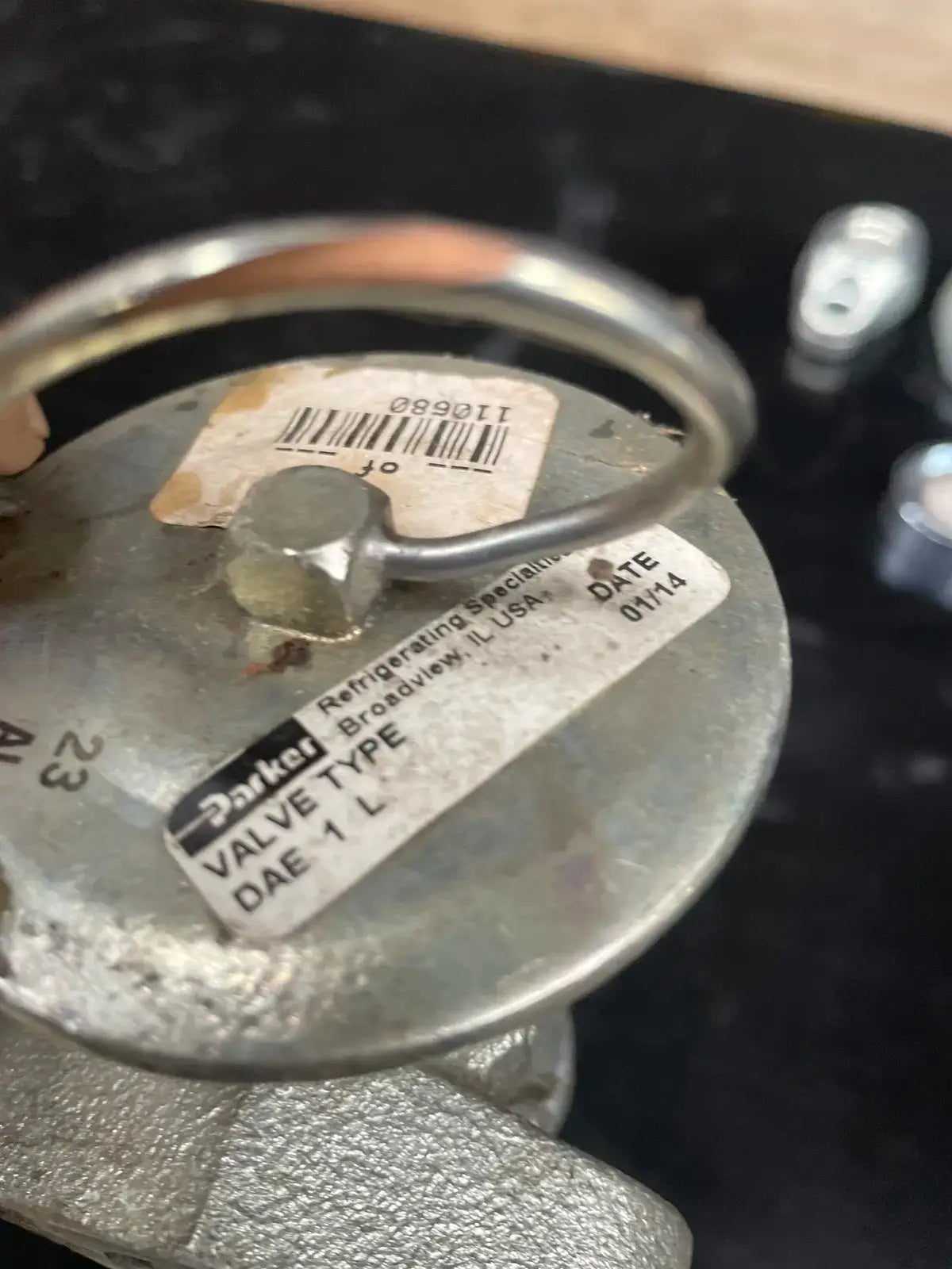 Válvula de expansión de refrigeración Parker sin usar con suministros. Modelo: DAE-10-L. Tamaño: Entrada 1/2 FPT x Salida 1/2 FPT con brida.