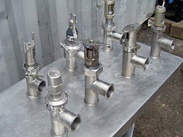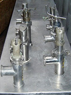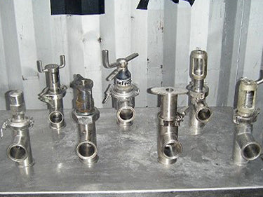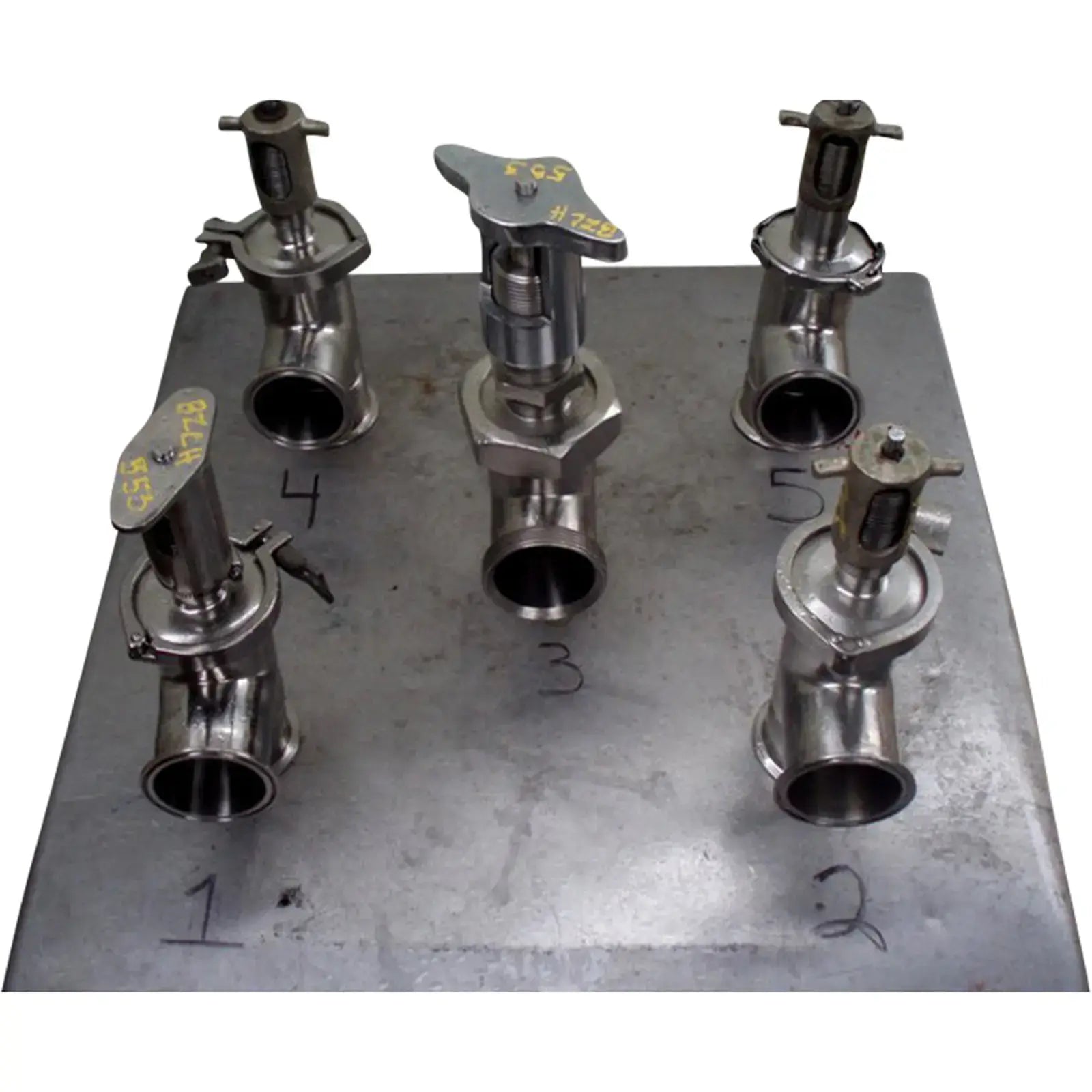 (7) Válvulas de compresión de tornillo de acero inoxidable. (6) Las válvulas tienen entradas/salidas de: (2) 2 pulg. de diámetro. Accesorio S-Line. (1) Las válvulas tienen entradas de: (1) 2 pulg. de diámetro. Accesorio S-Line. Salida: (1) tubería recta de acero inoxidable de 2 pulgadas. Dimensiones generales típicas: 6 pulgadas de largo x 3 pulgadas de ancho x 12 pulgadas de alto (válvula completamente recuperada).