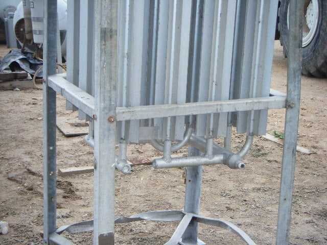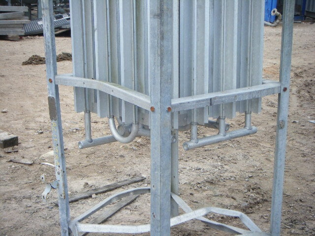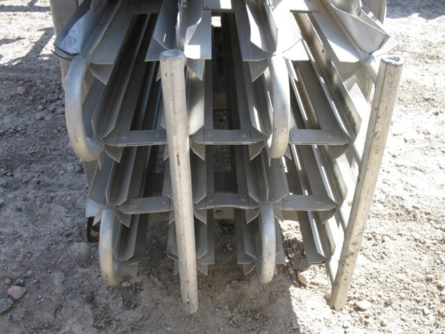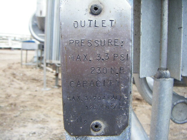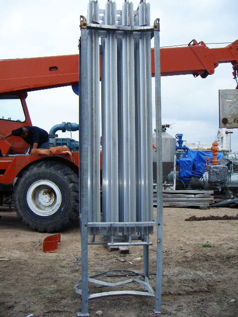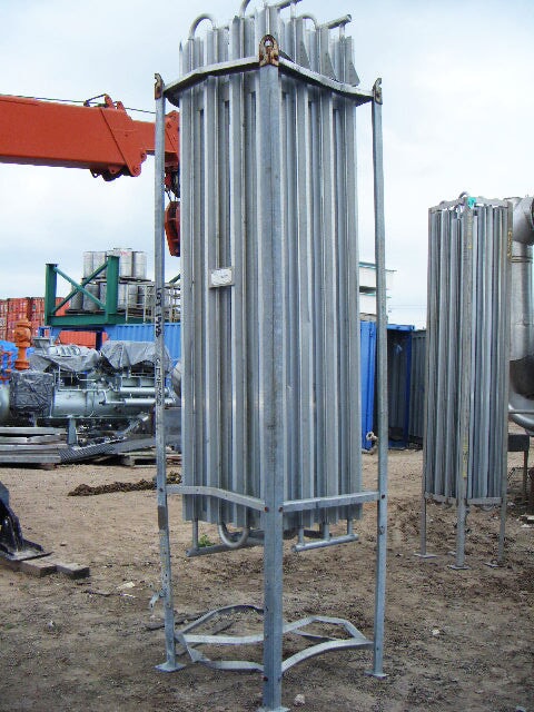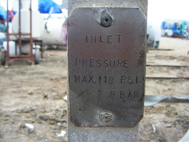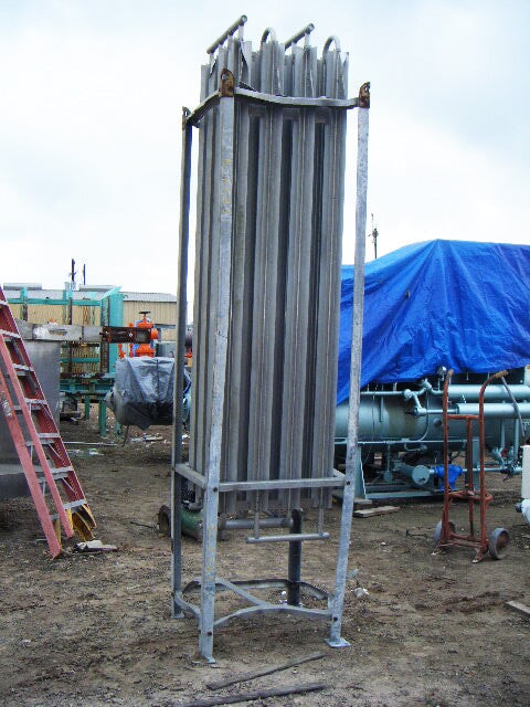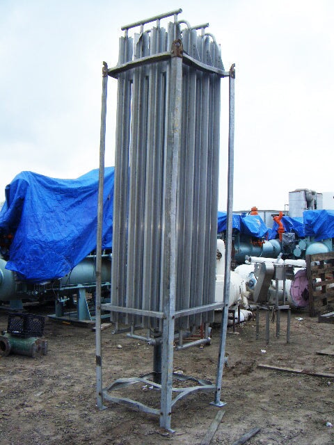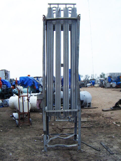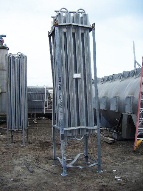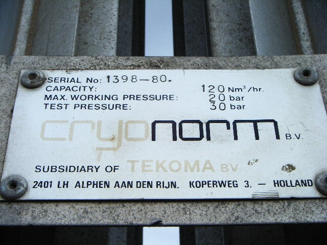 Vaporizador criogénico Tekoma Cryonorm. Capacidad nominal: 120 Nm³/8 h según el uso de oxígeno en condiciones ambientales de +4 °C de temperatura ambiente, 75 % de humedad relativa y flujo de aire de 1 m/s. Presión máxima de trabajo: 290 PSI (20 bar). Presión de prueba: 435 PSI (30 bar). Presión de entrada máxima: 116 PSI. Presión de salida máxima: 3,3 PSI (230 MB) (16) 1-1/8 pulg. de diámetro. Tubos con (8) aletas por tubo: 8 pies 2-1/2 pulg. L. Entrada: (1) MNPT de 1 pulg. Salida: (1) puerto de 1 pulg. Los vaporizadores criogénicos están diseñados para convertir gases licuados en estados gaseosos. Las aplicaciones incluyen: LOX, LIN y LAR. Dimensiones totales: 3 pies 3 pulgadas de largo x 2 pies 11-1/8 pulgadas de ancho x 11 pies 1-1/2 pulgadas de alto.
