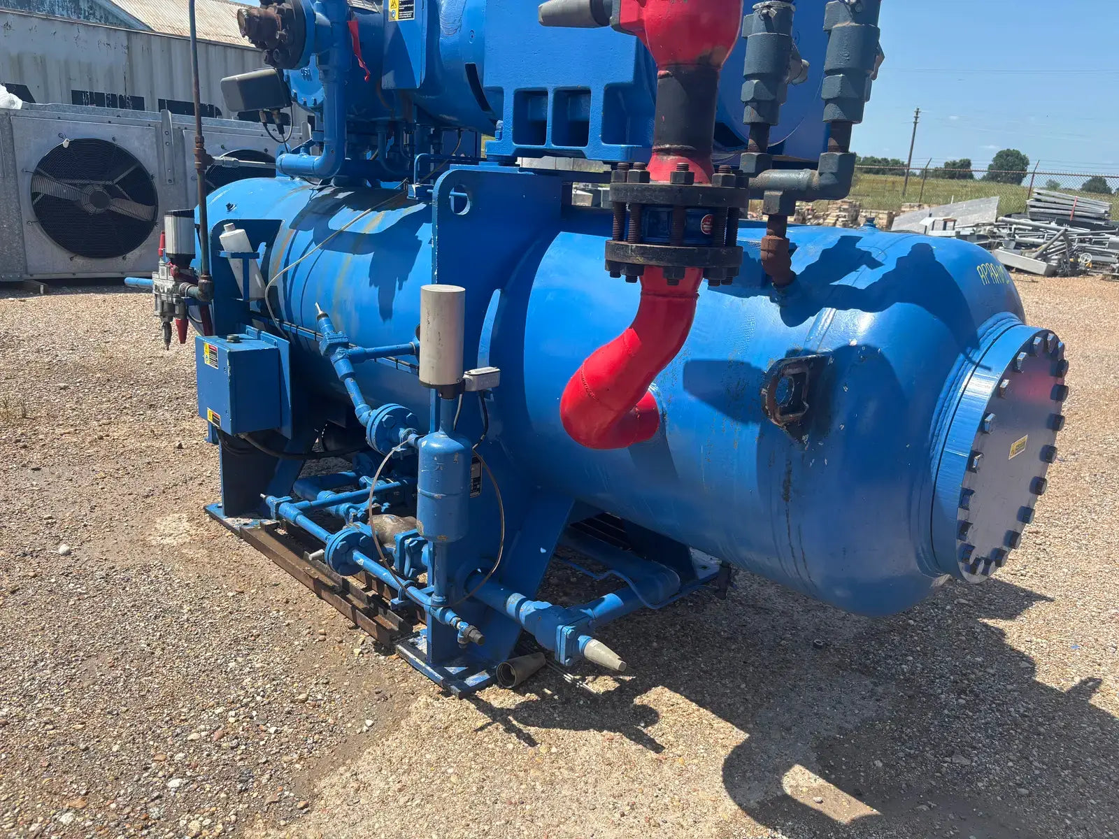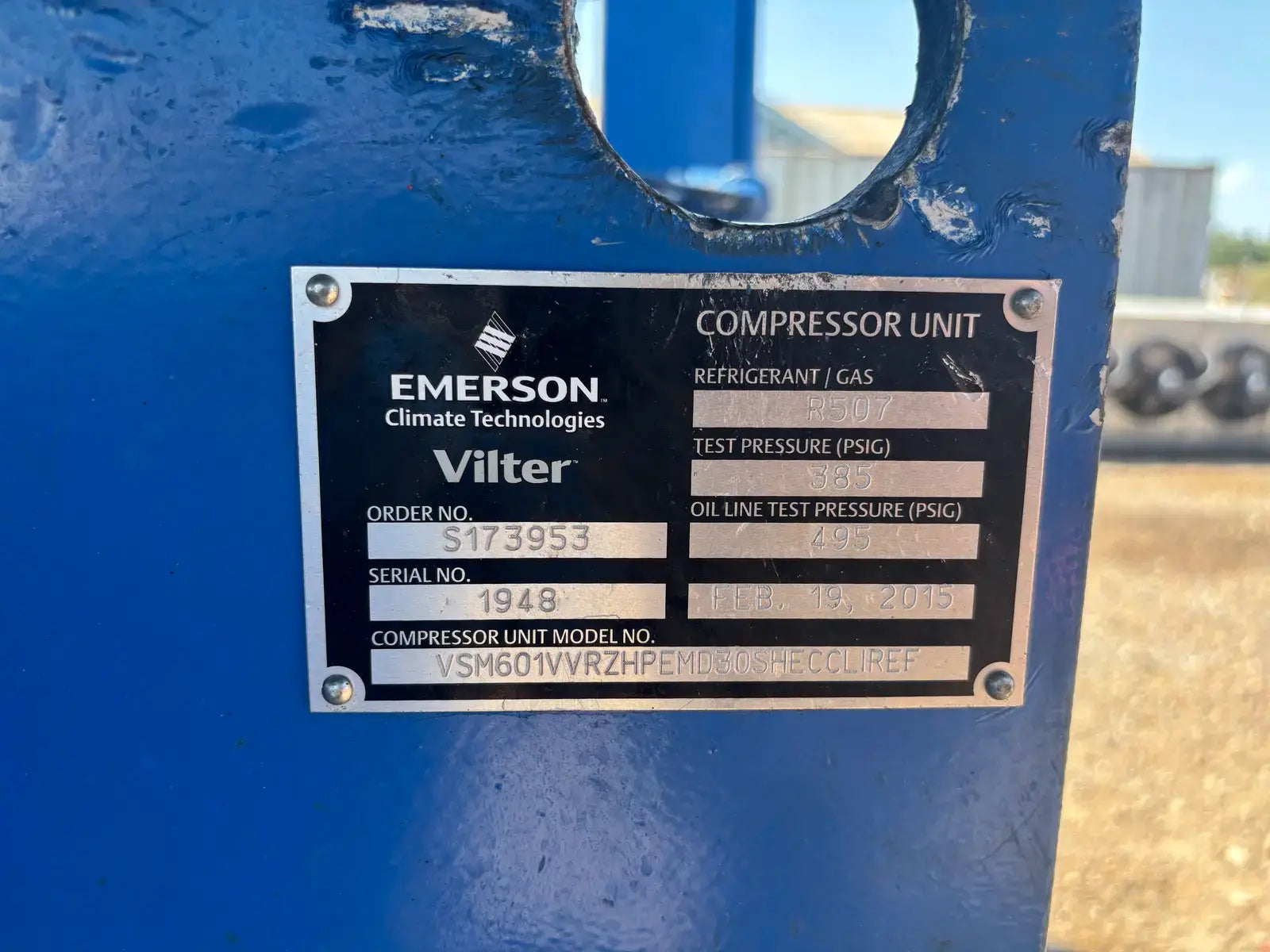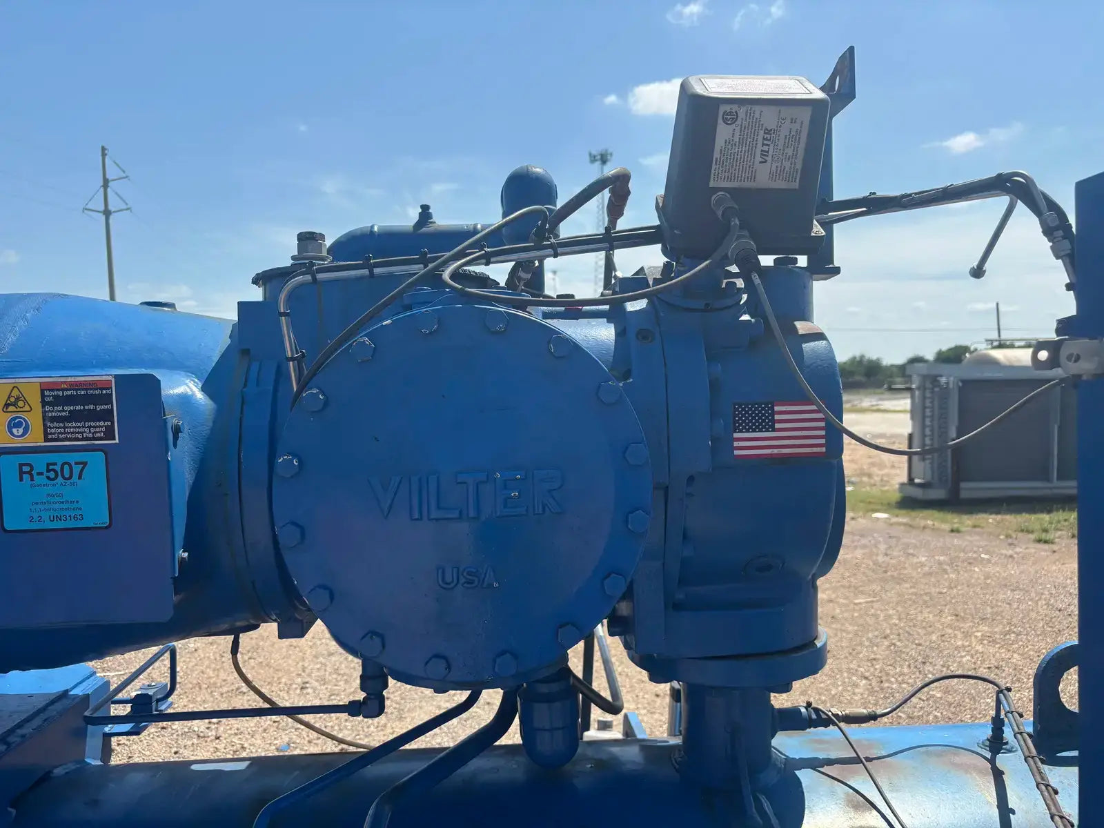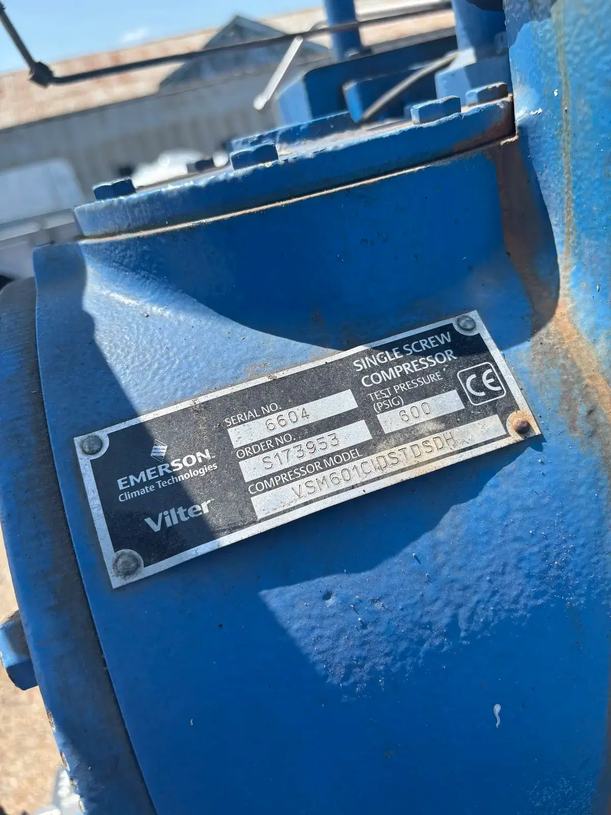 Compresor de tornillo rotativo Vilter VSM. Modelo: VSM601VVRZHPEMD30SHECCLIREF. N.° de serie: 1948. N.° de pedido: S173953. Refrigerante/gas: R-507. Presión de prueba (PSIG): 385. Presión de prueba de la línea de aceite (PSIG): 495. Compresor de tornillo simple Vilter - N.° de serie: 6604, N.° de pedido: S173953, Modelo de compresor: VSM601CIDSTDSDH, Presión de prueba (PSIG): 600. Certificado por la Junta Nacional de Separadores de Aceite Vilter: 1937, Presión máxima de trabajo (MAWP): 400 PSIG a 400 °F, Presión máxima de trabajo (MDMT): -20 a 400 PSIG.