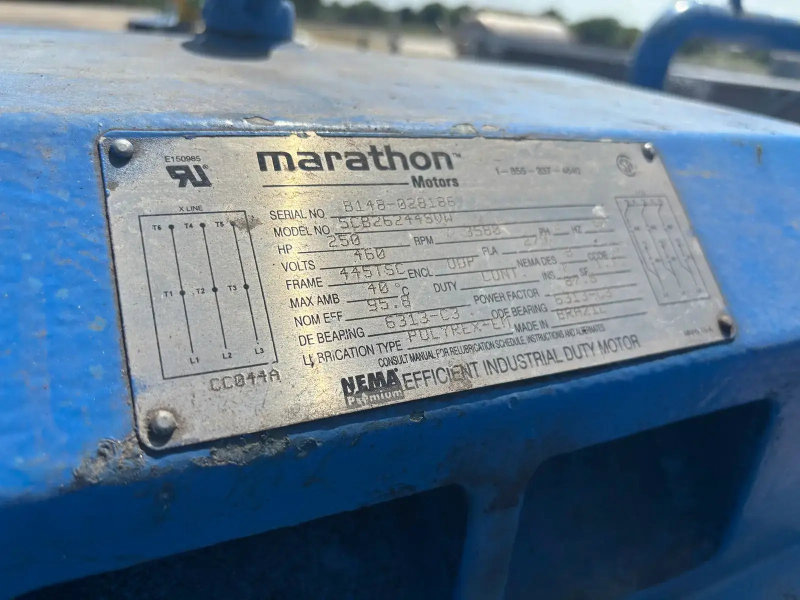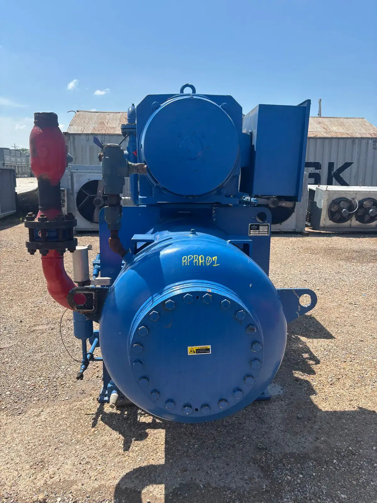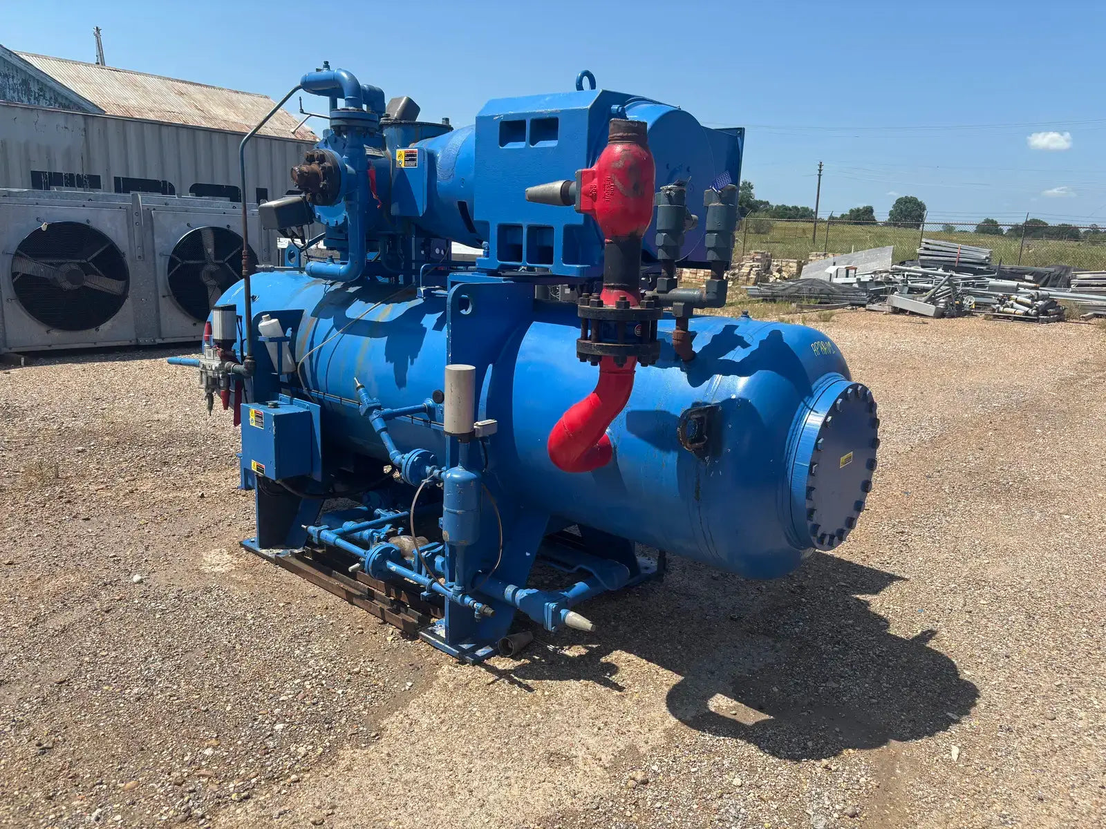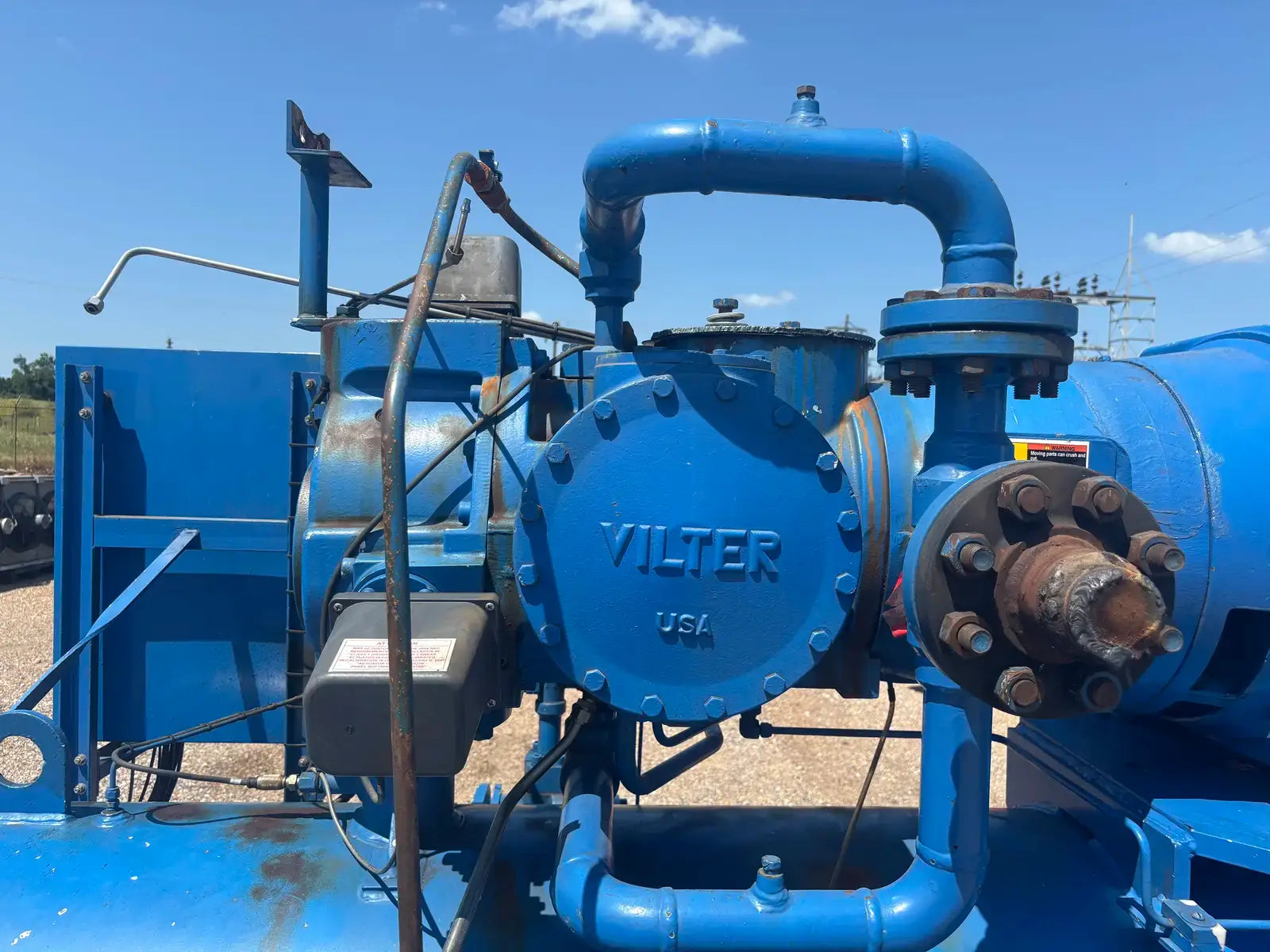 Compresor de tornillo rotativo Vilter VSM. Modelo: VSM601VVRZHPEMD30SHECCLIREF. N.° de serie: 1948. N.° de pedido: S173953. Refrigerante/gas: R-507. Presión de prueba (PSIG): 385. Presión de prueba de la línea de aceite (PSIG): 495. Compresor de tornillo simple Vilter - N.° de serie: 6604, N.° de pedido: S173953, Modelo de compresor: VSM601CIDSTDSDH, Presión de prueba (PSIG): 600. Certificado por la Junta Nacional de Separadores de Aceite Vilter: 1937, Presión máxima de trabajo (MAWP): 400 PSIG a 400 °F, Presión máxima de trabajo (MDMT): -20 a 400 PSIG.