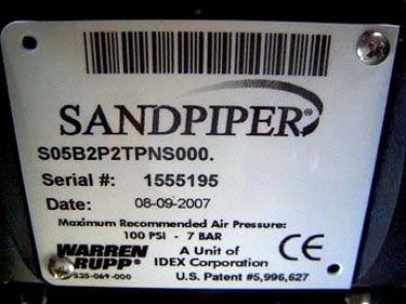 2007 Bomba de doble diafragma Warren Rupp Sandpiper. Modelo: S05B2P2TPNS000. Capacidad aproximada: 14 gpm. Maneja sólidos de hasta 0,125 pulg. (3 mm) de tamaño. Rangos de temperatura de funcionamiento: 180°F a 32°F. Presión de aire máxima recomendada: 100 psi. Cuenta con una válvula de retención de bola sólida alimentada por aire comprimido y con un diseño de relación 1:1. Material mojado: polipropileno. Materiales de construcción del diafragma/válvula de retención: PTFE virgen-Santoprene/asiento de la válvula de retención de PTFE virgen de respaldo: PTFE virgen. (1) Entrada MNPT de ¾ pulg. (1) Salida MNPT de ¾ pulg. (1) Entrada de línea aérea FNPT de ½ pulg. Peso de envío: 16 libras. Dimensiones totales: 10-1/8 pulgadas de largo x 7-1/4 pulgadas de ancho x 11-1/4 pulgadas de alto (ACN7).
