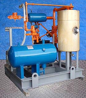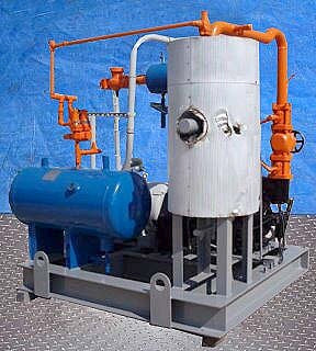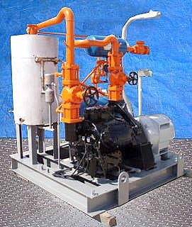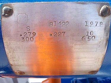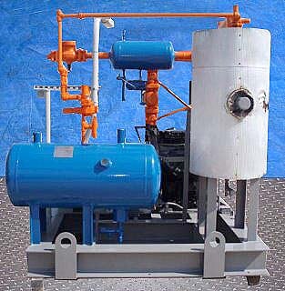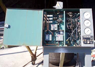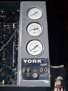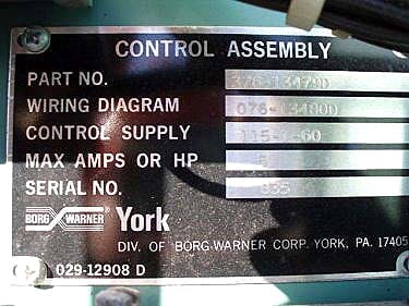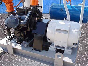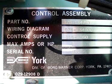 Compresor alternativo York R-Series de 6 cilindros - 75 HP. Modelo: RW64-717A. Número de serie: HY0433288081202. Nat'l Bd: 53205. Presión de prueba alta/baja: 450/330 psig. Refrigerante: R-717 amoniaco. Características: cabezales enfriados por agua, carrera de 4,5 pulgadas. Clasificación CFM a 1170 RPM: 201 CFM. Temperatura mínima de succión: -15 F (90 F de condensación), 0 F (105 F de condensación), +15 F (120 F de condensación). Motor eléctrico Marathon, 75 hp, 1185 rpm, 230/460 V, 196/98 amperios, 60 Hz, trifásico. (2) Tanques receptores: 50 Galones. Control de nivel de líquido Magnetrol. Dimensiones totales: 82 pulgadas de largo x 72 pulgadas de ancho x 88 pulgadas de alto (H12) (ACN237).