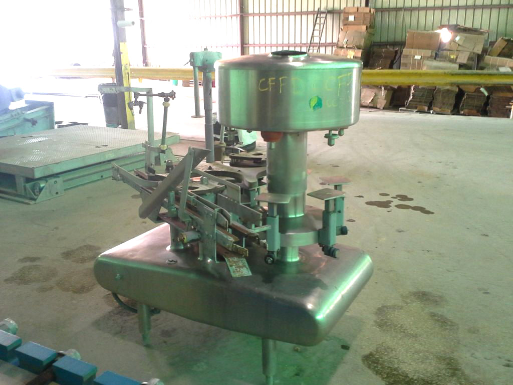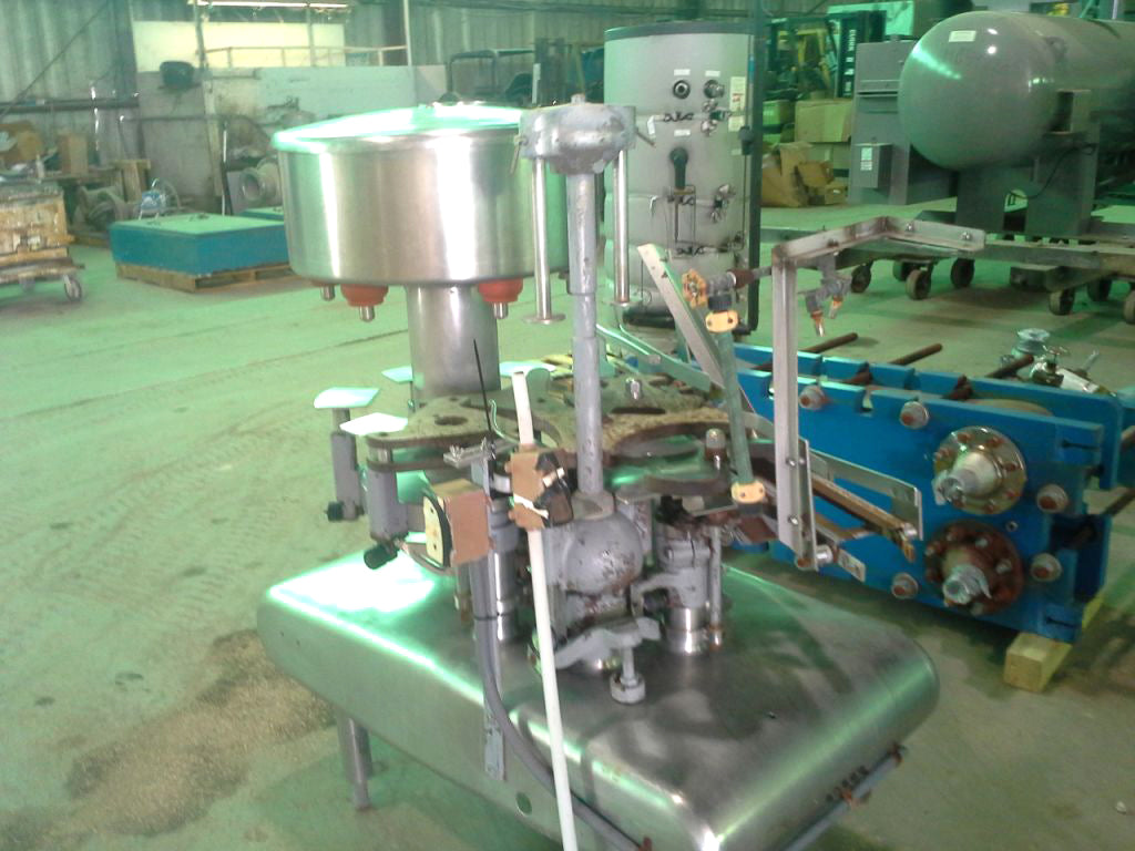 6-Head Rotary Filler. Model: AG62. (6) 1-1/4 in. dia. nozzles will fill 8-1/2 in. H (max) bottle. Distance between valves: 10 in. Conveyor: 3-1/2 in. W x 48 in. L. Infeed height: 33 in. (adjustable). Exit height: 32 in. (adjustable). Infeed Tank- 19 gal., inside dimensions: 24 in. dia. x 10 in. H. Unit features a tamping foot for press-on caps, less chute. Baldor Industrial Motor, 1/2 hp, 208-230/460 V, 3.4-3.2/1.6 amps, 60 Hz, 3 phase. Overall dimensions: 55 in. L x 44 in. W x 56 in. H.