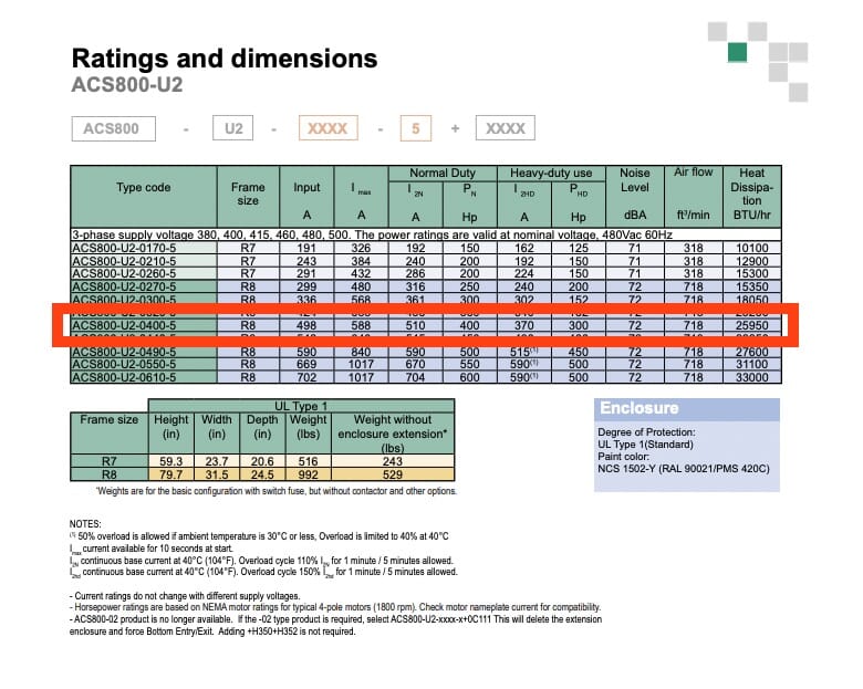 ABB adjustable frequency inverter. Type: ACS800-U2-0400-5. Frame Size: R8. Input Amps: 498. Input Max Amps: 588. Normal Duty - 510 Amps, 400 HP. Heavy Duty Use - 370 Amps, 300 HP. Noise Level(dBA): 72. Air Flow(ft3/min): 718. Heat Dissipation(BTU/hr): 25950. Overall Dimensions: 80H x 32 W x 25 Depth. Weight: 992 LBS. The power ratings are valid at nominal voltage, 480 VAC/60Hz.