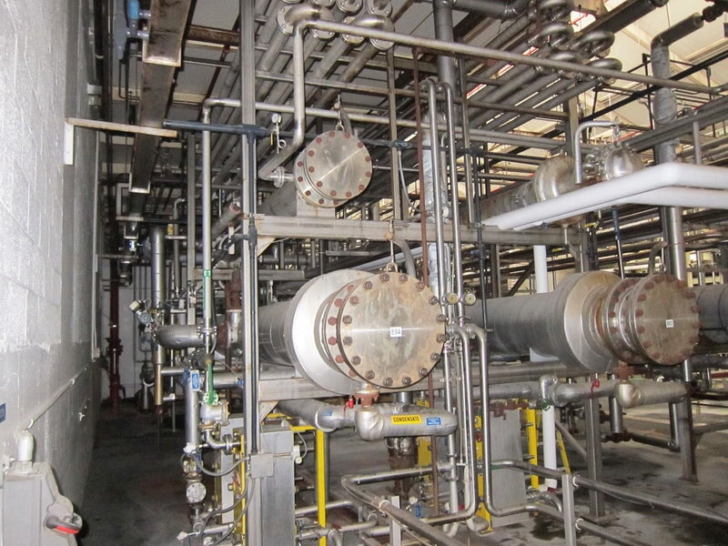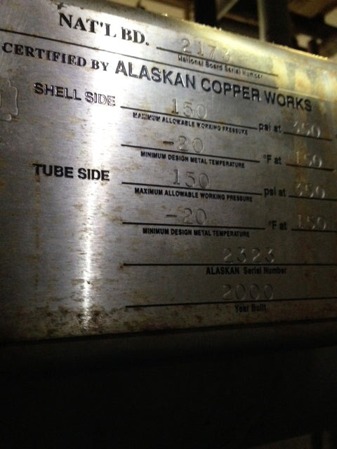 Advance Process Sterilizer Unit. S/N: 2330. Stainless steel, (2) tube in tube heat exchangers, (1) cooling tube, 150 psi @ 400ºF, 18 in. dia x 20 ft. L, (2) AGC ProHX-F plate heat exchangers, connecting valve & steam trap. Certified by Alaskan Copper Works. Shell: 150 PSI at 350F, -20F at 150 PSI. Tubes: 150 PSI at 350F, -20F at 150 PSI. Year: 2000. S/N: 2323.