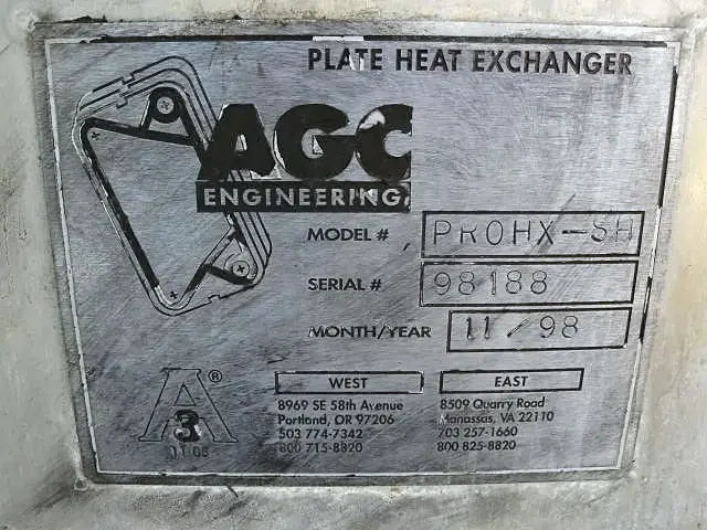 1998 AGC Proflow™ Plate Heat Exchanger Frame. Model: PROHX-SH Serial No: 98188. Overall dimensions: 3 ft. 7-1/2 in. L x 1 ft. 8-1/2 in. W x 5 ft. 3 in. H.