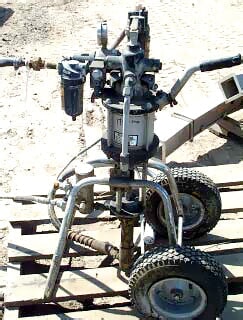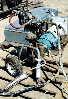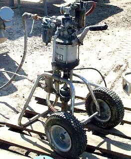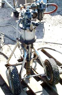 Air Operated Floor Line Painter and Cart. Mfg. Speedflo. Model 530-232. S/N 4-5-0. Motor No. 525-555. Pump No. 145-690. Max Working Pressure 3,000 psi. Overall dimensions: 21-½ in. W, 29 in. L, 37 in. H.