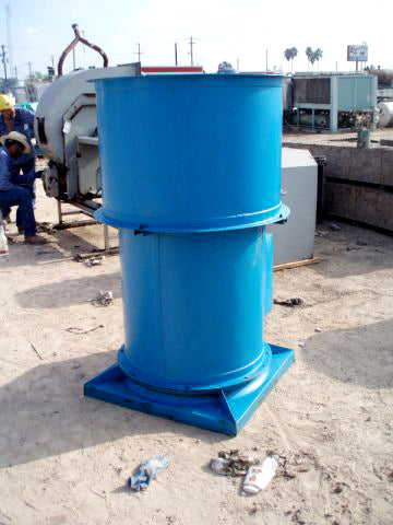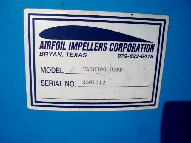 2001 Airfoil Belt Drive Tube Axial Stack - Cap Roof Ventilator. Model: TASC300103BD. Fan diameter: 30 in. Cast aluminum blades. Air flow: 8,961 cfm @ .25 sp. The Airfoil design is highly efficient. Designed to move large volumes of air at low operating cost, the blades are non-overloading to prevent motor burnout. Baldor industrial motor, 3/4 hp. Inlets/outlets: (2) 3 ft. dia. ports. Overall dimensions: 4 ft. L x 3 ft. 4 in. W x 5 ft. 7 in. H.(ACN25a).