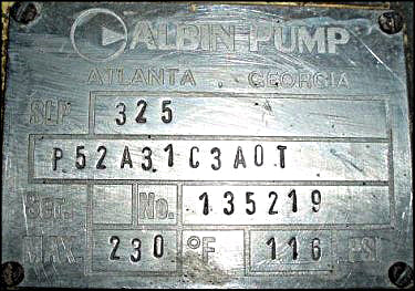 Albin Positive Displacement Pump. Model: P52A31C3A0T. S/N: 135219. MAWP: 116 psi @ 230 °F Max. Reliance electric motor, 10 hp, 1160 rpm, 230/460 V, 27/13.5 amps, 60 Hz, 3 phase. Motor pulley diameter: 5-3/4 in. Gear pulley diameter: 18-3/4 in. 355 rpm (final). Inlets/outlets: (2) 2-1/2 in. dia. S-line fittings. Overall dimensions: 3 ft. 9 in. L x 2 ft. 2 in. W x 2 ft. H.