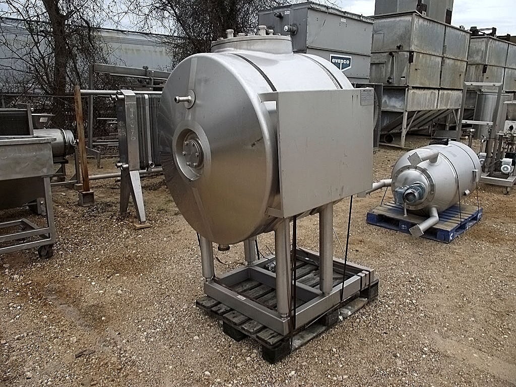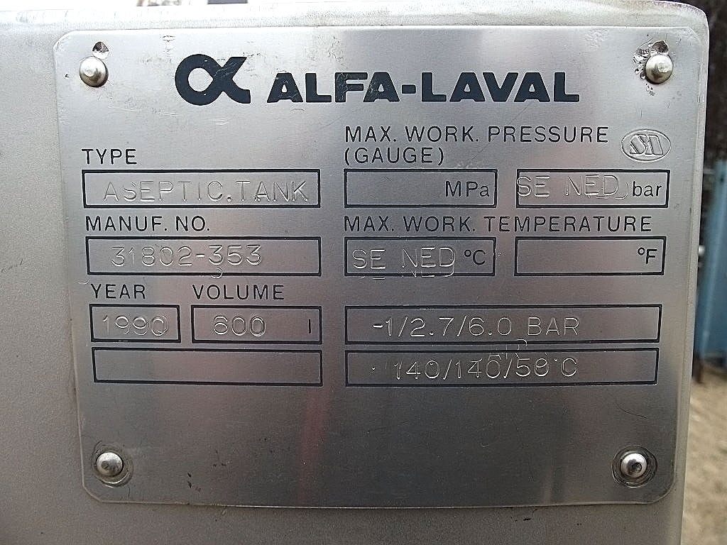 Alfa-Laval Stainless Steel vessel, single shell mix tank with agitator/sprayball. Type: Aseptic Tank. Manufacturer’s number: 31802-353. Max working pressure: SE NED bar. Max working temperature: SE NED degrees C. Year: 1990. Volume: 600 L (158 gallons). Ratings listed on nameplate: -1/2.7/6.0 BAR, 140/140/50 degrees C (-14.5 / 39 / 87 PSI, 284F / 284F / 122F temp). Overall dimensions: 56 in. L x 46 in. W x 80 in. H
