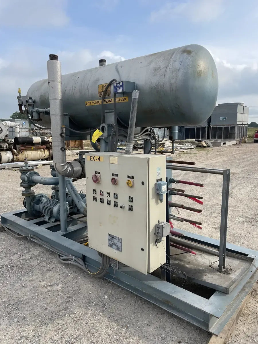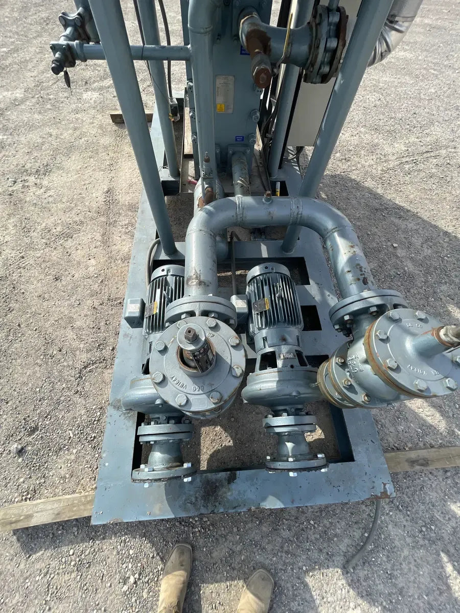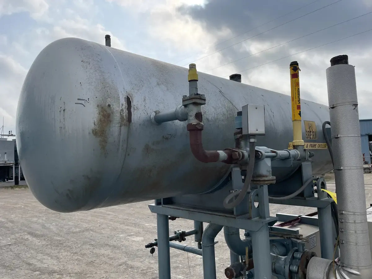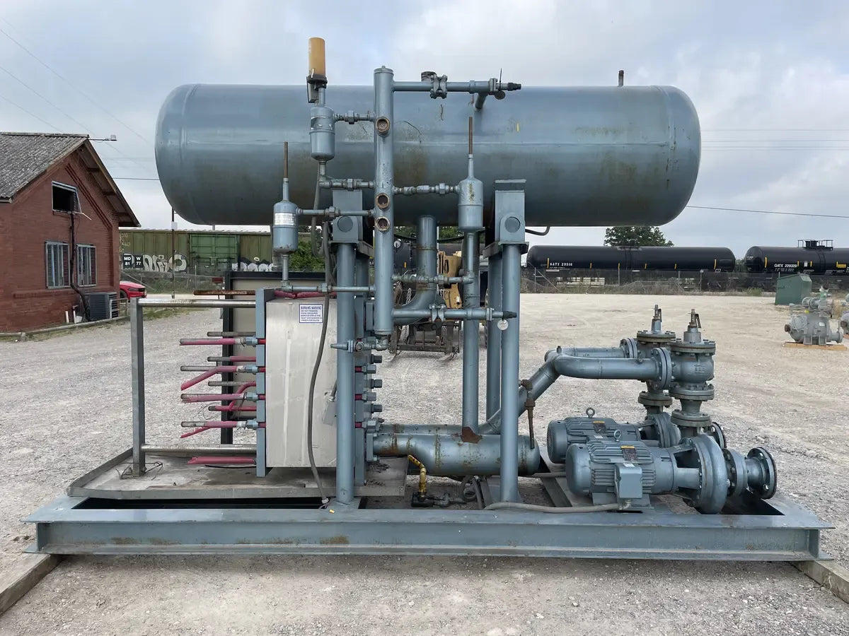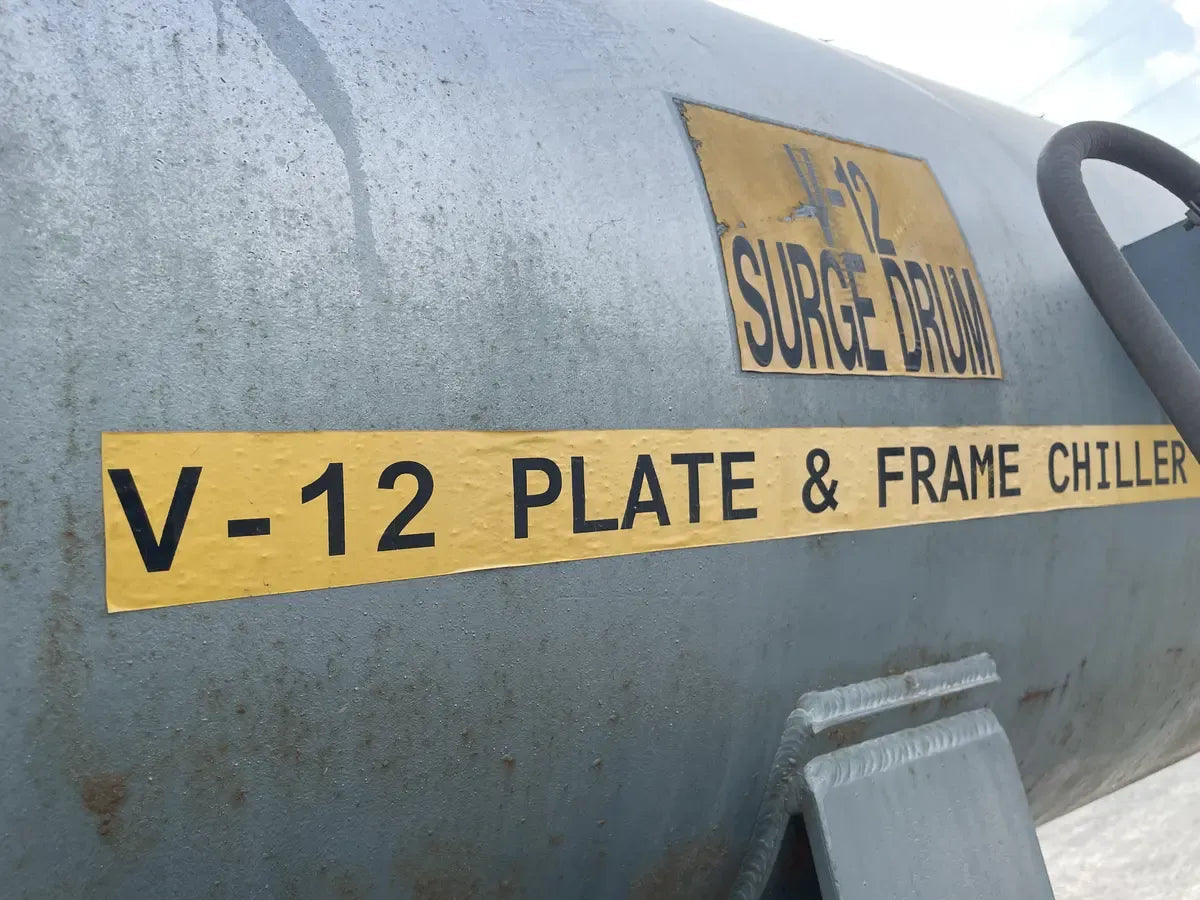 1999 M&M Ammonia-Glycol Chilling System Skid. The Skid Comes in a whole Skid together with a control panel, (2) centrifugal pumps, Horizontal Ammonia Surge Drum, Alfa Laval Plate, Frame Heat Exchanger, and a Glycol Tank. Previously used at Ryan Foods, Murray Kentucky. Date Manufactured: November 24, 1999. Serial No: 99-1907. Model: CWP-CS-OS-I. System Information. Single Point Power Connection - 460V/3PH/60HZ. Minimum Power Feed Amp: 50 AMPS. Chilled Process Pump 1: Pump Model: C810AM, Pump Horsepower: 20, Pump RPM: 3500, Pump Flow (GPM): 90, Design Head(FT): 220. Chilled Process Pump 2: Pump Model: C810AM, Pump Horsepower: 20, Pump RPM: 3500, Pump Flow (GPM): 90, Design Head(FT): 220. Total sq.ft: 408.20. Alfa Laval Plate and Frame Heat Exchanger. Model: 10-BWFD, Serial No: 3011065821, Mfg Year: 2006. MAWP: 150/300 PSI @ 150 F. MDMT: 20 F @ 150/300 PSI. Area: 408.20 SQ. Ft. A-Dim: 482MM W/80. Sales Order: 634017. M&M Horizontal Ammonia Surge. National Board: 2662, Year Built: 2006. MAWP: 300 PSIG @ 200 F. MDMT: 0 F @ 300 PSIG. Mfr. Ser. No: 06A117.