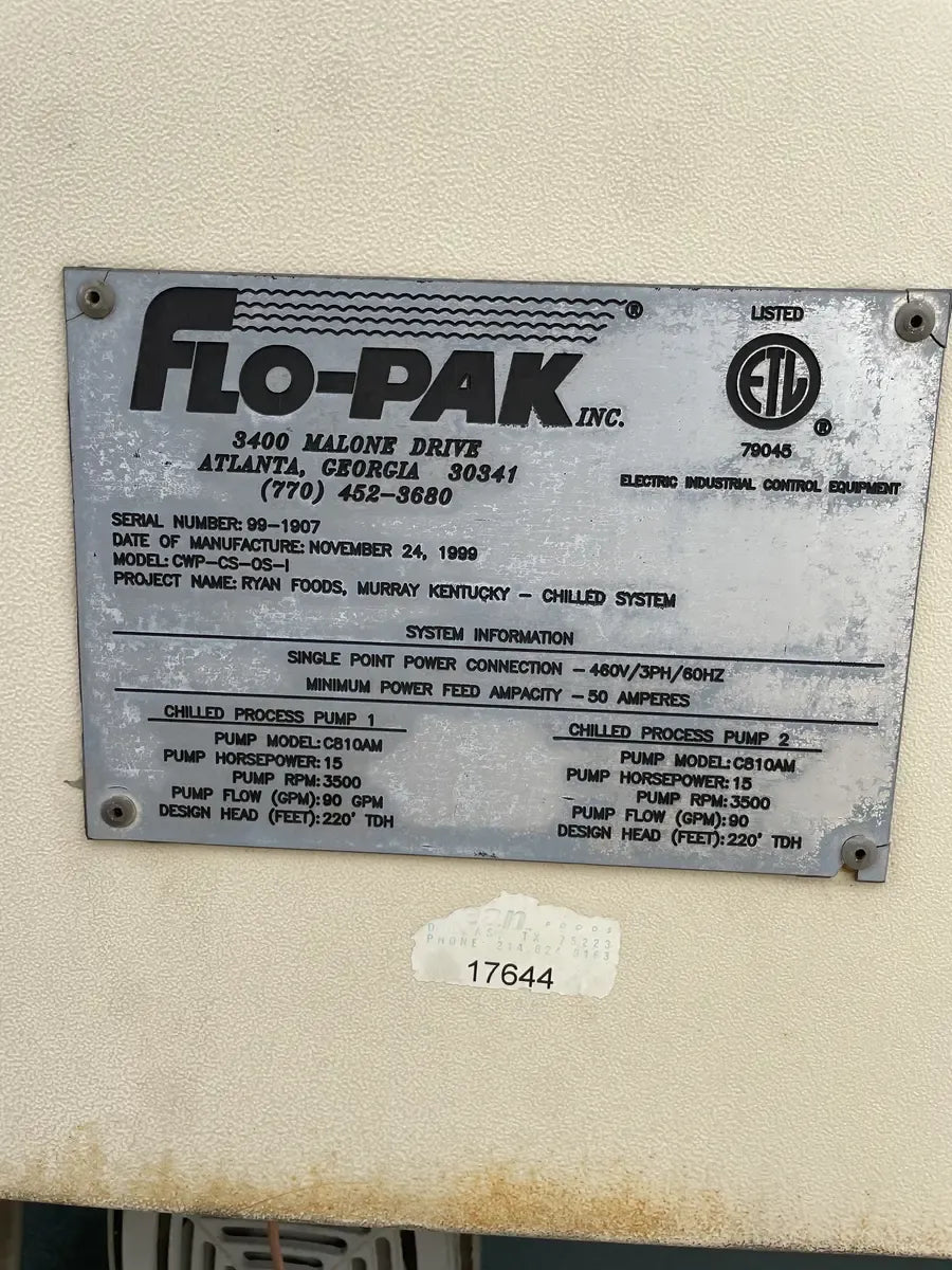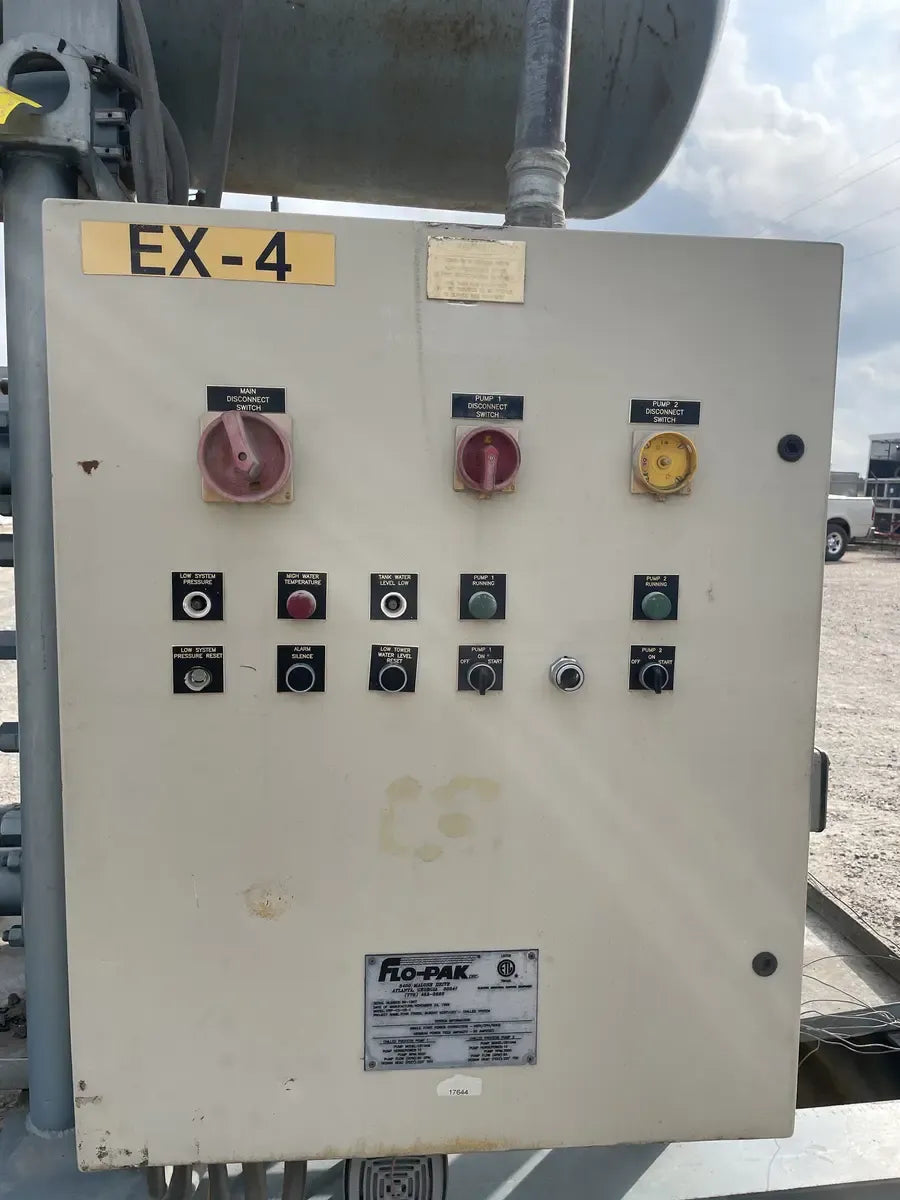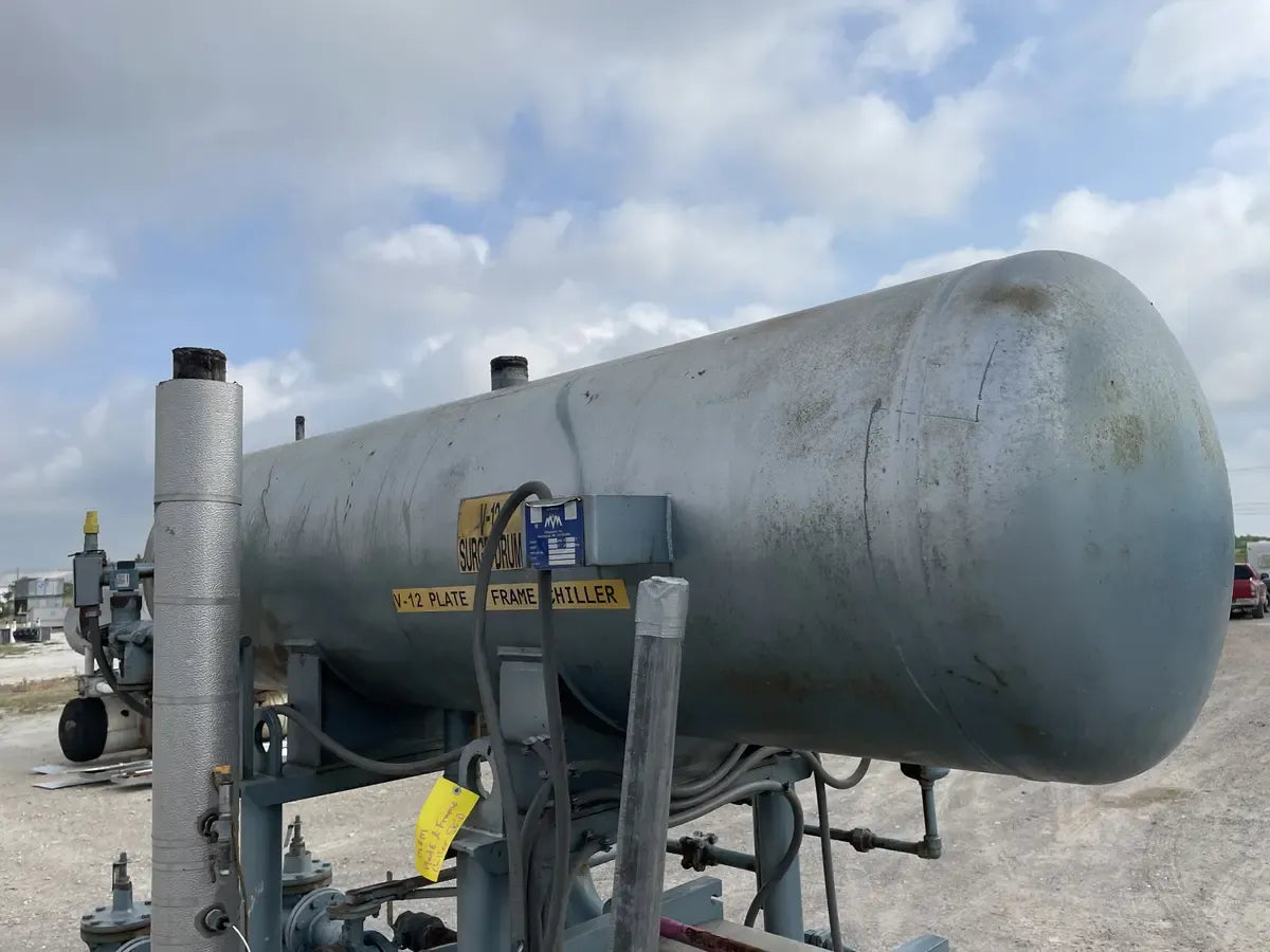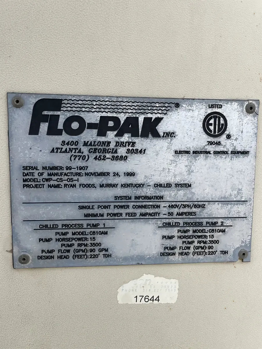1999 M&M Ammonia-Glycol Chilling System Skid. The Skid Comes in a whole Skid together with a control panel, (2) centrifugal pumps, Horizontal Ammonia Surge Drum, Alfa Laval Plate, Frame Heat Exchanger, and a Glycol Tank. Previously used at Ryan Foods, Murray Kentucky. Date Manufactured: November 24, 1999. Serial No: 99-1907. Model: CWP-CS-OS-I. System Information. Single Point Power Connection - 460V/3PH/60HZ. Minimum Power Feed Amp: 50 AMPS. Chilled Process Pump 1: Pump Model: C810AM, Pump Horsepower: 20, Pump RPM: 3500, Pump Flow (GPM): 90, Design Head(FT): 220. Chilled Process Pump 2: Pump Model: C810AM, Pump Horsepower: 20, Pump RPM: 3500, Pump Flow (GPM): 90, Design Head(FT): 220. Total sq.ft: 408.20. Alfa Laval Plate and Frame Heat Exchanger. Model: 10-BWFD, Serial No: 3011065821, Mfg Year: 2006. MAWP: 150/300 PSI @ 150 F. MDMT: 20 F @ 150/300 PSI. Area: 408.20 SQ. Ft. A-Dim: 482MM W/80. Sales Order: 634017. M&M Horizontal Ammonia Surge. National Board: 2662, Year Built: 2006. MAWP: 300 PSIG @ 200 F. MDMT: 0 F @ 300 PSIG. Mfr. Ser. No: 06A117.