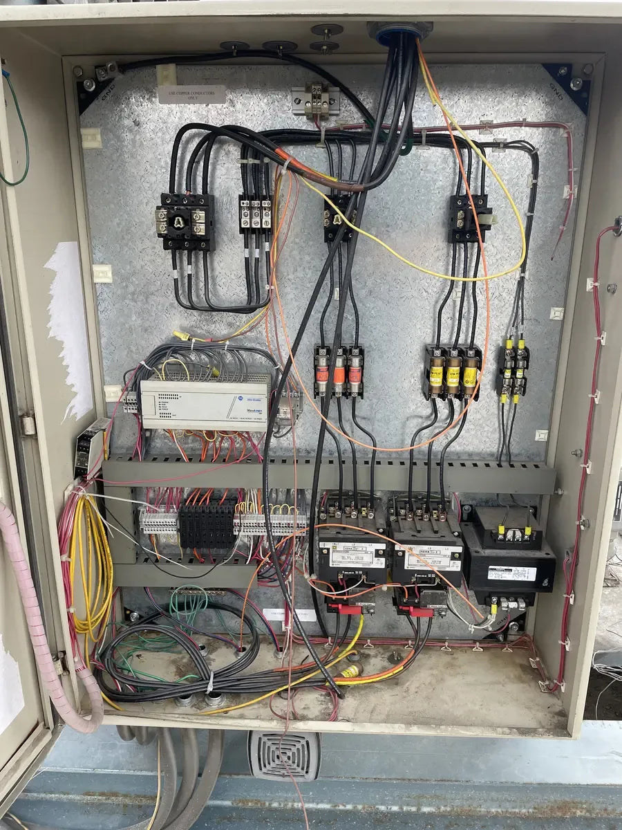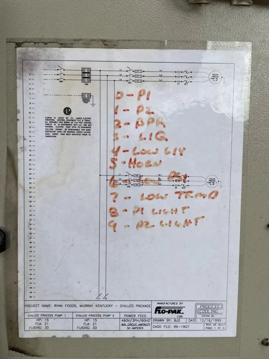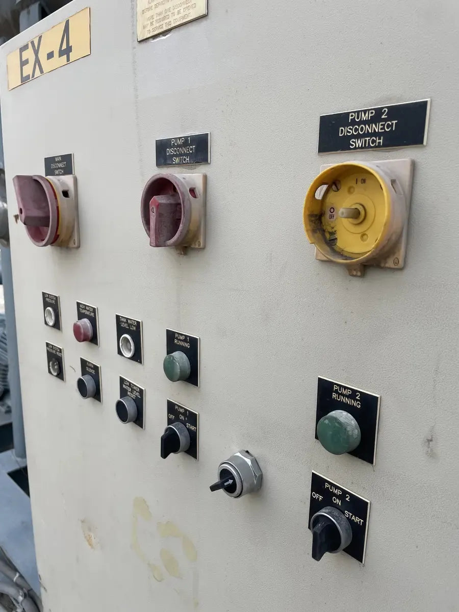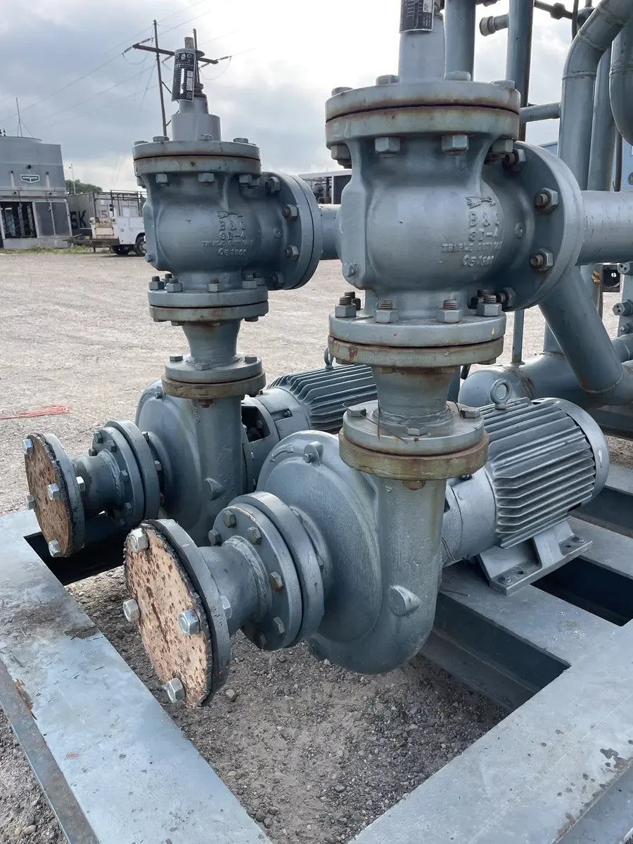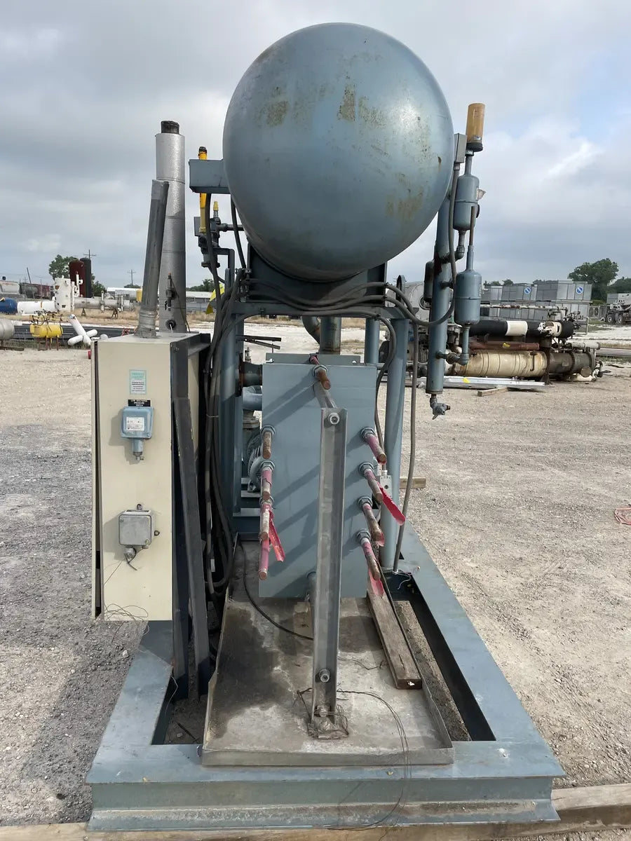 1999 M&M Ammonia-Glycol Chilling System Skid. The Skid Comes in a whole Skid together with a control panel, (2) centrifugal pumps, Horizontal Ammonia Surge Drum, Alfa Laval Plate, Frame Heat Exchanger, and a Glycol Tank. Previously used at Ryan Foods, Murray Kentucky. Date Manufactured: November 24, 1999. Serial No: 99-1907. Model: CWP-CS-OS-I. System Information. Single Point Power Connection - 460V/3PH/60HZ. Minimum Power Feed Amp: 50 AMPS. Chilled Process Pump 1: Pump Model: C810AM, Pump Horsepower: 20, Pump RPM: 3500, Pump Flow (GPM): 90, Design Head(FT): 220. Chilled Process Pump 2: Pump Model: C810AM, Pump Horsepower: 20, Pump RPM: 3500, Pump Flow (GPM): 90, Design Head(FT): 220. Total sq.ft: 408.20. Alfa Laval Plate and Frame Heat Exchanger. Model: 10-BWFD, Serial No: 3011065821, Mfg Year: 2006. MAWP: 150/300 PSI @ 150 F. MDMT: 20 F @ 150/300 PSI. Area: 408.20 SQ. Ft. A-Dim: 482MM W/80. Sales Order: 634017. M&M Horizontal Ammonia Surge. National Board: 2662, Year Built: 2006. MAWP: 300 PSIG @ 200 F. MDMT: 0 F @ 300 PSIG. Mfr. Ser. No: 06A117.