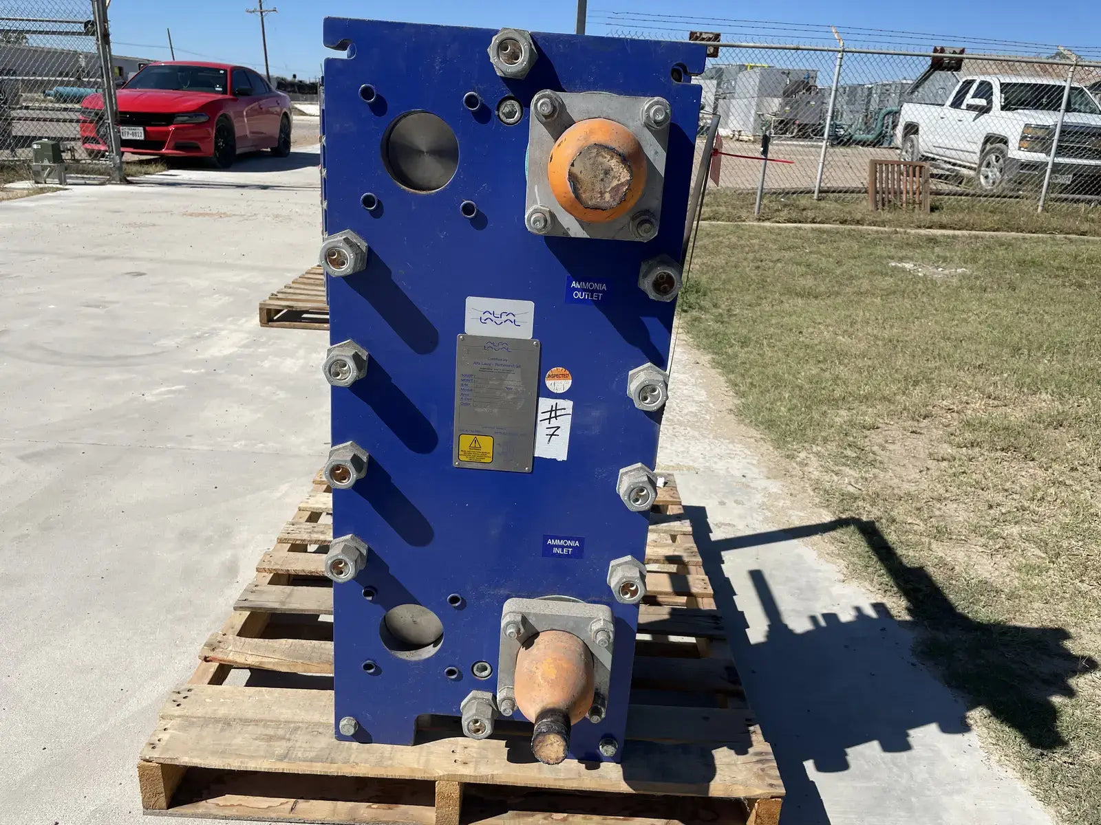 Certified by Alfa Laval Plate Heat Exchanger. Model: M10-BWFD. Serial No: 30115-70308. Order No: 1809053. P.O: 2040A-15349. MAWP: 200/300 PSI @ 200 F. MDMT: -20 F @ 200/300 PSI. Area: 46.6 Sq.Ft. Year Built: 2013.