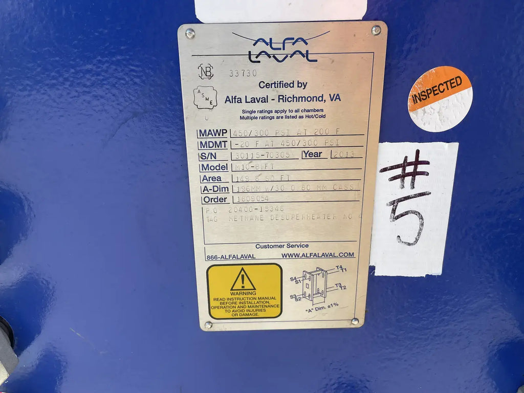 Certified by Alfa Laval Plate Heat Exchanger. Model: M10-BWFD. Serial No: 30115-69297. Order No: 1809054. P.O: 2040G-15348. MAWP: 450/300 PSI @ 200 F. MDMT: -20 F @ 450/300 PSI. Area: 118.8 Sq.Ft. Year Built: 2013.