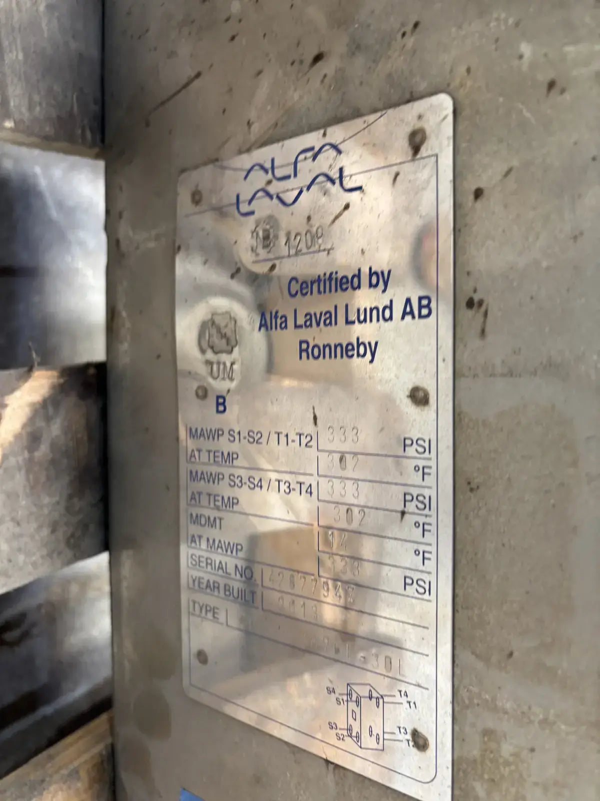 Alfa Laval SS AlfaNova Fusion-Bonded Plate Heat Exchanger. Type: AlfaNova 76L-30L. Serial No: 42877947. National Board: 1208. MAWP S1-S2/ T1-T2 @ Temp: 333 PSI @ 302 F. MAWP S3-S4/ T3-T4 @ Temp: 333 PSI @ 302 F. Year Built: 2013