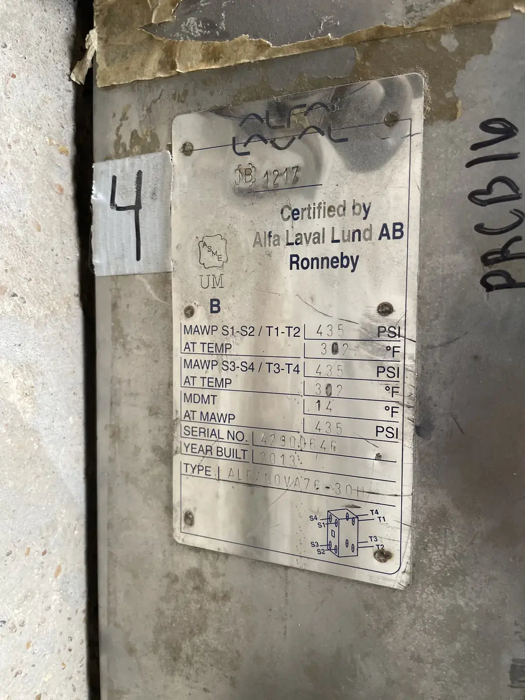 Alfa Laval SS AlfaNova Fusion-Bonded Plate Heat Exchanger. Type: AlfaNova 76-30H. Serial No: 42900646. National Board: 1217. MAWP S1-S2/ T1-T2 @ Temp: 435 PSI @ 302 F. MAWP S3-S4/ T3-T4 @ Temp: 435 PSI @ 302 F. Year Built: 2013