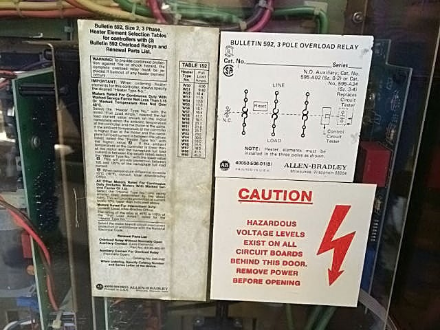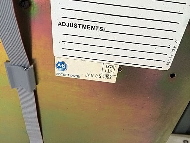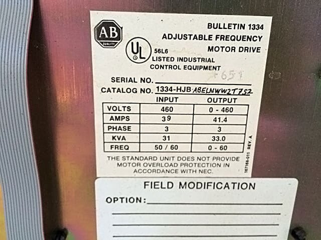 Allen-Bradley Adjustable Frequency Motor Drive- 30 HP. Bulletin 1334 UL listed 56L6, S/N: F651, catalog: 1334-HJBABELNWW2T752. Input: 460V, 39 amps, 3-phase, 31 KVA, 50/60 HZ. Output: 0-460V, 41.4 amps, 3-phase, 33 KVA, 0-60 Hz. Date: Jan 05 1987. Note: enclosure suitable for type 12 applications unless option G is installed, in which case the enclosure is only suitable for type 1 applications. Overall dimensions: 38 in. wide x 18 in. deep x 72 in. High.