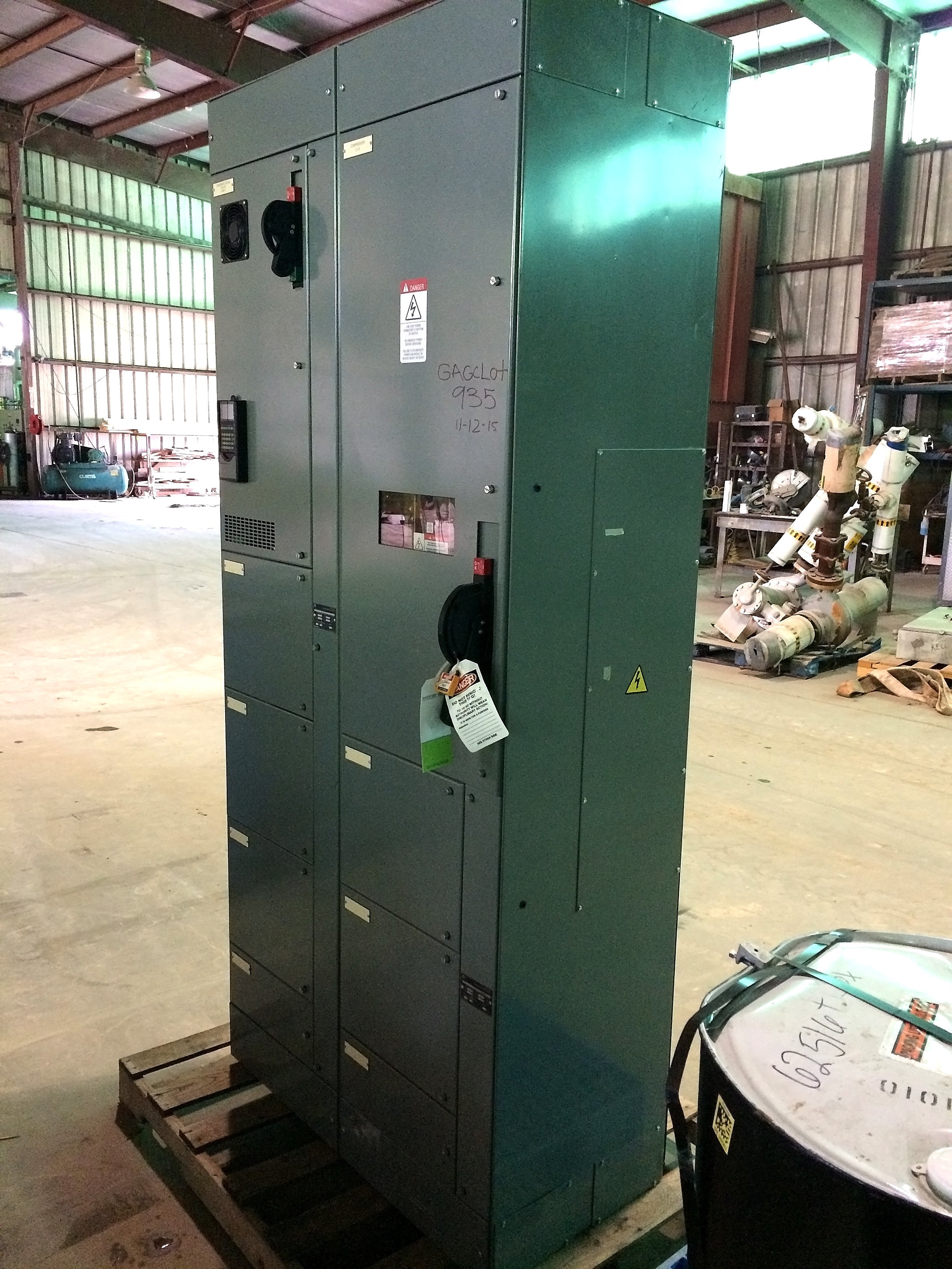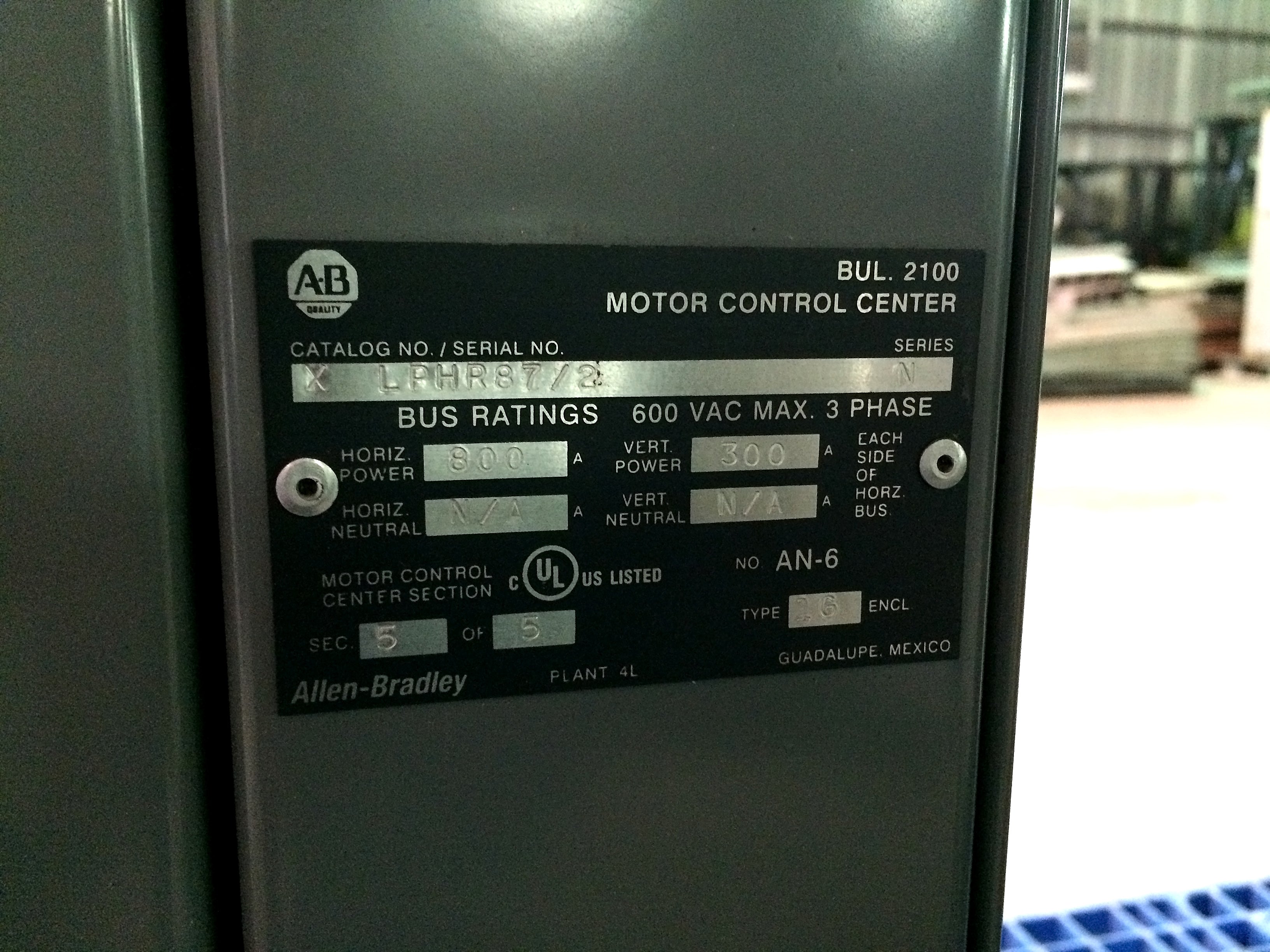 Allen Bradley Centerline 2100 MCC Control Panel. Disconnect for 250 HP screw compressor motor and VFD for condenser fan motor. Motor Control Center LPHR87/2, series N, 800 amp, horizontal, 300 amp vertical, type 1G enclosure. Weight: 710 lbs.
