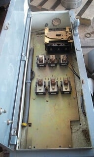 Disconnect Box, Allen-Bradley. Max Ratings (3 phase): 200 volt - 75 hp. 230 volt - 100 hp, 460 - 575 volt - 200 hp. Sz. 5, Cat No. 712-FACD26 P. Overall dimensions: 16 in. W, 20 in. L, 56 in. H.